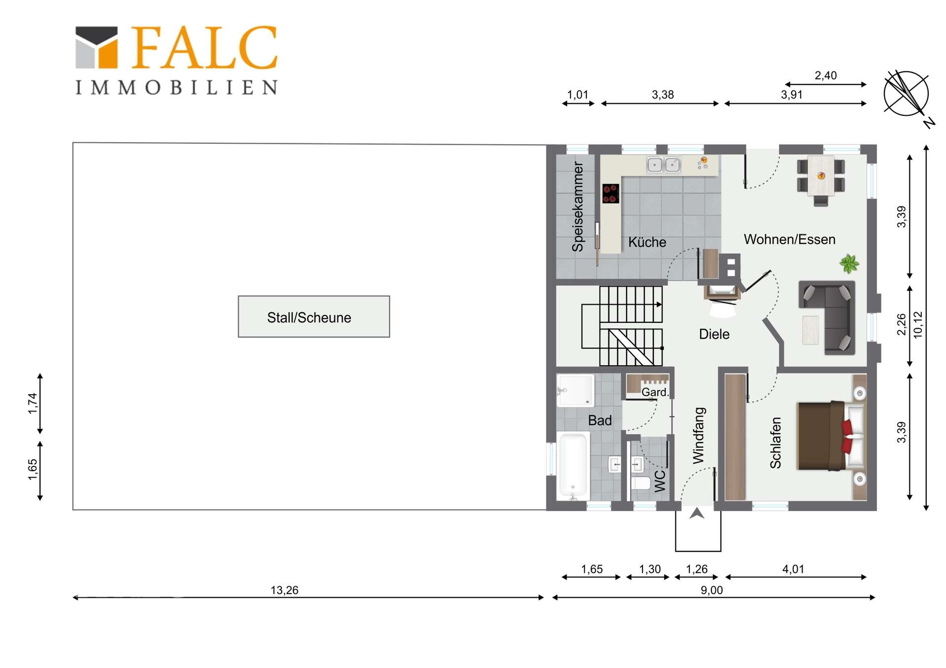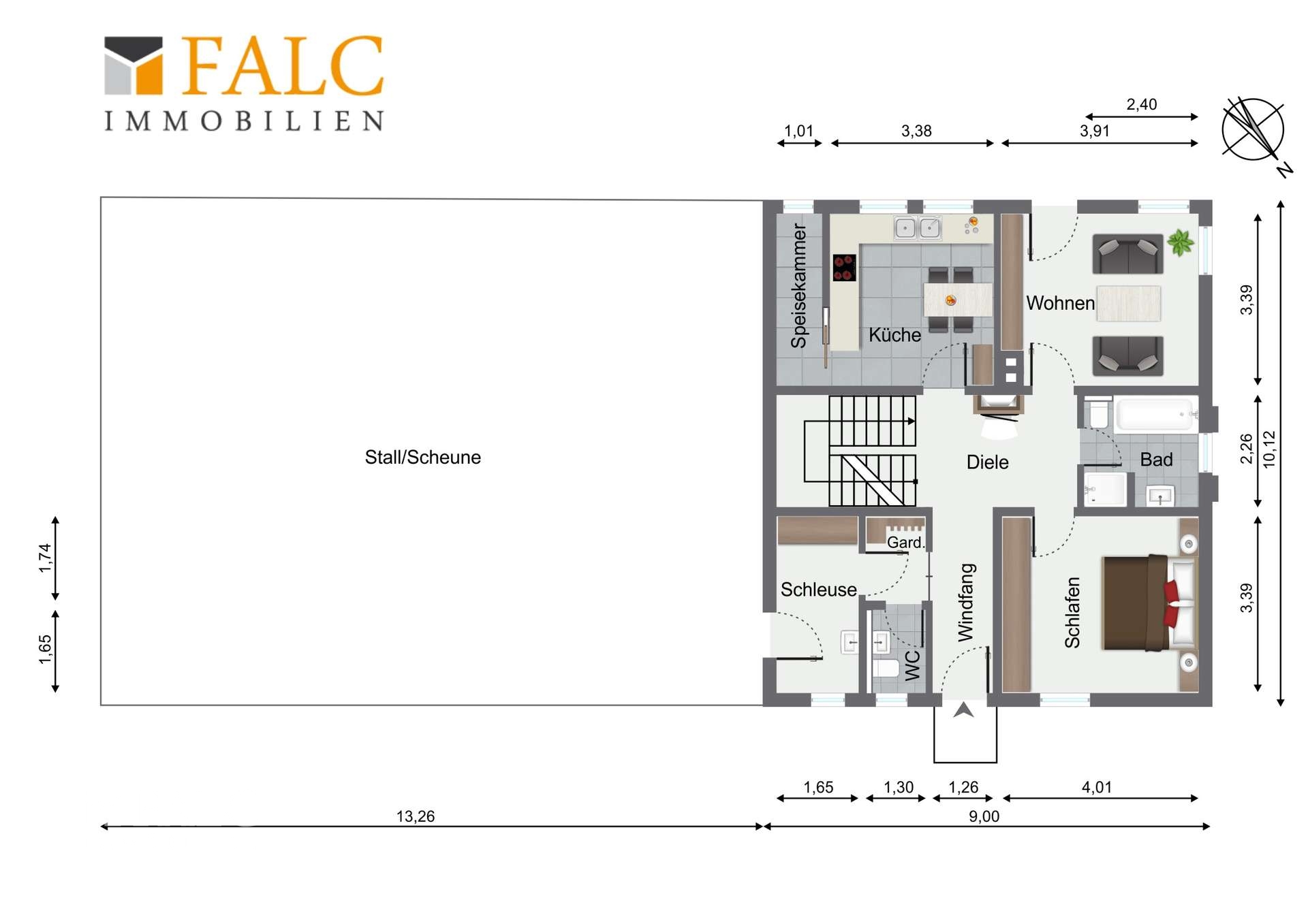 *Erdgeschoss (ca. 67 m² Wohnfläche) - Wohnzimmer mit Kachelofen und Zugang zur Terrasse - Schlafzimmer - Bad mit Badewanne, Dusche und WC - Aktuell abgeschlossener Küchenbereich - Speisekammer - Dielenbereich mit Garderobe (Befeuerung Kachelofen) - Gäste-WC - Schleuse zum Stall und zur Scheune Um einen erweiterten und offenen Wohn-Essbereich zu gestalten, kann die Trennwand zwischen Küche und Wohnzimmer entfernt werden. Weiterhin könnte das aktuelle Bad in den Schleusenbereich verschoben werden. Somit würde ein noch großzügigerer Wohn-Essbereich entstehen. Siehe Grundrissbeispiel (EG Neuaufteilung)