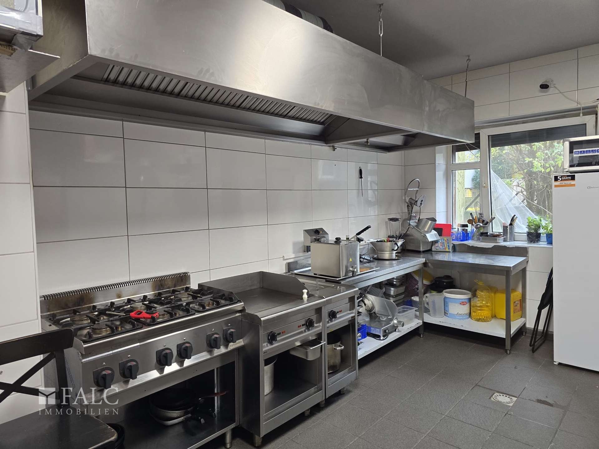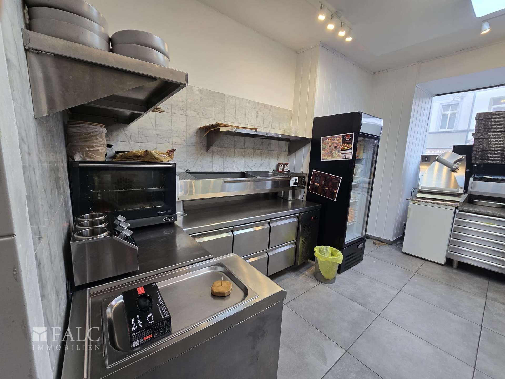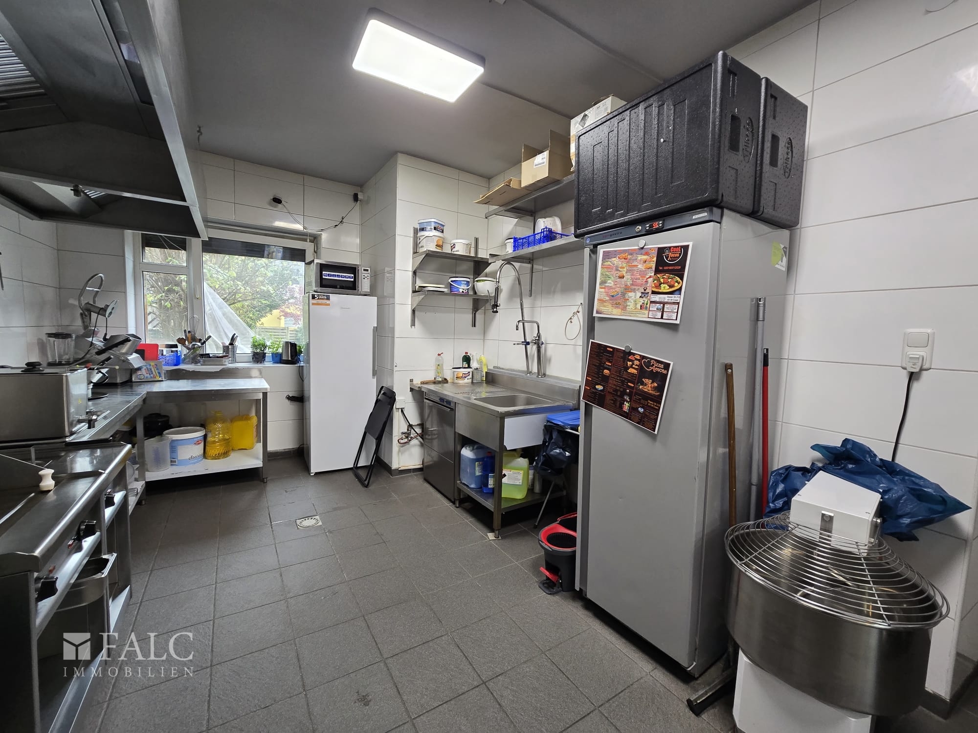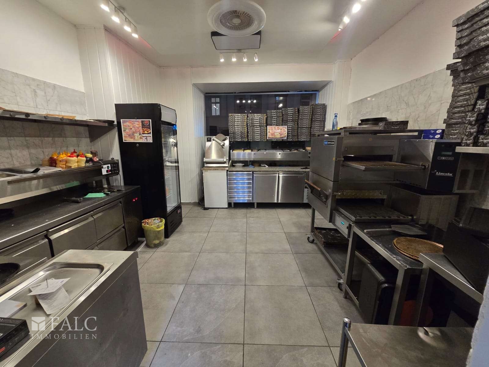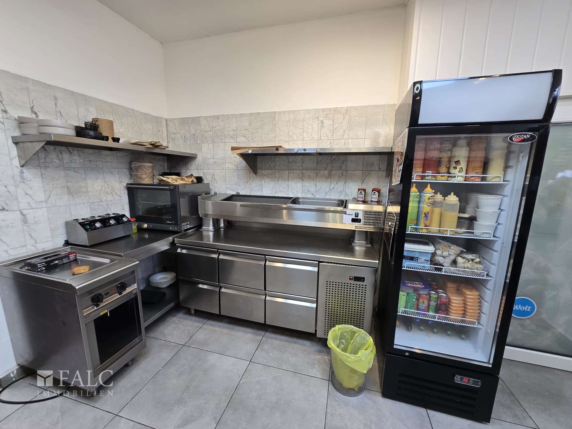 Zum Verkauf stehen zwei nebeneinanderliegende Ladenlokale an der Steeler Straße in Essen, jeweils ca. 50 m² groß. Eines der Lokale ist als moderne Küche mit vollständiger Ausstattung eingerichtet, das andere dient als Gastraum.