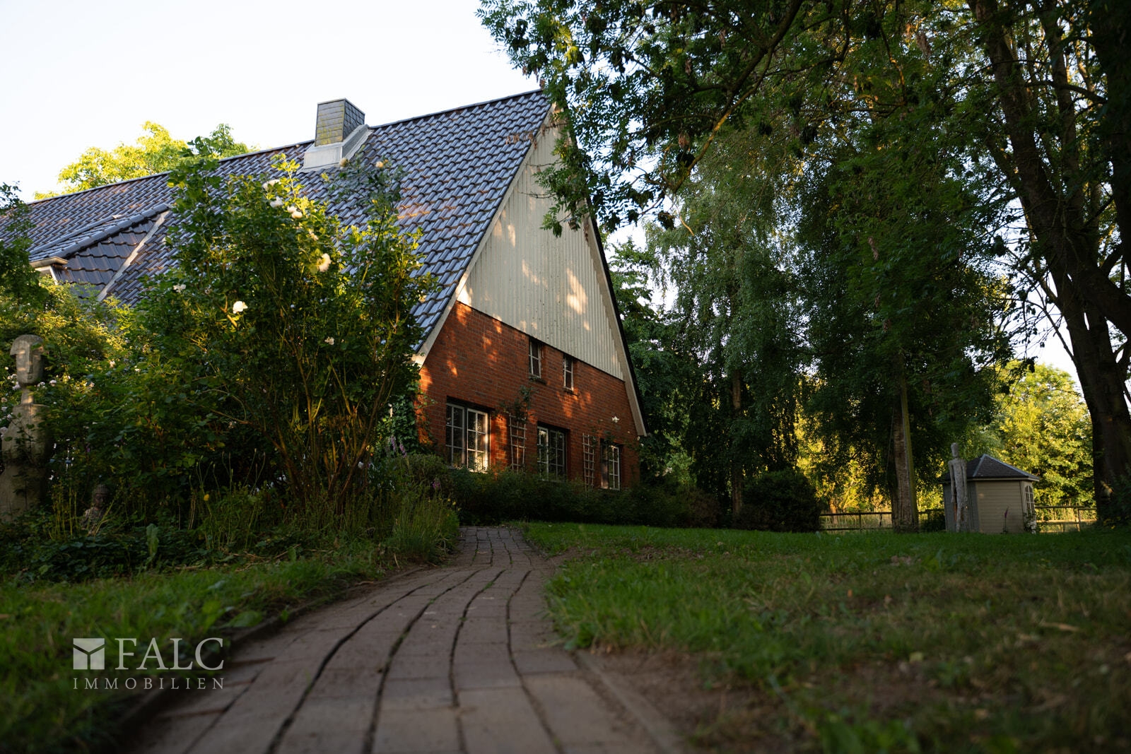 Der Außenbereich besticht durch viele kleine lauschige Ecken mit wunderschönen Kunstobjekten. Der großzügige Garten ist liebevoll angelegt und bietet mehrere Sitzplätze und Terrassen. Besonders ins Auge fallen der zauberhafte Rosengarten vor dem Haus, der großzügige Baumbestand und der Blumenring um den Gartenpavillon.
