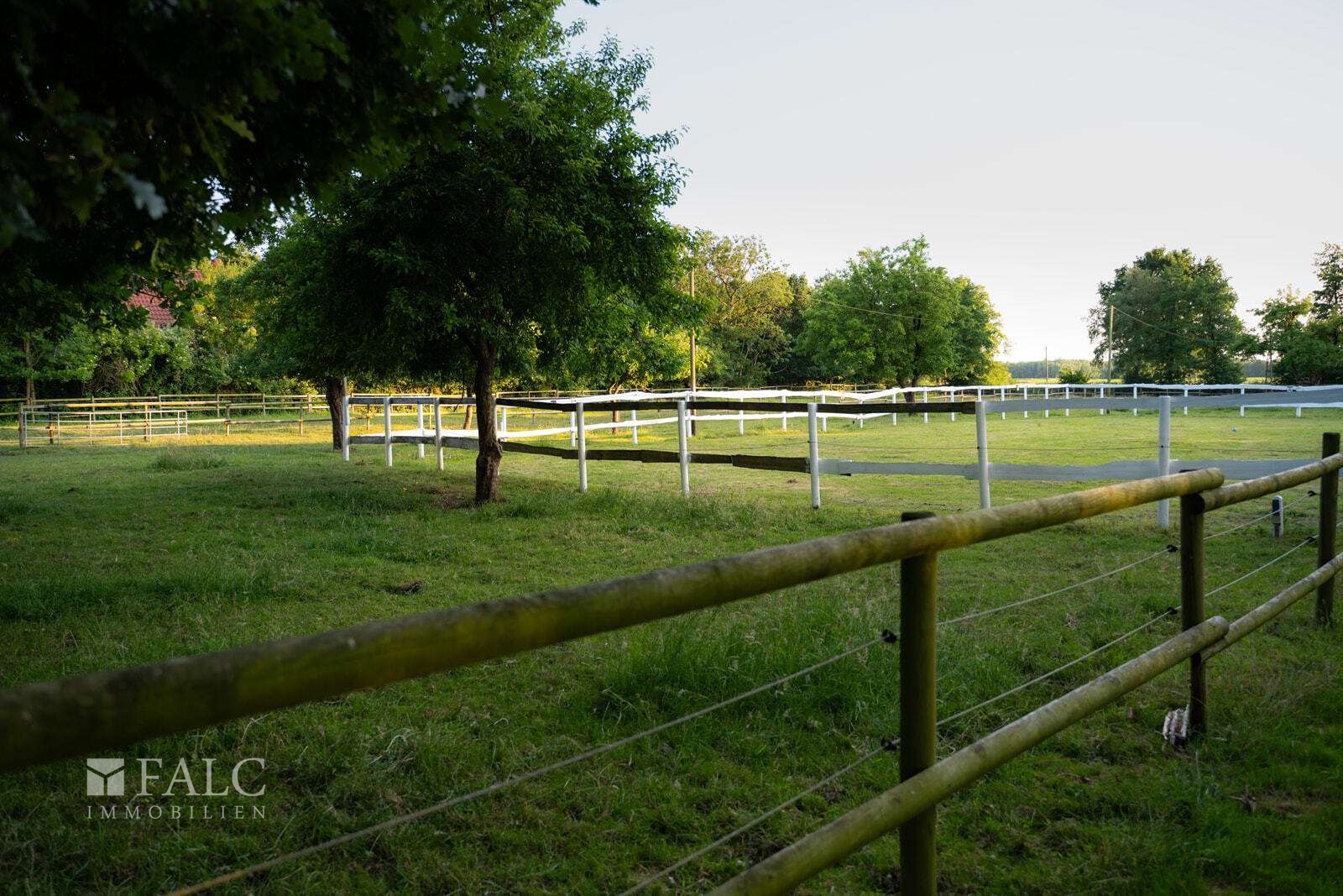 - Pferdestall (aus 2013): drei Abfohl-Boxen mit Fenster, Zwei Pferdeboxen mit Fenster, beheizte Tränken, Stroh- und Heuboden im OG, Anbinde-Platz vor dem Stall, große Doppeltür, renoviert in 2024/2025 - Winterpaddock (aus 2013): befestigter Untergrund mit Vlies, Unterstand für vier Pferde, Wassertränke, elektrische Zuleitung für Zaun, neue Holz-Zäune, Zugänge zu Weiden, voller Elektrozaun 2-reihig - Reitplatz (aus 2013): mit Unterbau/Drainage, mit Holz umzäunt - Kleine Weide mit Holzzaun, vollem Elektrozaun 2-reihig, Tränken, Zugang zum Winterpaddock - Lange Weide mit Holzzaun, vollem Elektrozaun 2-reihig, Tränken, Zugang zum Winterpaddock - Obst-Weide mit Holzzaun, vollem Elektrozaun 2-reihig, Tränken, Zugang zur langen Weide und zum Reitplatz - Die nächste Reithalle lässt sich bequem zu Pferd in ca. 15 Minuten direkt vom Grundstück aus erreichen.
