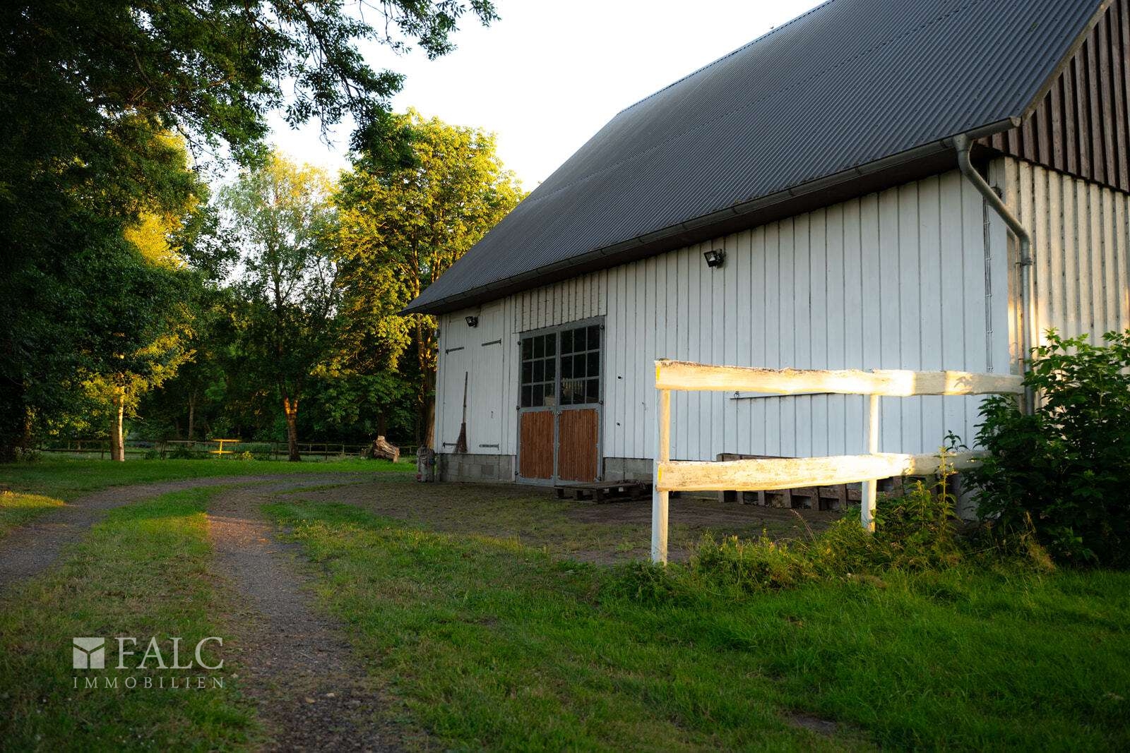 Besonders hervorzuheben ist das neuwertige Stallgebäude auf dem Hof, das mit seinen fünf Boxen viel Platz für Pferde bietet. Gegenüber befindet sich ein Paddock mit massivem Unterstand. Die angrenzenden Weiden sind mit einem Holzzaun und Elektrolitze umgeben. Der ca. 20 x 40 m große Reitplatz mit fachgerechtem Unterbau lässt die Herzen eines jeden Pferdebesitzers höherschlagen. Sie können ihn auch sehr gut zum Longieren oder als Winterauslauf nutzen. Heu und Stroh können praktischerweise auf dem Boden des Pferdestalls gelagert werden. Die nächste Reithalle lässt sich bequem zu Pferd in ca. 15 Minuten direkt vom Grundstück aus erreichen.