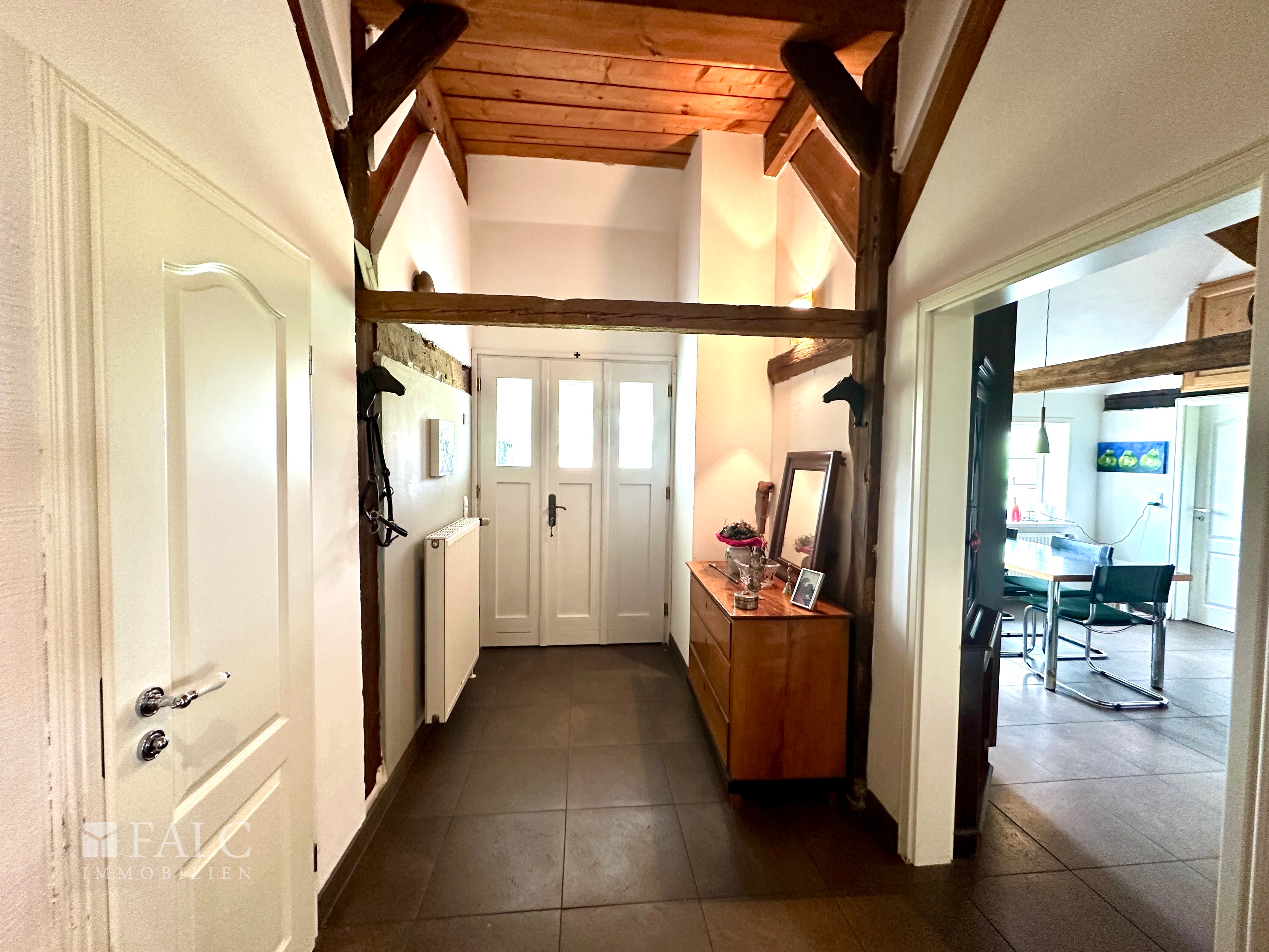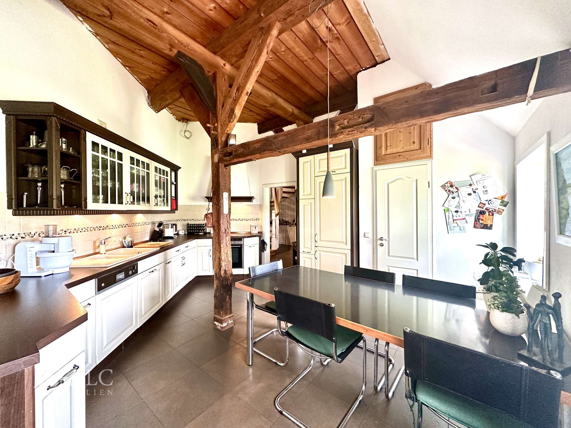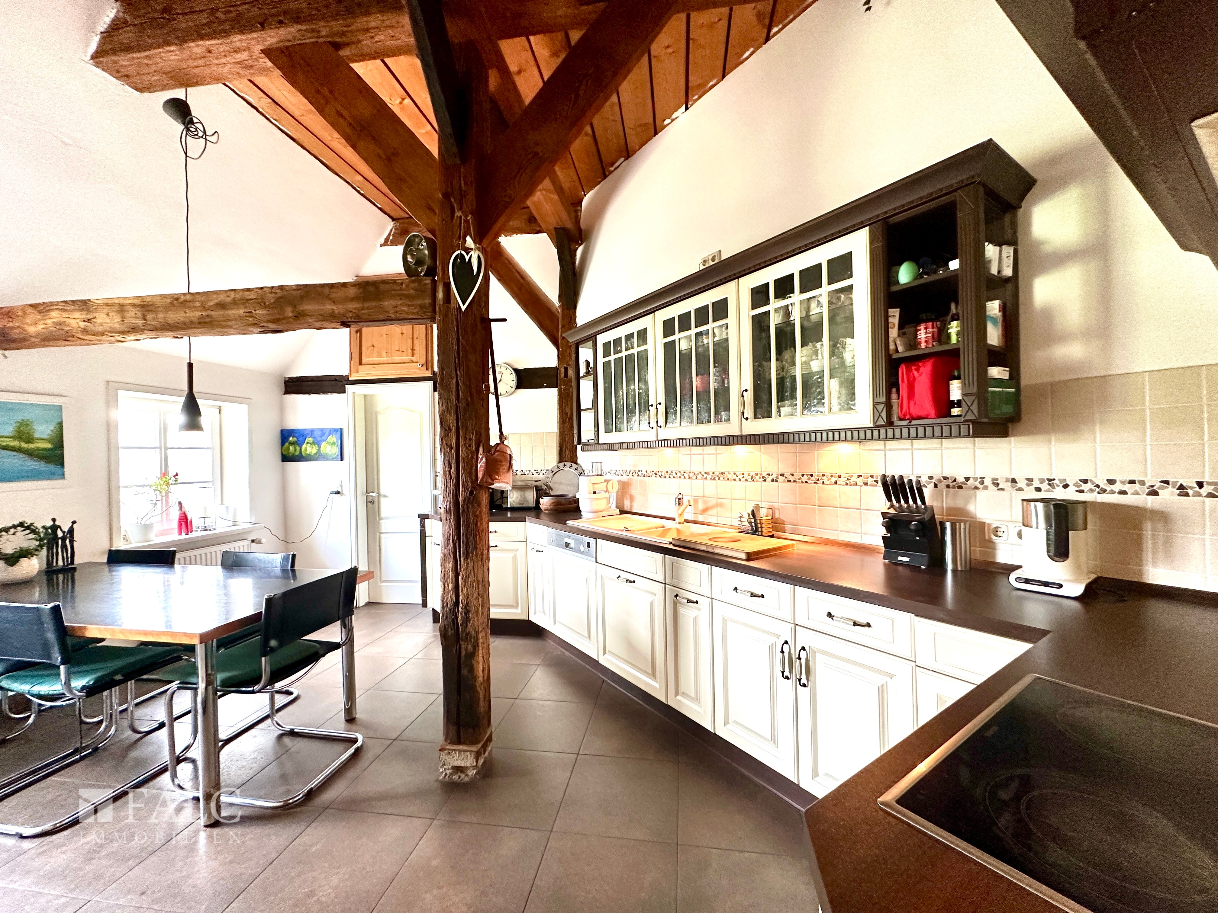 Die "Hauptwohnung" lädt mit ihrer besonders gemütlichen Atmosphäre zum Verweilen ein. Viele eingearbeitete Eichen-Balken/sichtbare Holzkonstruktionen, akzentuierte Beleuchtung und die hohen Decken sorgen für ein einzigartiges Ambiente. Hier paart sich der Charme eines alten Hauses mit einer modernen Ausstattung. Der wunderschöne offene Wohn- und Essbereich mit seinem verglasten Dielentor und einem historischen Kachelofen, der nicht nur für ein phantastisches Raumklima sorgt, sondern auch die Heizkosten erheblich reduziert, bildet das Herzstück des Erdgeschosses. Die funktionale Einbauküche im Landhausstil ist komplett ausgestattet und kann auch als Esszimmer genutzt werden. Der angrenzende Abstell-/Vorratsraum bietet Platz für Essensvorräte und weiteres. Der von der Küche zugängliche Hauswirtschaftsraum dient auch als praktischen Nebeneingang. Ein Gäste-/Arbeitszimmer, sowie ein Gäste-WC runden das Platzangebot im Erdgeschoss ab und bietet einen großartigen Rückzugsbereich.