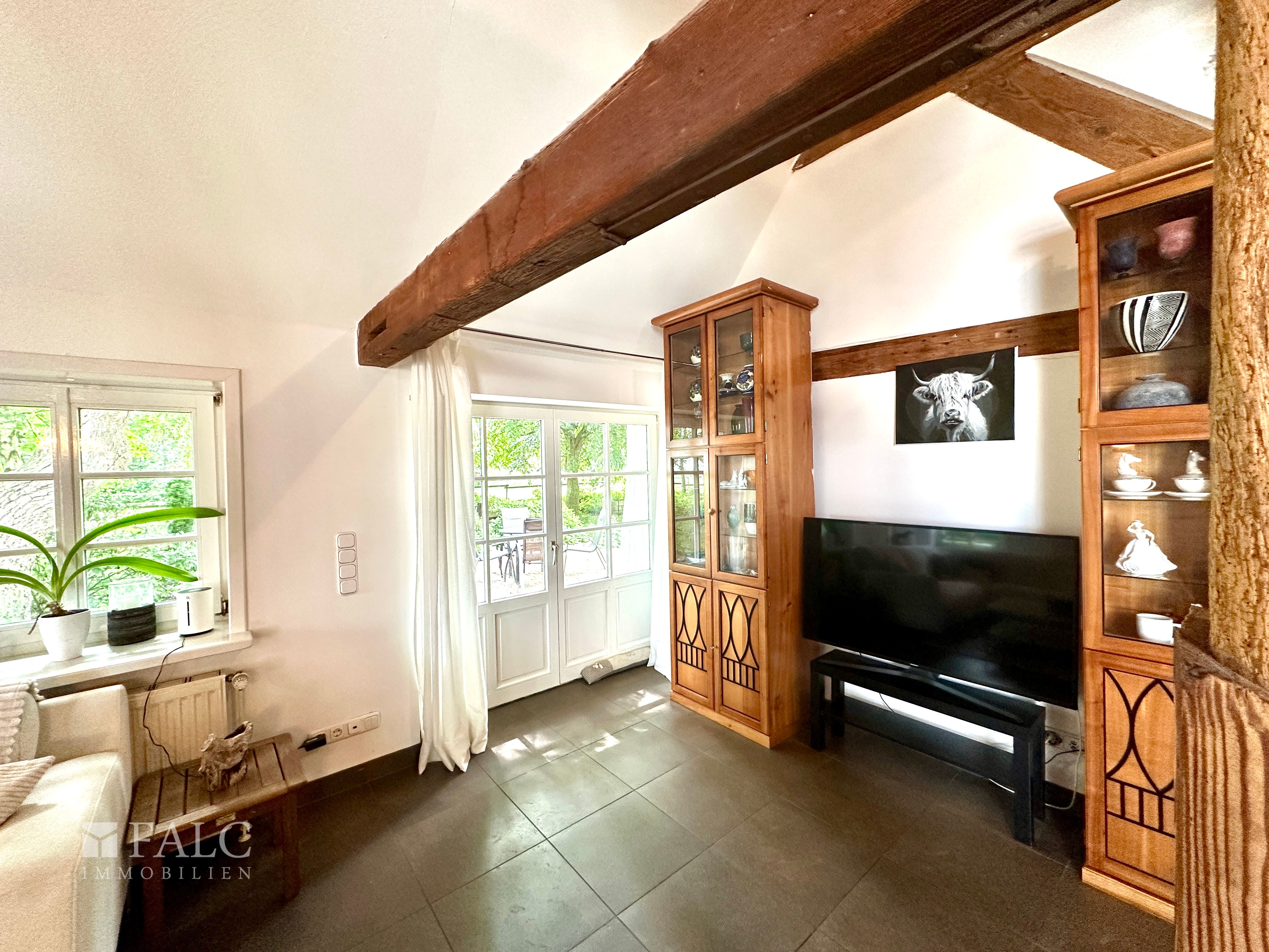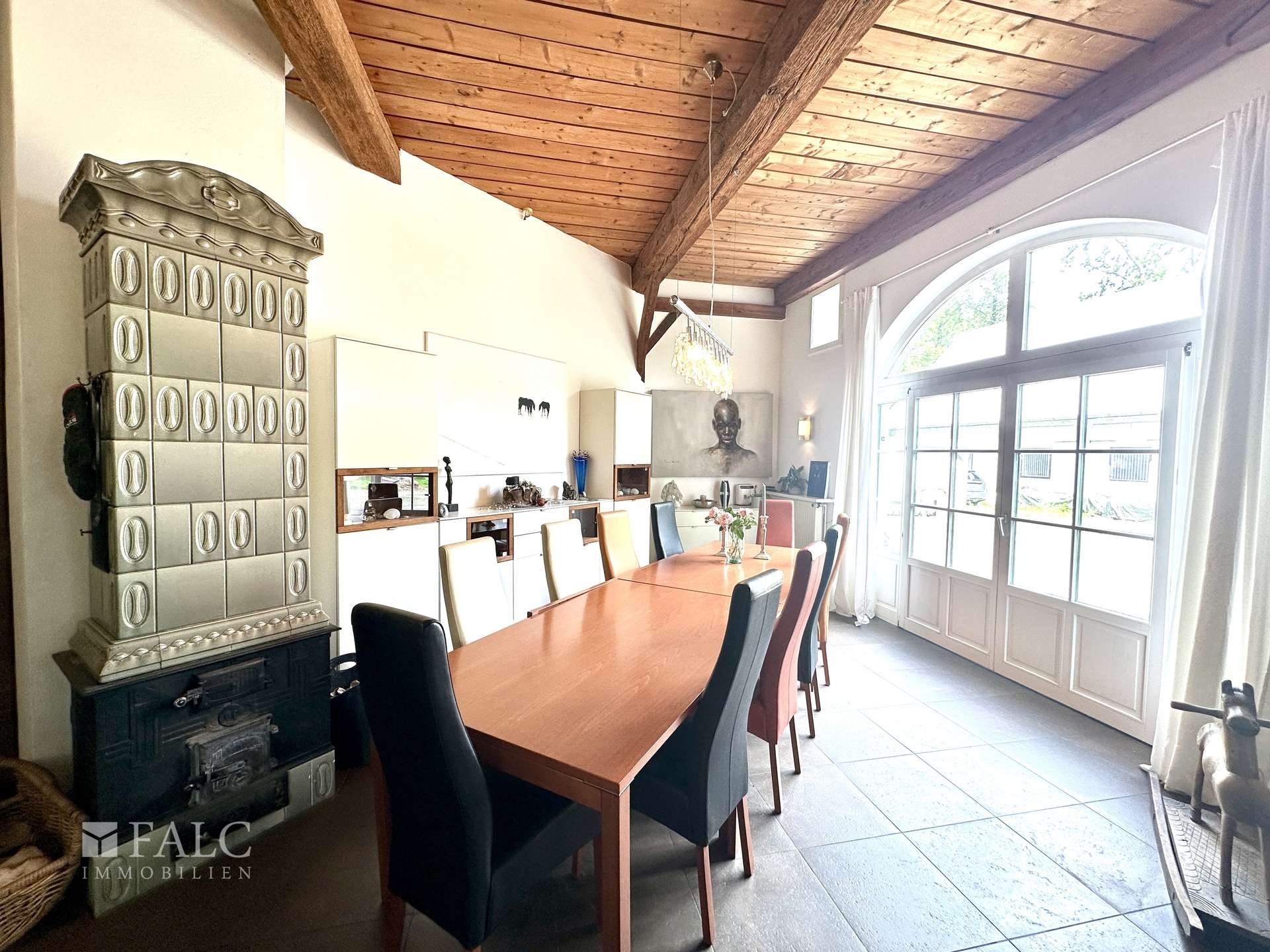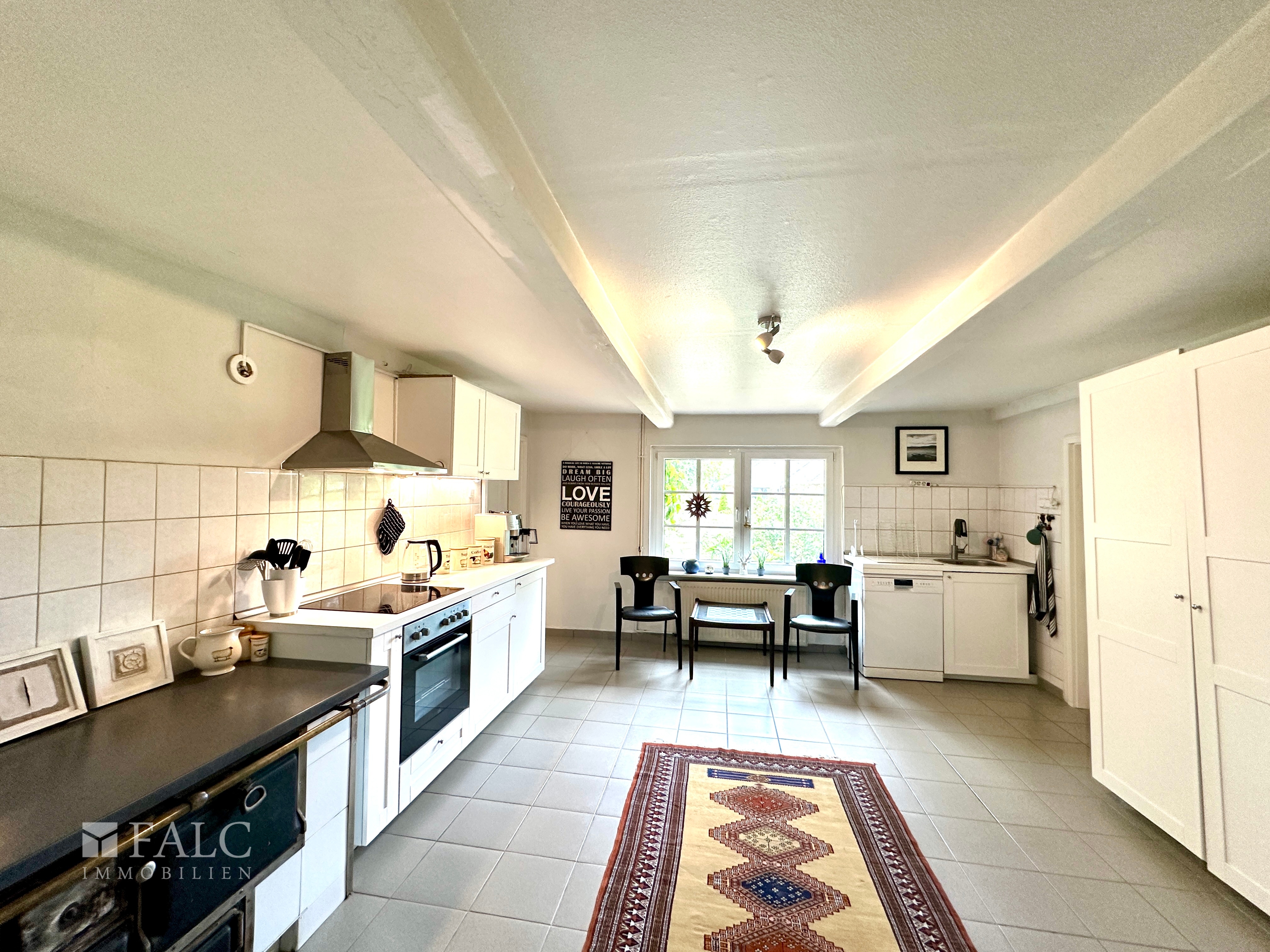 Die "Hauptwohnung" lädt mit ihrer besonders gemütlichen Atmosphäre zum Verweilen ein. Viele eingearbeitete Eichen-Balken/sichtbare Holzkonstruktionen, akzentuierte Beleuchtung und die hohen Decken sorgen für ein einzigartiges Ambiente. Hier paart sich der Charme eines alten Hauses mit einer modernen Ausstattung. Der wunderschöne offene Wohn- und Essbereich mit seinem verglasten Dielentor und einem historischen Kachelofen, der nicht nur für ein phantastisches Raumklima sorgt, sondern auch die Heizkosten erheblich reduziert, bildet das Herzstück des Erdgeschosses. Die funktionale Einbauküche im Landhausstil ist komplett ausgestattet und kann auch als Esszimmer genutzt werden. Der angrenzende Abstell-/Vorratsraum bietet Platz für Essensvorräte und weiteres. Der von der Küche zugängliche Hauswirtschaftsraum dient auch als praktischen Nebeneingang. Ein Gäste-/Arbeitszimmer, sowie ein Gäste-WC runden das Platzangebot im Erdgeschoss ab und bietet einen großartigen Rückzugsbereich.