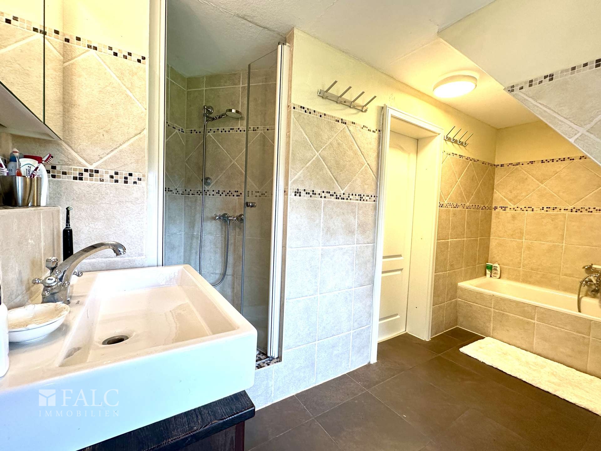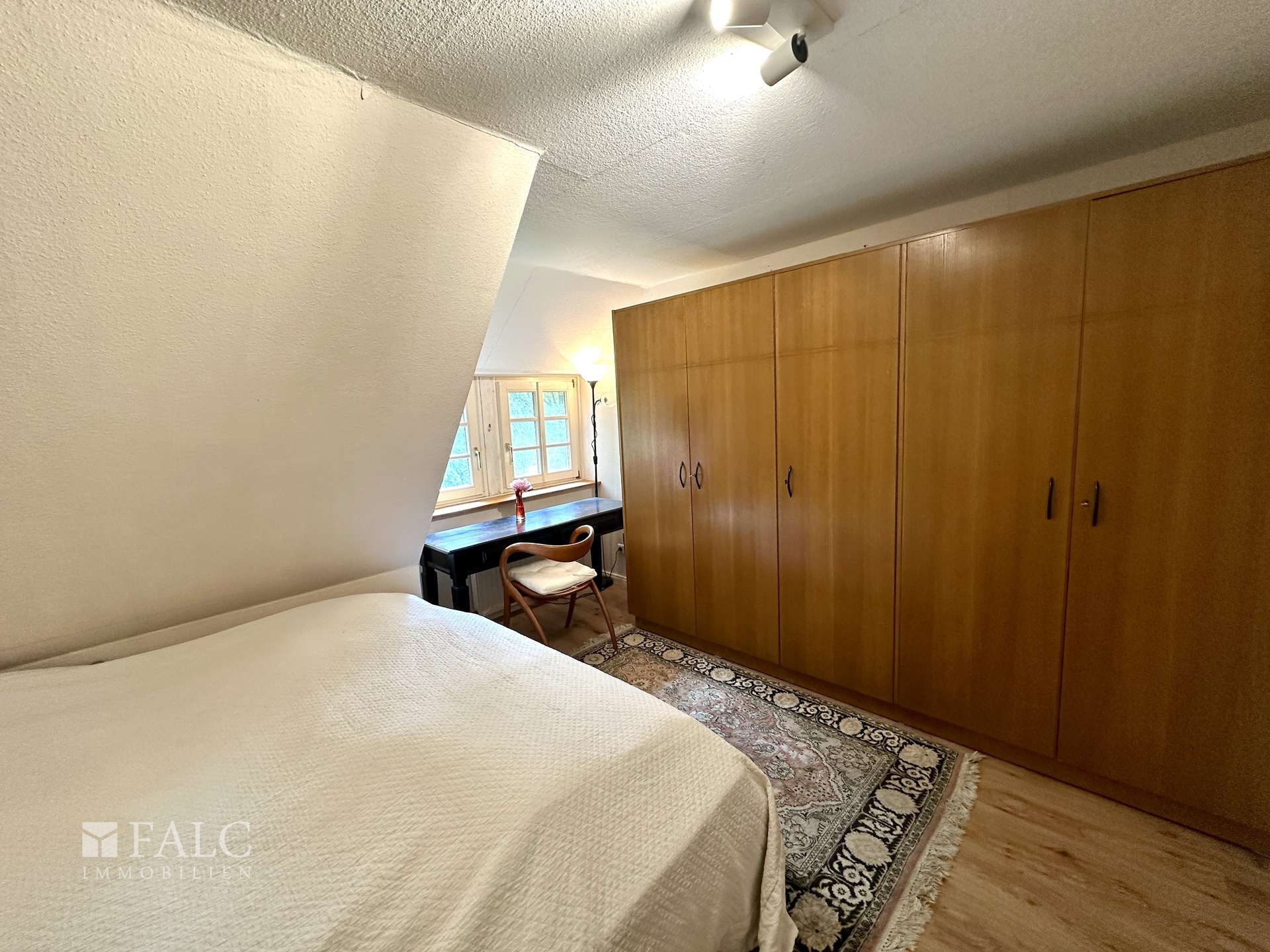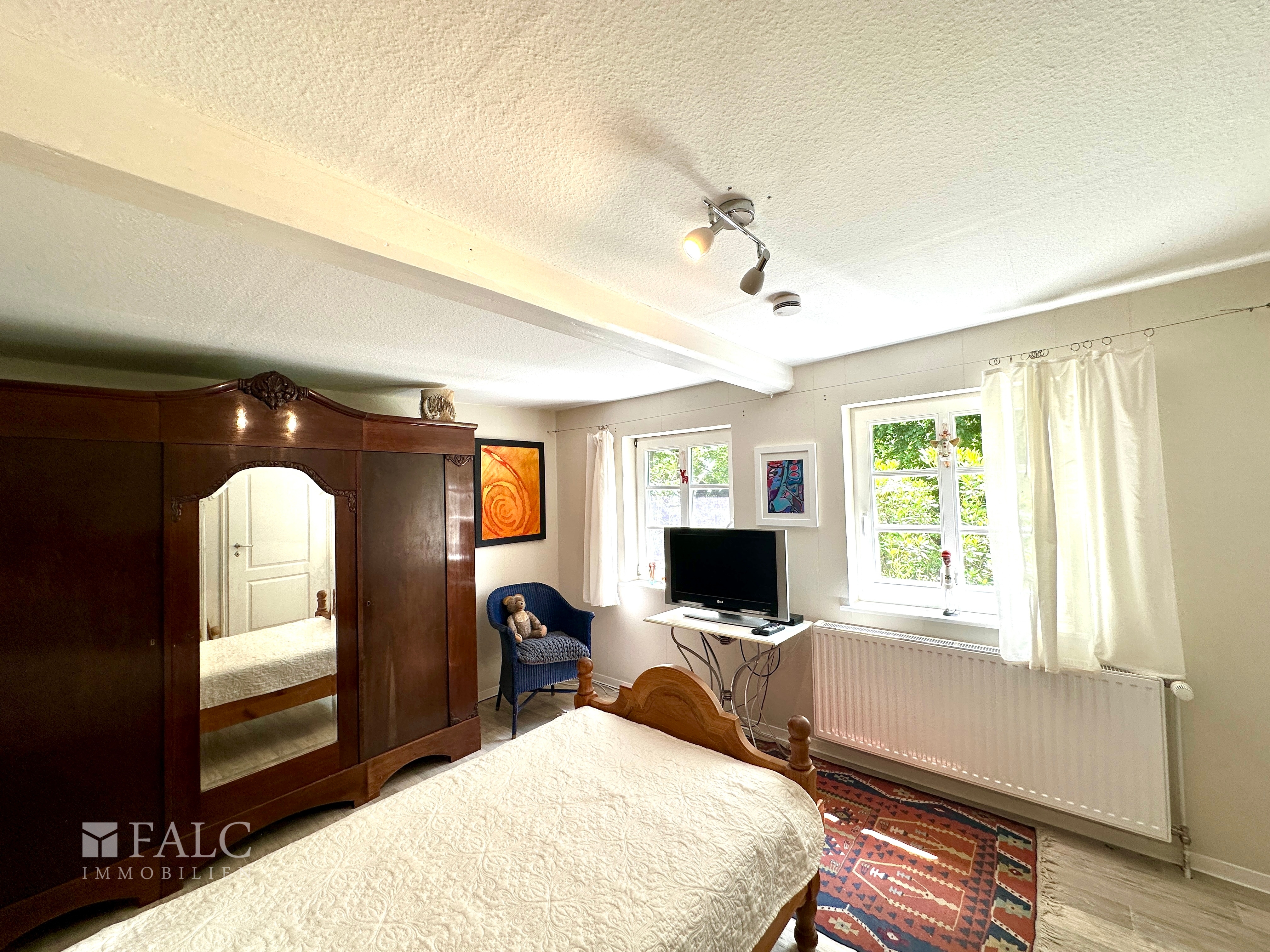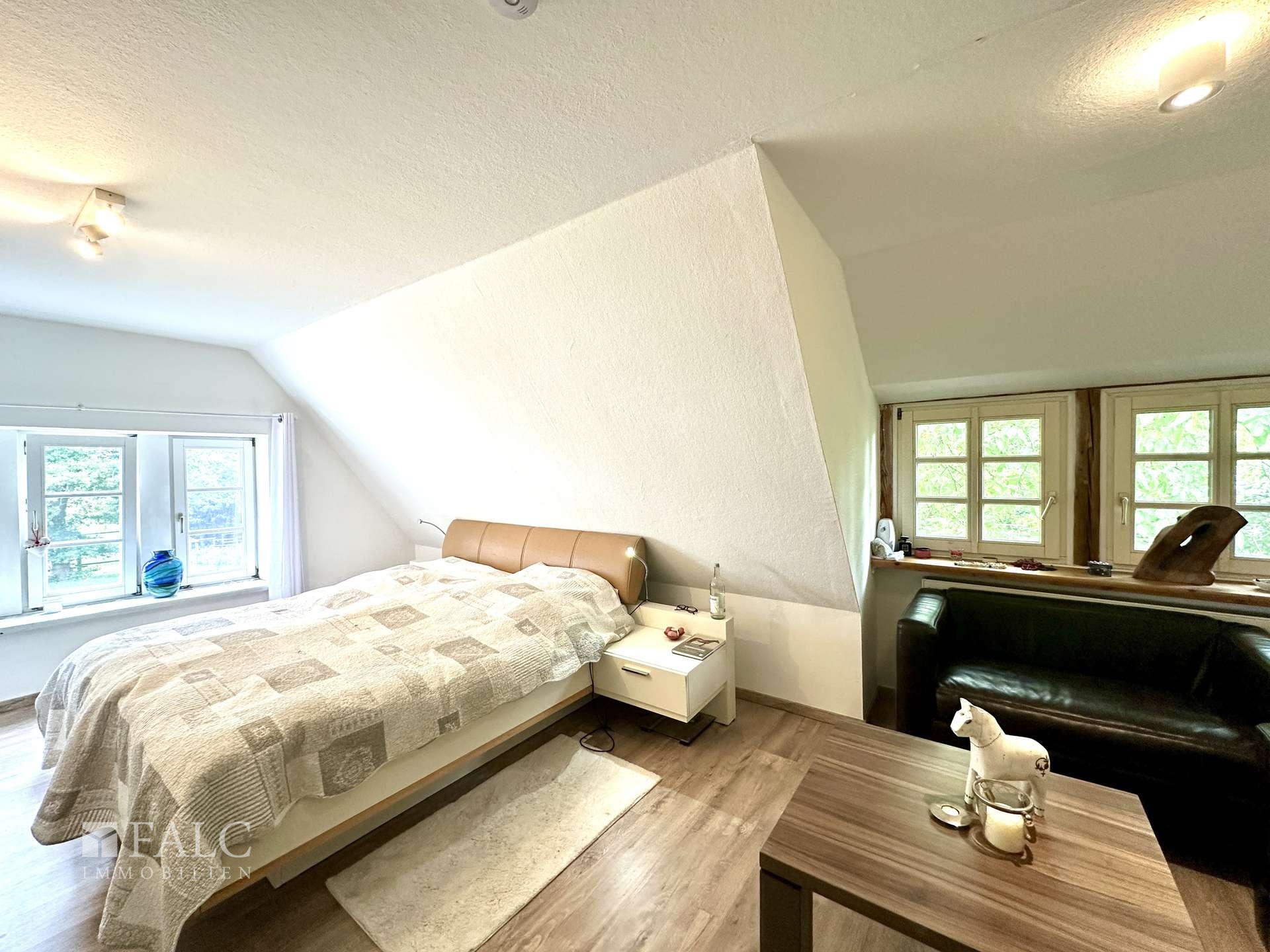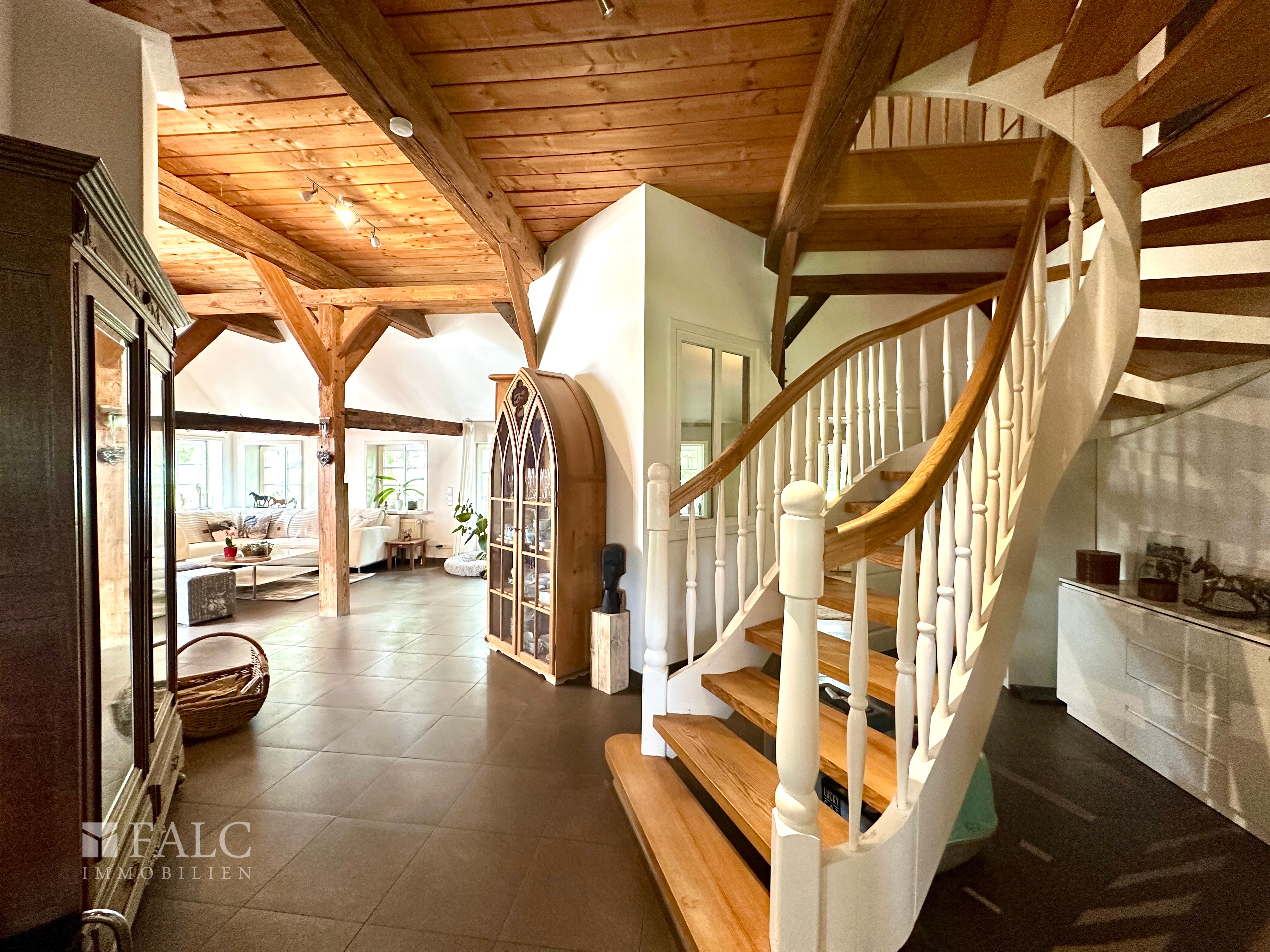 Über eine außergewöhnliche handgearbeitete Holztreppe erreicht man das geräumige Obergeschoss mit einer wohnlichen Diele, die als Arbeits- oder als Spielbereich für Kinder genutzt werden kann. Die vier Zimmer im OG können als Schlaf-, Kinder-, Gäste- oder Arbeitszimmer individuell gestaltet werden. Das Bad im Obergeschoss verfügt über eine Wanne, eine Dusche, ein WC und einen spektakulären Blick in den zauberhaften Rosengarten.
