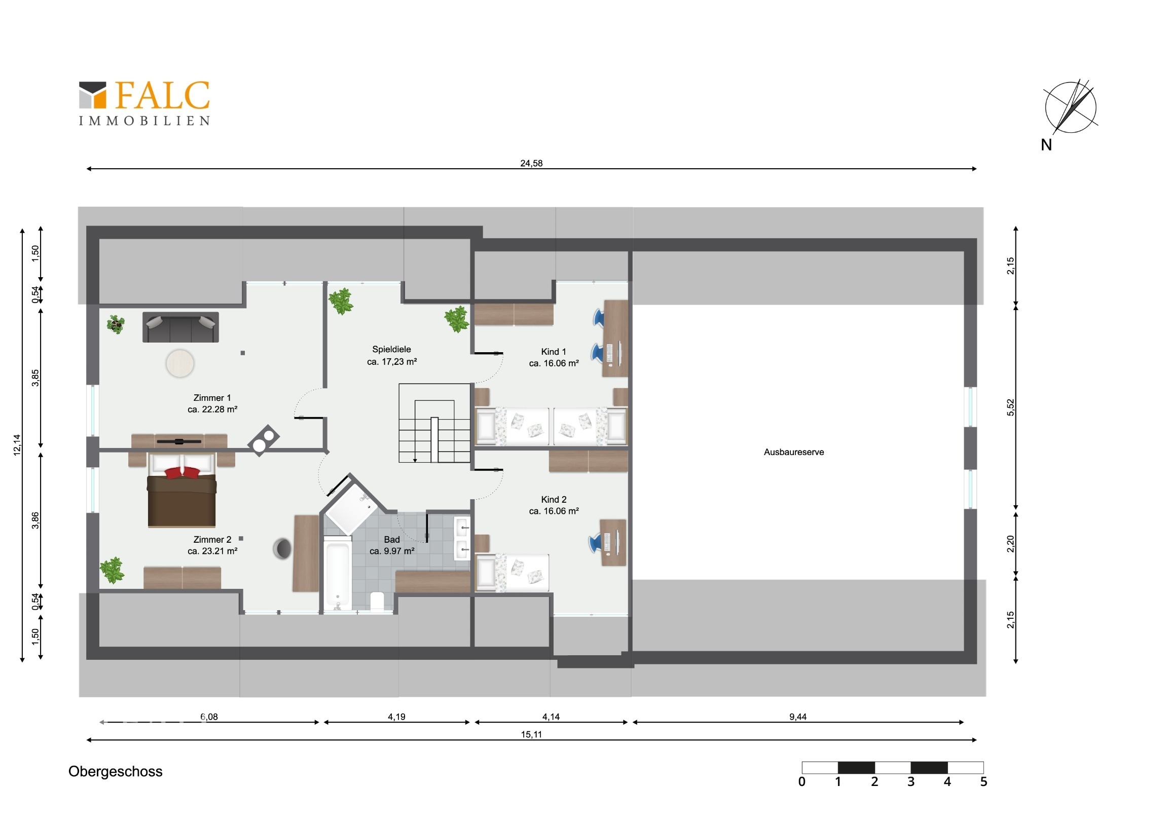 Obergeschoss (ca. 105,06 Quadratmeter): - Vollbad mit Wanne, Dusche, WC und Waschbecken, sowie Erker mit Fenster (Fliesen) - vier Zimmer zur individuellen Nutzung mit Fenster im Erker (Laminat) - Empore mit Fenster im Erker (Laminat) - vorbereitete große Ausbaureserve über ca. 79,92 Quadratmeter