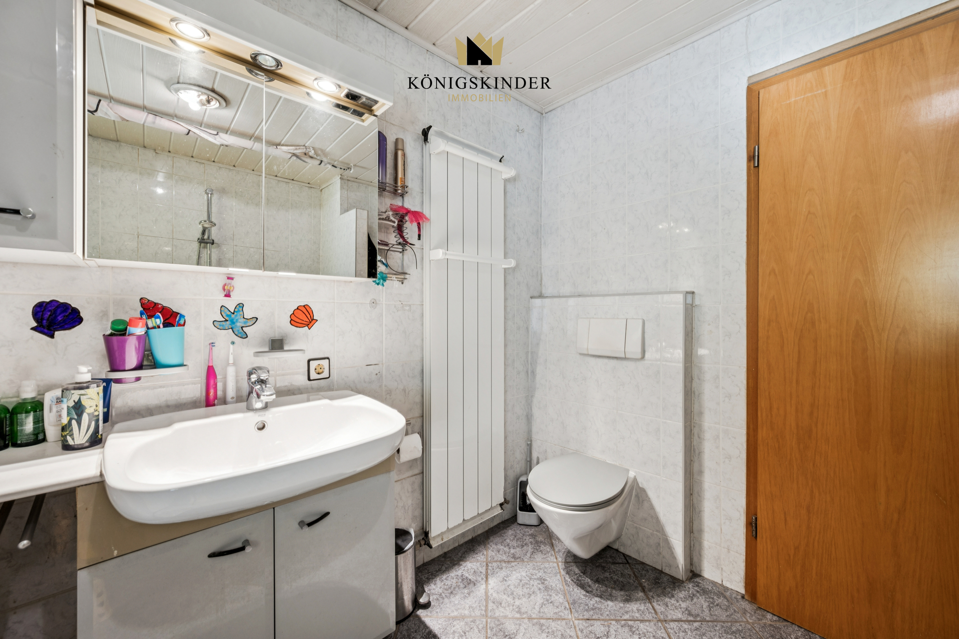 Für eine besonders behagliche Atmosphäre sorgt ein Kaminofen, der an kühleren Tagen wohlige Wärme spendet und dem Wohnbereich eine gemütliche, einladende Stimmung verleiht. Das Tageslichtbad ist mit einer Badewanne ausgestattet und bietet Raum für entspannte Momente.