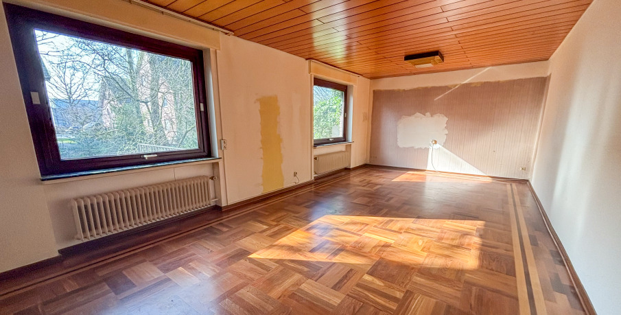 Bereits beim Betreten des Hauses empfängt Sie eine Diele, die als zentraler Verteiler in das Erdgeschoss dient. Auf dieser Ebene befinden sich eine Küche, ein Duschbad sowie ein helles Wohnzimmer, das durch seine angenehme Größe überzeugt und fließend in den Essbereich übergeht. Vom Esszimmer aus gelangen Sie direkt auf die Terrasse und in den nach Süden ausgerichteten Garten. Die Außenanlagen sind derzeit pflegebedürftig, bieten jedoch eine gute Grundlage, um eine ansprechende Wohlfühloase im Freien zu schaffen. Ergänzt wird das Raumangebot im Erdgeschoss durch ein weiteres Zimmer, das sich flexibel als Arbeits-, Gäste- oder Hobbyraum nutzen lässt.