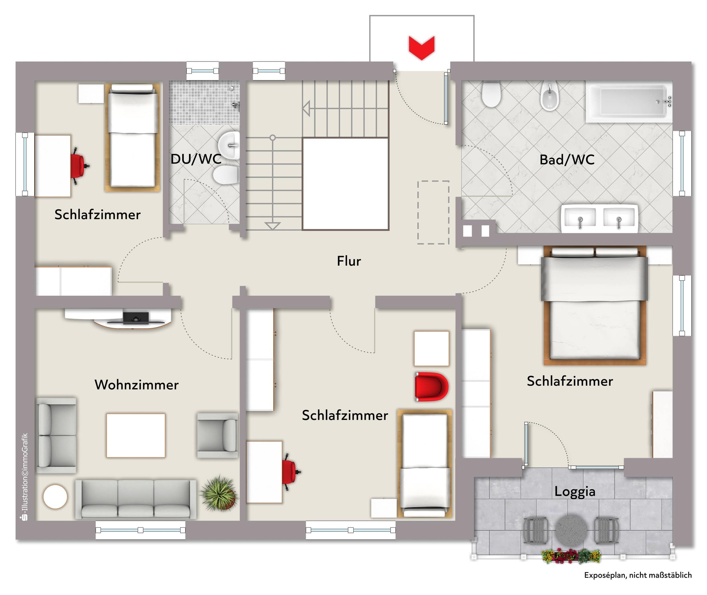 Im Obergeschoss stehen insgesamt vier Schlafzimmer zur Verfügung, wodurch ausreichend Platz für eine Familie gegeben ist. Eines der Zimmer verfügt über einen Zugang zu einer Loggia. Zudem befinden sich auf dieser Etage ein Duschbad sowie ein separates Badezimmer.