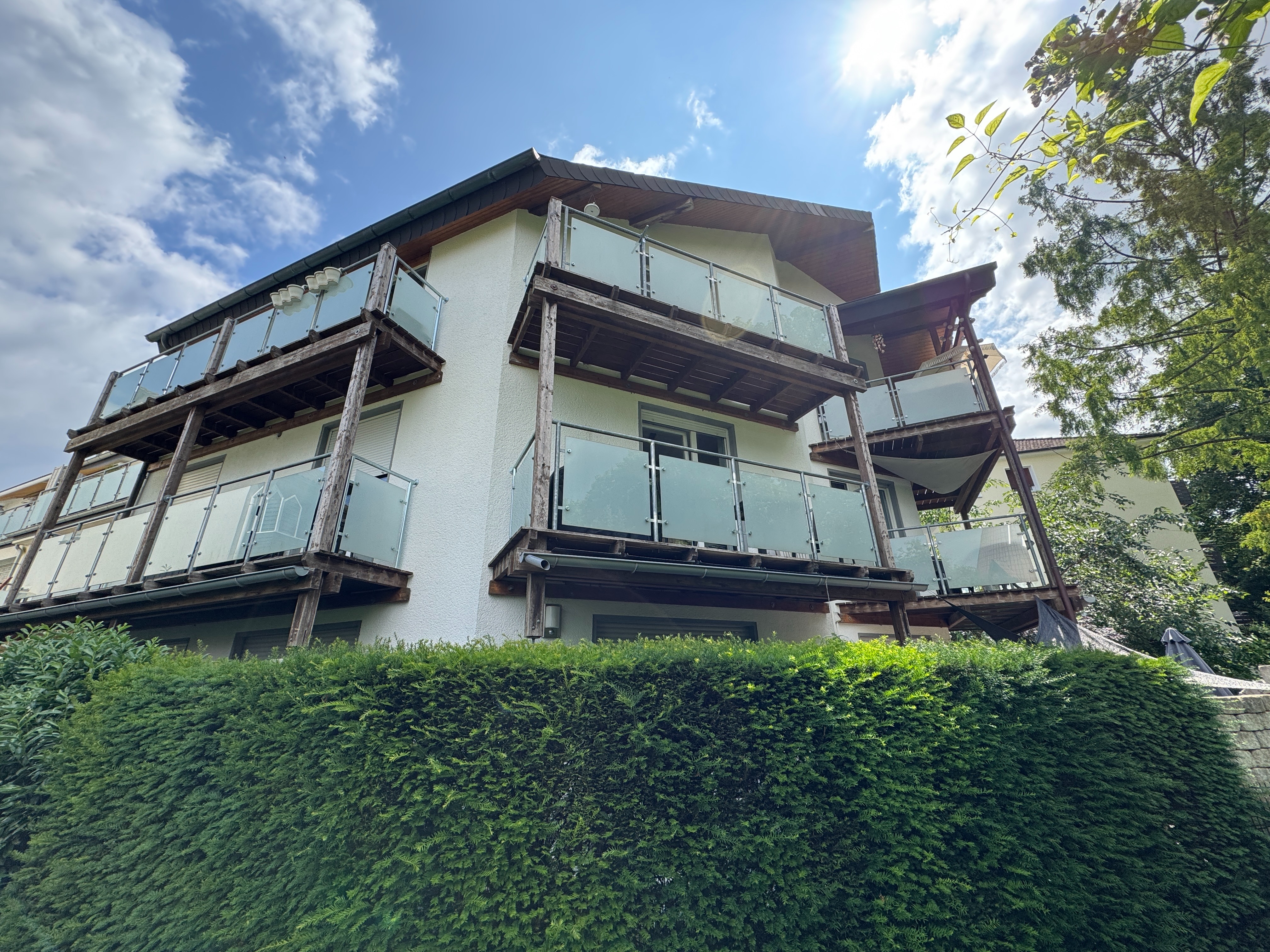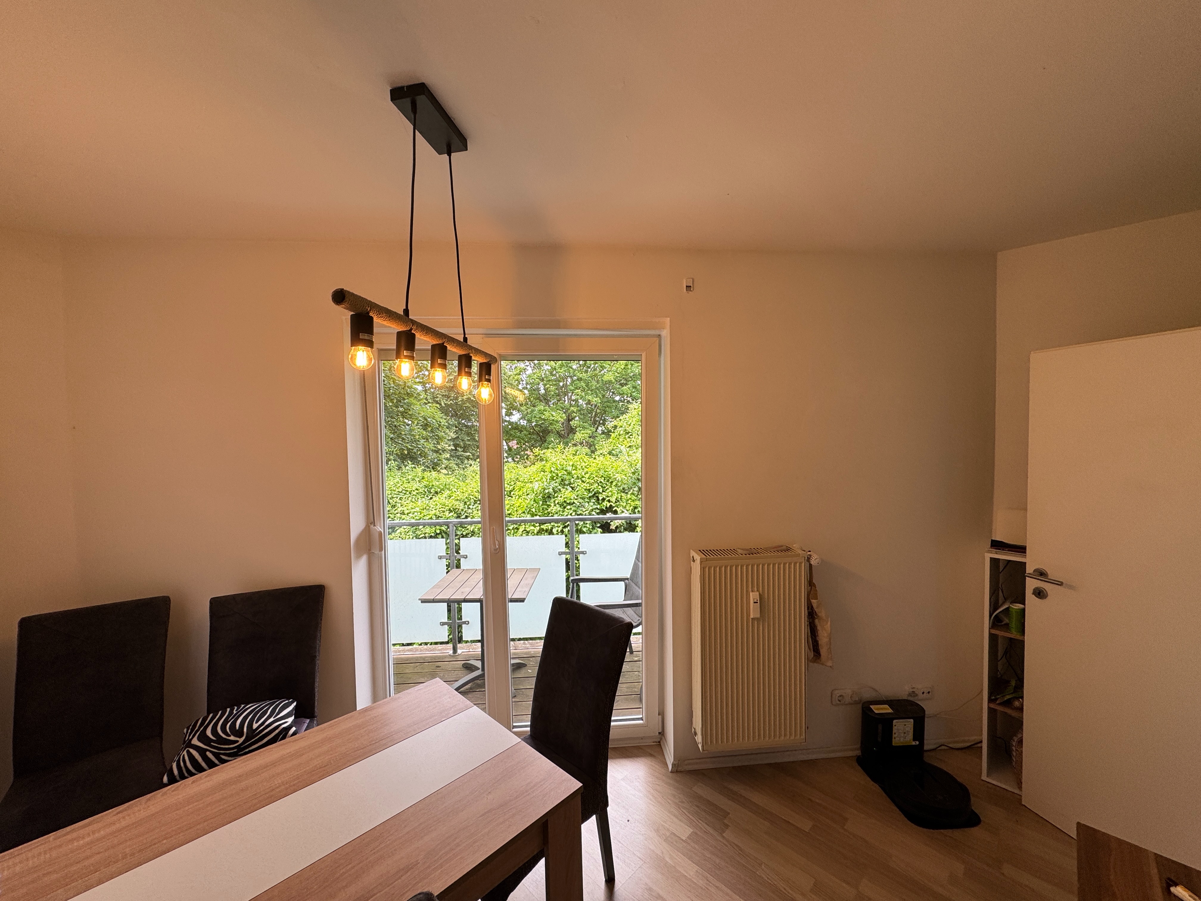 Beim Betreten der Wohnung findet man insgesamt vier Zimmer vor. Neben den beiden Schlafzimmern gibt es zwei Badezimmer, die sowohl mit einer Dusche als auch einer Badewanne ausgestattet sind. Der offene Wohnbereich bietet genügend Platz für ein gemütliches Wohnzimmer mit Zugang zu einem großen Balkon. Durch das Esszimmer erreichen Sie die Küche. Von den drei Balkonen aus hat man einen schönen Ausblick ins Grüne und kann die Sonne genießen. Eine Einbauküche gehört mit zum Angebot und verbleibt in der Wohnung.