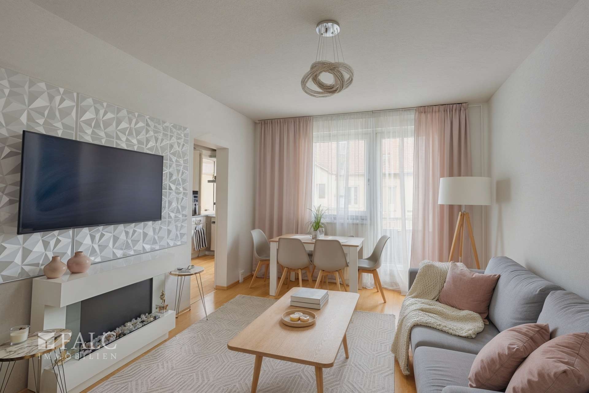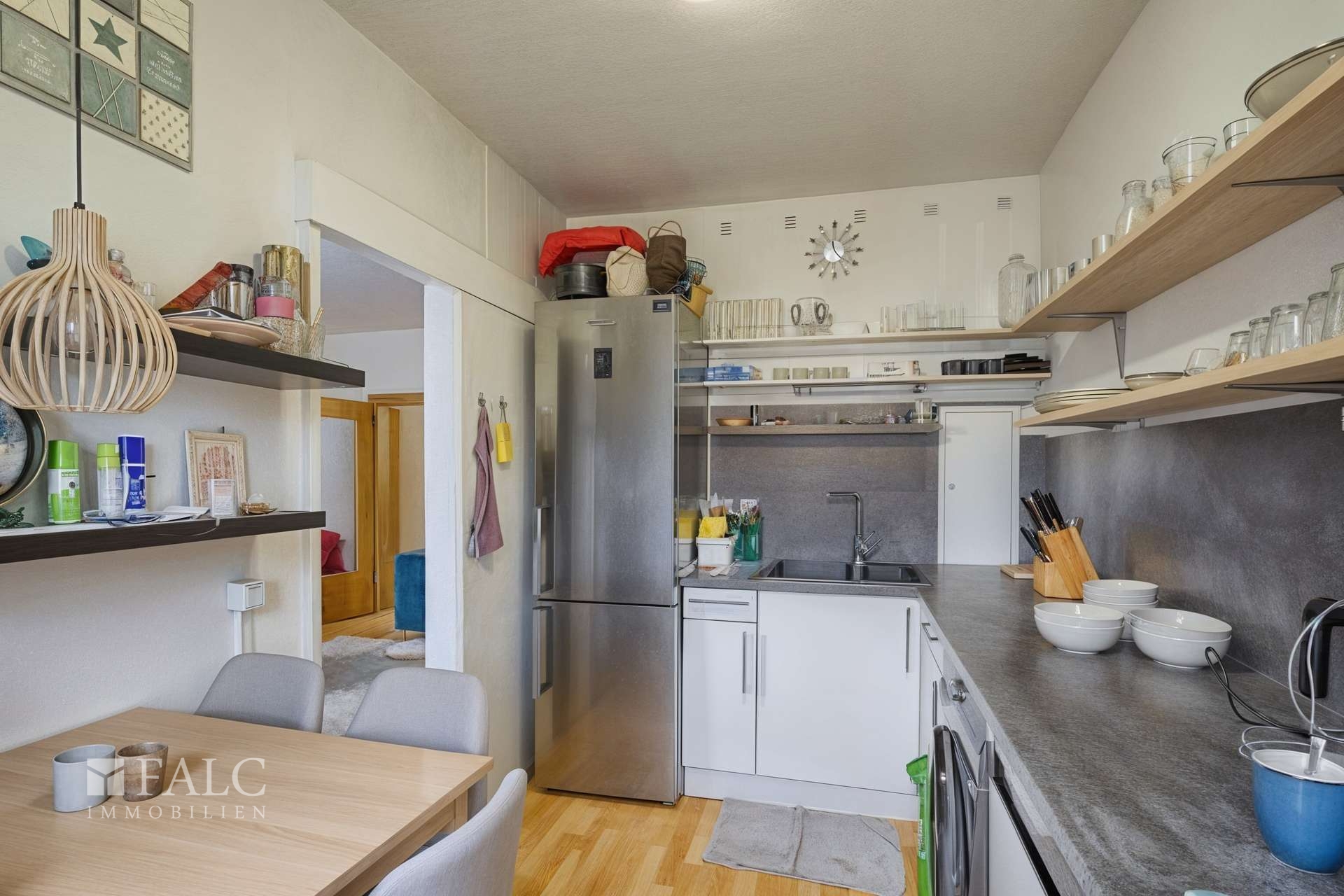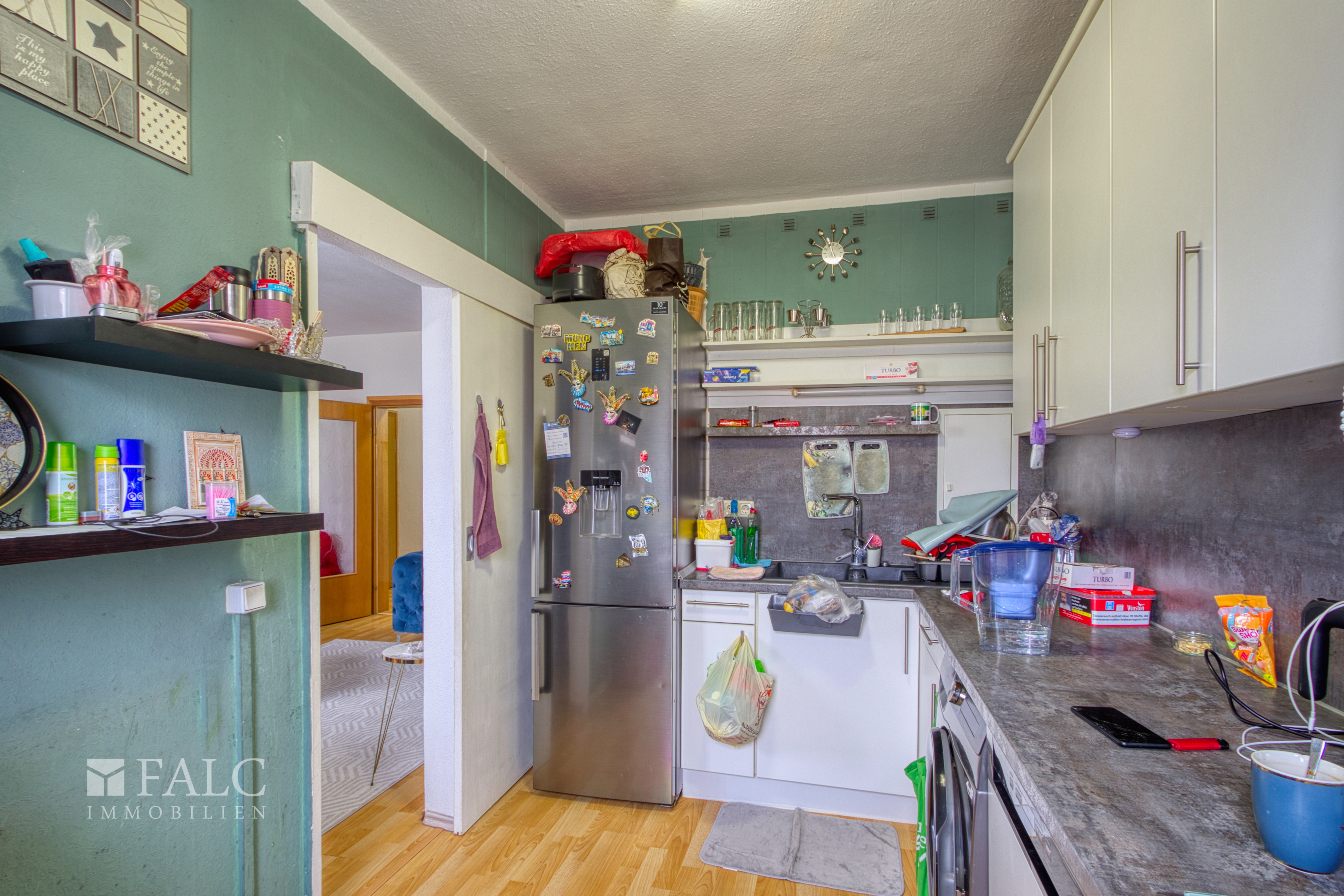 Ebenfalls auf der rechten Seite befindet sich das Wohnzimmer mit Zugang zu einer kleinen Loggia. Eine Schiebetür verbindet den Wohnbereich mit der Küche, die mit einer gepflegten Einbauküche ausgestattet ist.