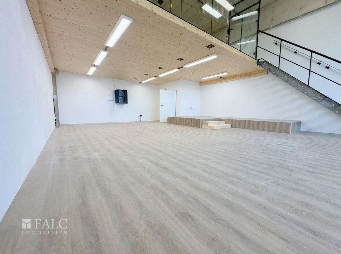 Eine Empore erweitert die Nutzfläche und bietet zusätzlichen Arbeitsraum. Im Erdgeschoss steht eine separate WC-Einheit zur Verfügung.