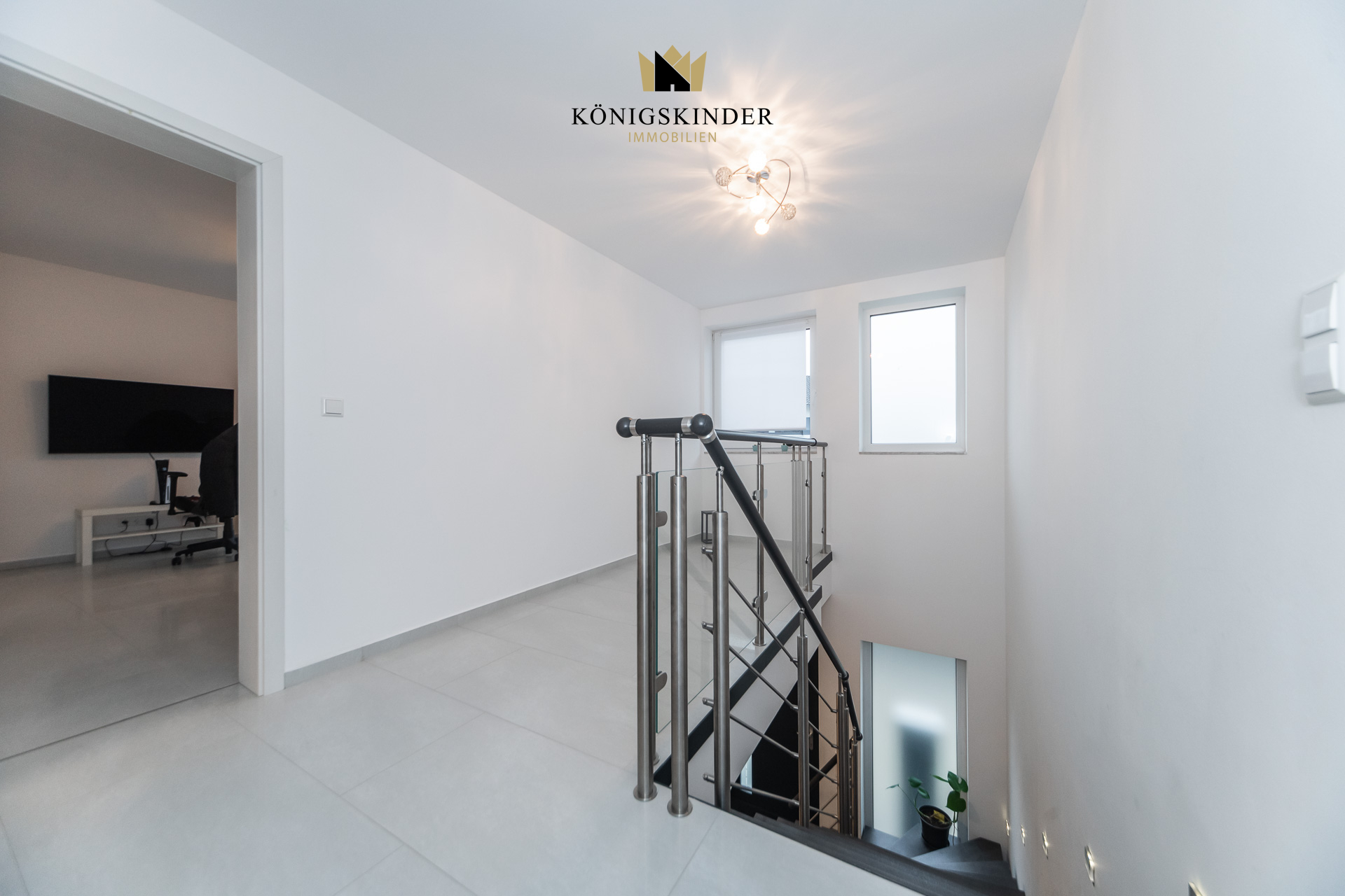 Bereits beim Betreten des Hauses überzeugt die offene und durchdachte Raumgestaltung. Im Erdgeschoss erwartet Sie eine moderne, großzügige offene Küche mit angrenzendem Ess- und Wohnbereich – der perfekte Mittelpunkt für gemeinsames Leben und gesellige Abende. Zwei weitere Zimmer sowie ein stilvolles Badezimmer ergänzen diese Ebene und bieten vielseitige Nutzungsmöglichkeiten.