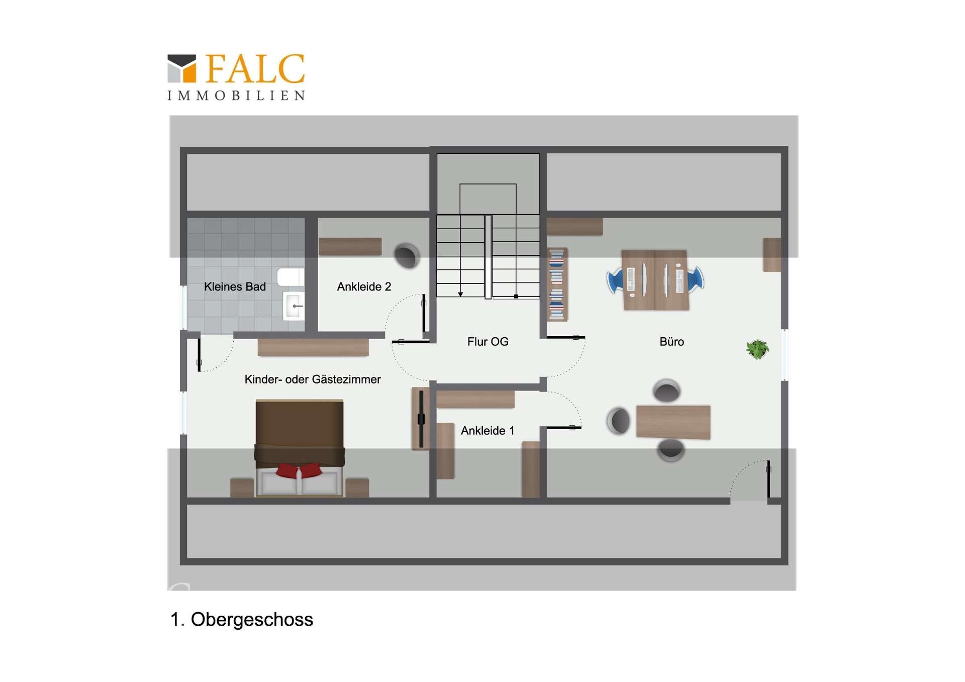 Im Obergeschoss setzt sich das harmonische Wohnkonzept fort. Hier finden Kinder, Gäste oder Homeoffice-Arbeiter ihren Rückzugsort. Ein helles Kinderzimmer, ein Büro mit Abstellraum und Blick ins Grüne, ein separates WC sowie ein Ankleidezimmer bieten vielfältige Nutzungsmöglichkeiten und machen das Wohnen flexibel und modern.