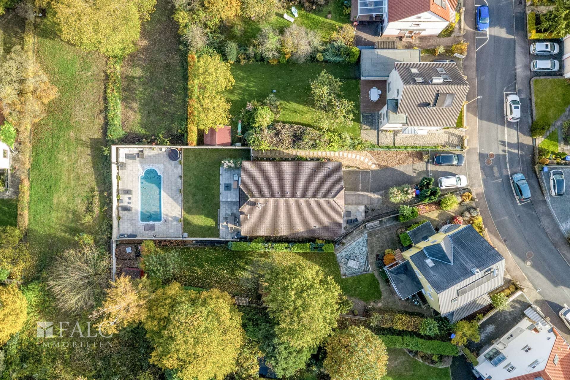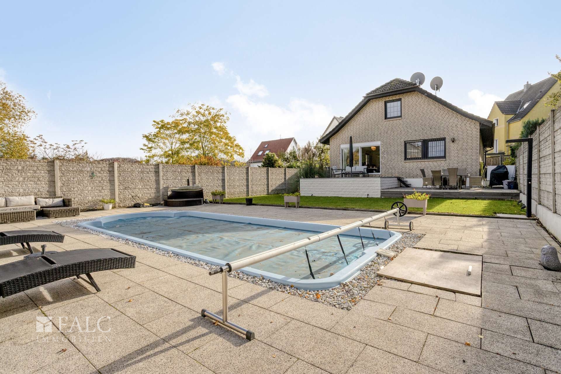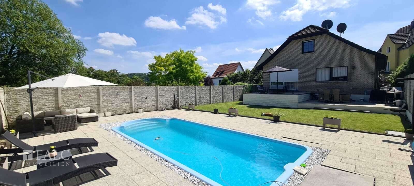 Ein weiteres Highlight erwartet Sie im Garten: Ein beeindruckender Pool mit 8,30 Metern Länge und 3,60 Metern Breite verwandelt das Grundstück in eine private Wellness-Oase. Ob Sie morgens Ihre Bahnen ziehen oder abends beim Sonnenuntergang entspannen – hier fühlt sich jeder Tag ein bisschen nach Urlaub an.