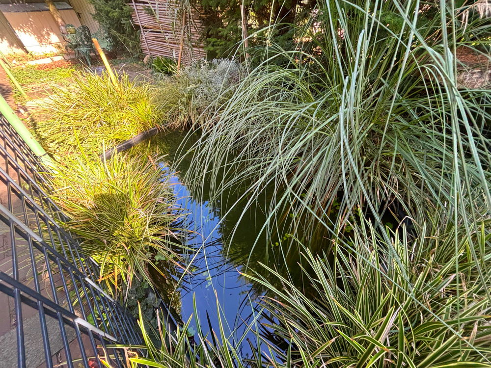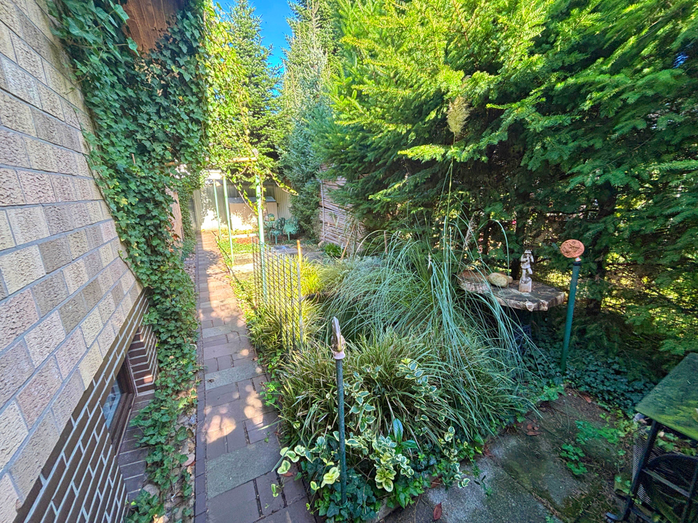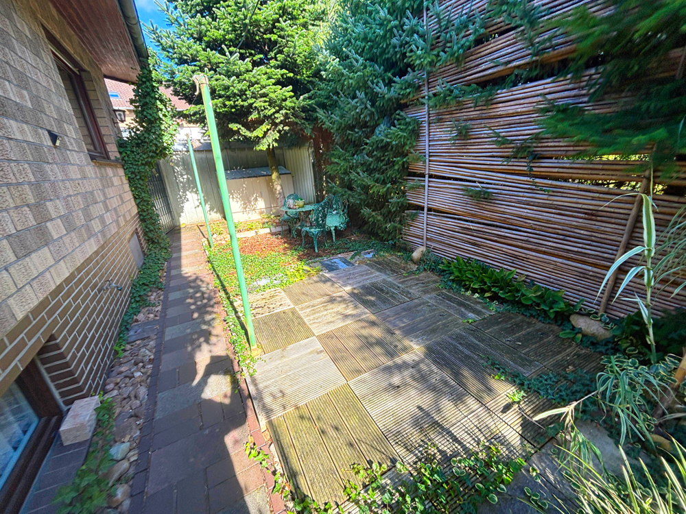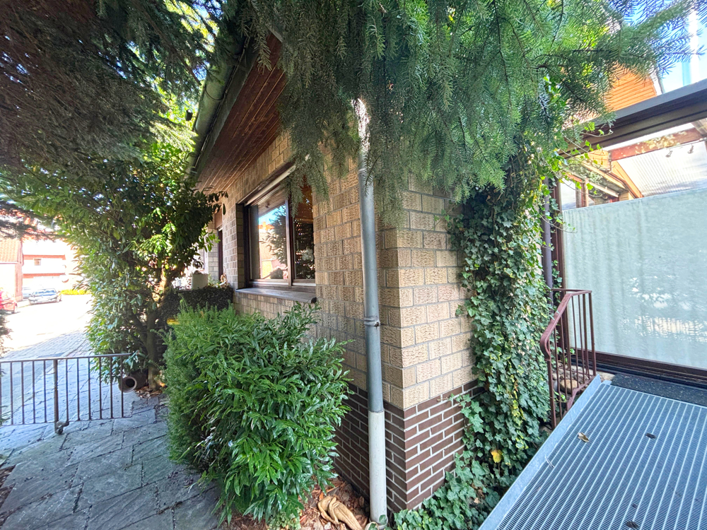 Ein Highlight ist der eingewachsene, kaum einsehbare Garten. Hier laden die überdachte Terrasse und schattige Plätze zum Entspannen ein. Rund um das Haus führt ein kleiner Weg – perfekt für Kinder oder Haustiere. Der Eingangsbereich ist aktuell barrierefrei über eine Holzrampe zugänglich; alternativ können die ursprünglichen Stufen genutzt werden.