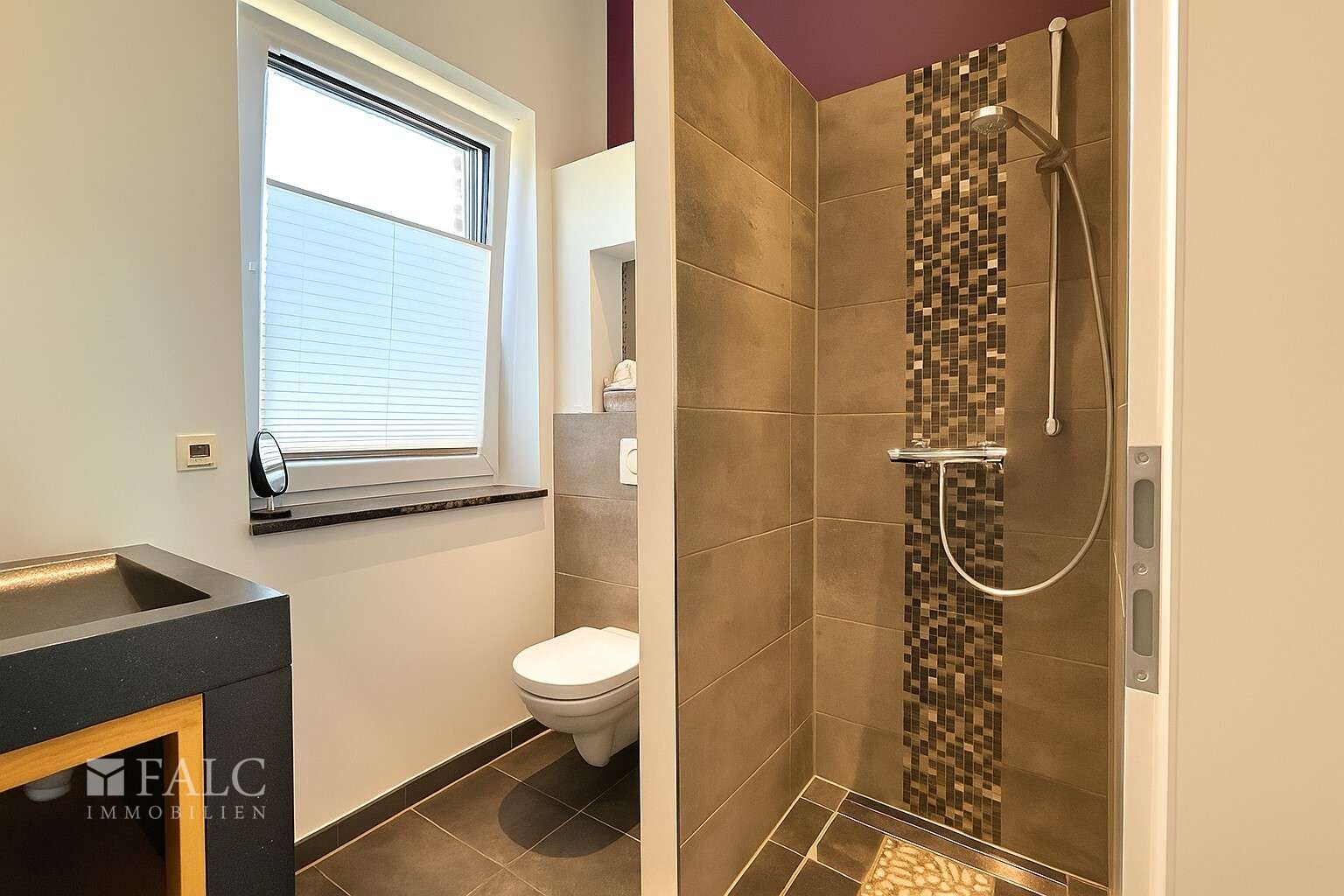 Erdgeschoss: - offener Wohn-, Ess- und Küchenbereich - moderne, hochwertige Einbauküche - helles, lichtdurchflutetes Wohnambiente mit großen Fensterfronten - Gästezimmer mit separatem Zugang zum Garten - 1 zusätzliches Zimmer (aktuell Arbeitszimmer ) - Gäste-WC mit ebenerdiger Dusche - Hauswirtschaftsraum mit direktem Zugang zum Carport