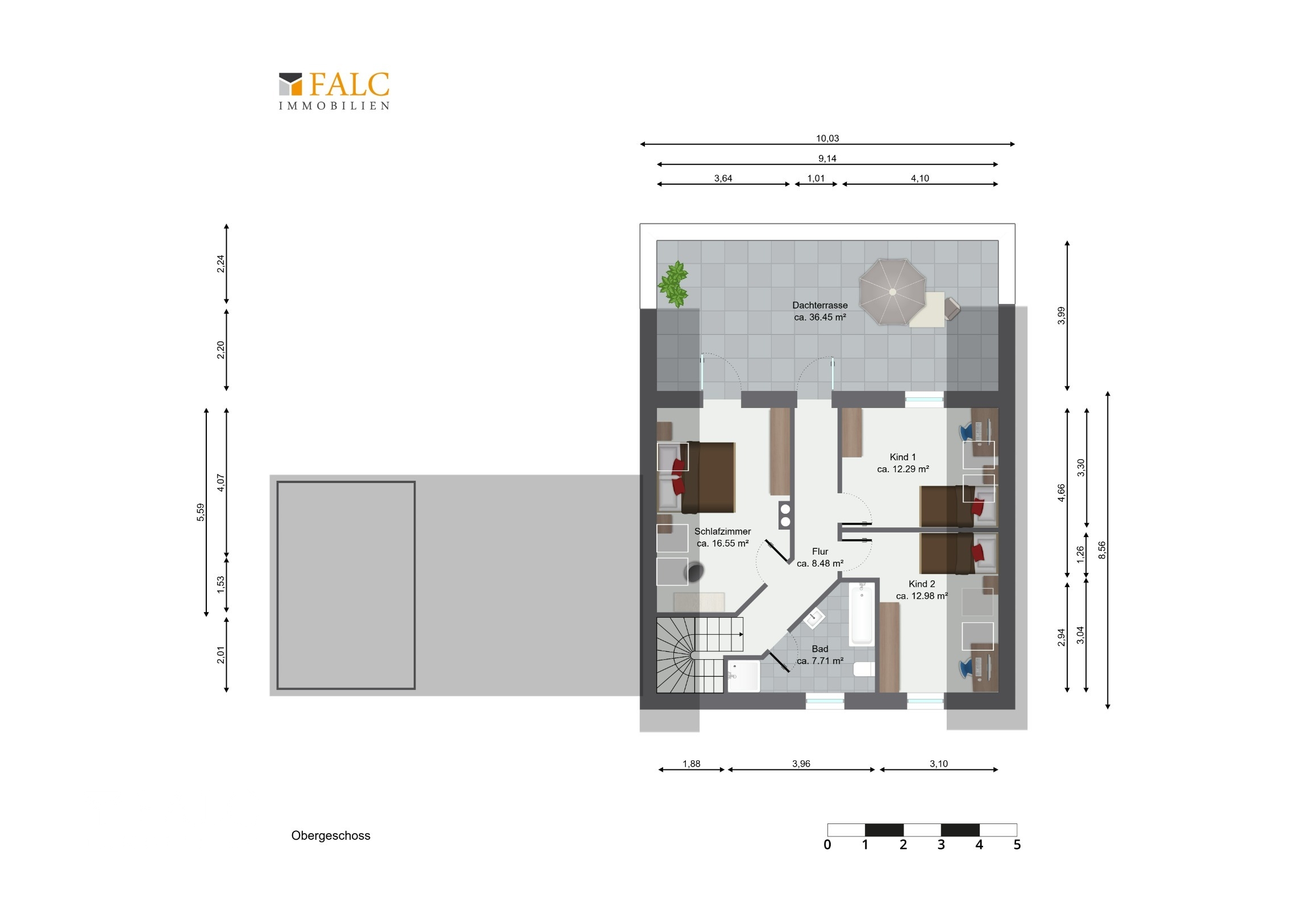 Über die Treppe im Eingangsbereich gelangen Sie in das Obergeschoss, das mit einem großzügigen Schlafzimmer, einem Kinderzimmer und einem weiteren Raum, der aktuell als Ankleidezimmer genutzt wird, überzeugt. Das moderne Badezimmer mit Badewanne und ebenerdiger Dusche lädt zum Entspannen ein. Ein besonderes Highlight ist die große Dachterrasse, die sowohl vom Schlafzimmer als auch vom Flur aus betreten werden kann – der ideale Ort für den ersten Kaffee am Morgen oder gemütliche Sommerabende.