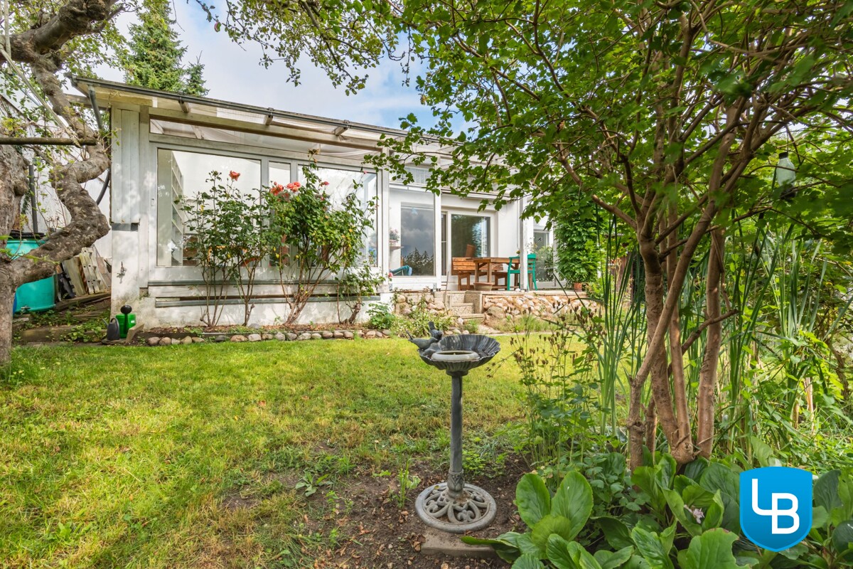 Das Grundstück ist wildromantisch eingewachsen und verleiht dem Haus einen ganz besonderen Charme. Zum Außenbereich gehören ein Carport, ein Abstellraum aus den 1980er Jahren sowie ein Gewächshaus aus den 1990ern. Die überdachte Terrasse lädt zum Entspannen ein und ist sowohl vom Wintergarten als auch vom gemütlichen Wohnzimmer mit Kamin zugänglich.