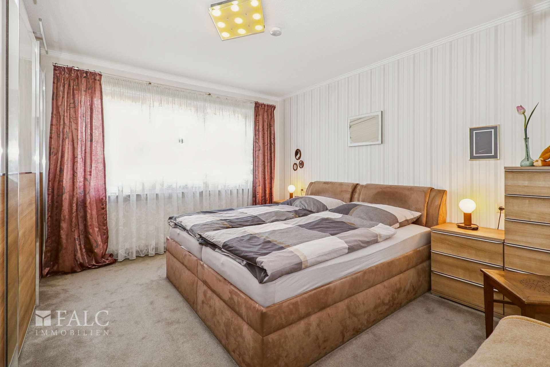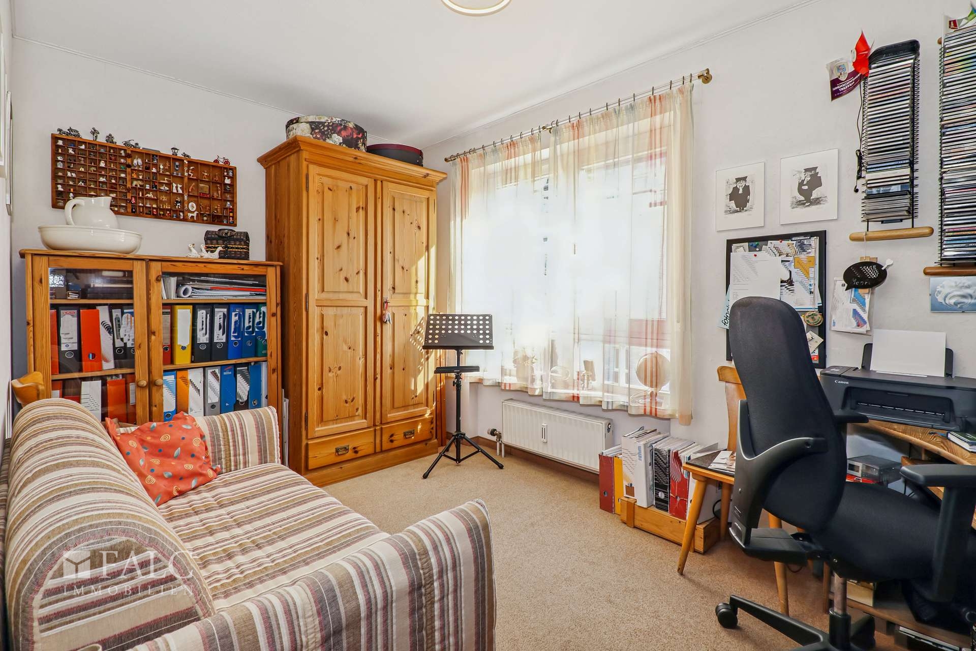 Das Schlafzimmer verfügt über ausreichend Platz für ein großes Bett und einen Kleiderschrank. Ein weiteres Zimmer kann flexibel als Kinderzimmer oder Büro genutzt werden. Beide Räume sind hell und freundlich gestaltet.