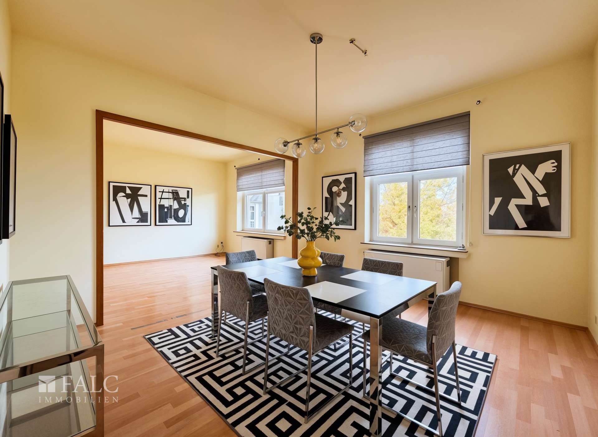 Das angrenzende Esszimmer bietet ausreichend Platz für gesellige Zusammenkünfte und gemeinsame Mahlzeiten. Die Küche ist ein heller, offener Raum, der viel Potenzial für individuelle Gestaltung bietet und direkten Zugang zu einem Balkon hat, der zum Entspannen im Freien einlädt und an lauen Sommerabenden zum Verweilen einlädt.