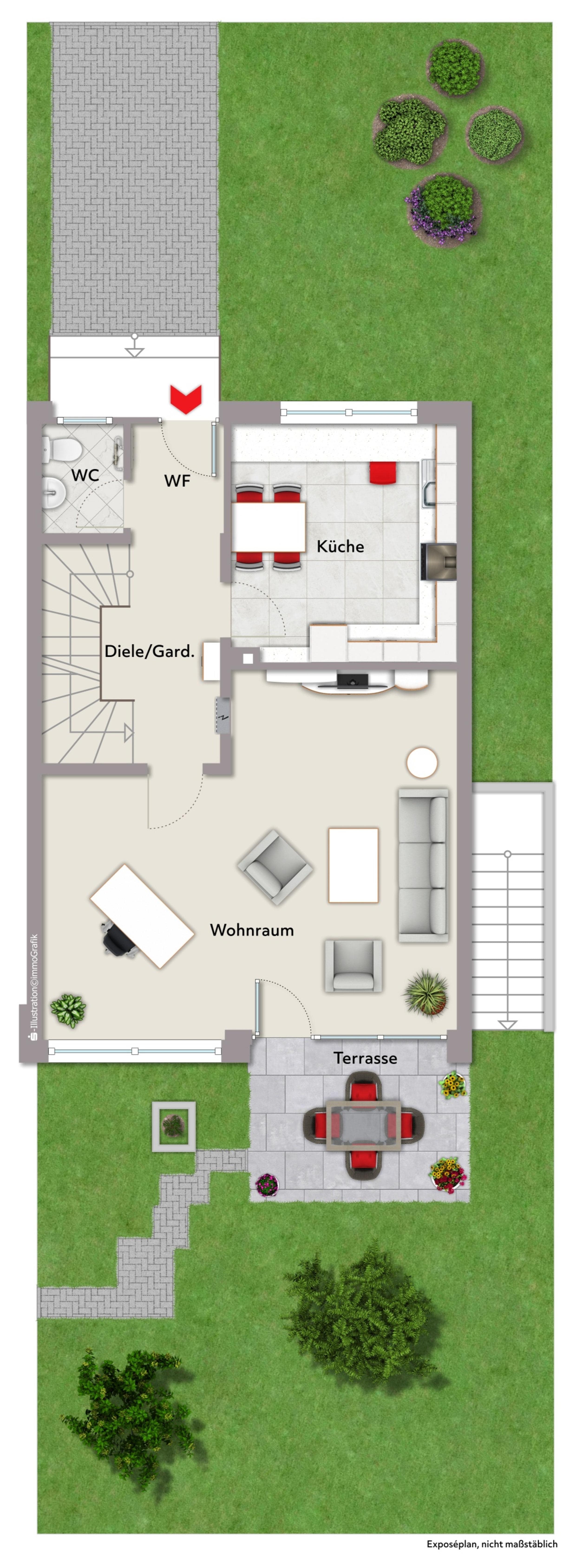 Beim Betreten des Hauses gelangen Sie zunächst in einen praktischen Windfang mit angrenzendem Gäste-WC – eine komfortable Lösung für den Alltag. Die separate Küche eröffnet vielfältige Möglichkeiten zur Neugestaltung ganz nach Ihren persönlichen Wünschen. Den Mittelpunkt des Hauses bildet der helle Wohn- und Essbereich mit großen Fensterflächen, die für eine freundliche und einladende Atmosphäre sorgen. Von hier aus erreichen Sie direkt die Terrasse sowie den Garten. Der Außenbereich eröffnet viel Raum für Erholung, Spiel und kreative Gartengestaltung, benötigt jedoch eine Auffrischung, um sein volles Potenzial zu entfalten.