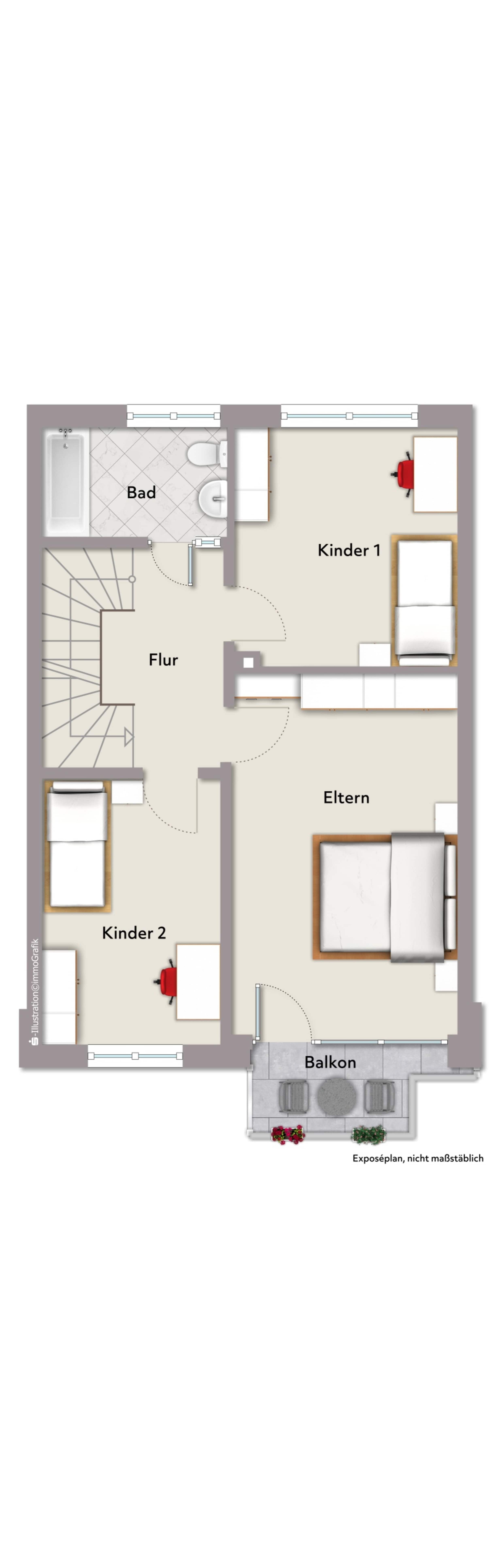 Im Obergeschoss stehen drei gut geschnittene Schlafzimmer zur Verfügung, die sich flexibel als Eltern-, Kinderzimmer oder Homeoffice nutzen lassen. Eines der Zimmer verfügt über einen eigenen Balkon und schafft so einen zusätzlichen Rückzugsort im Freien. Das Badezimmer ist mit Dusche und Badewanne ausgestattet.