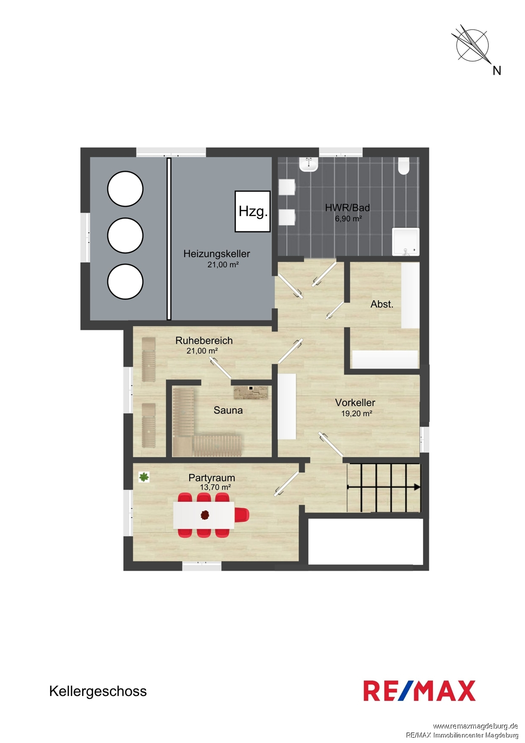 Kellergeschoss: - Hobbyraum/ Partyraum - Vorratsraum, - Waschküche mit WC und Dusche - Sauna, - Heizungsraum,