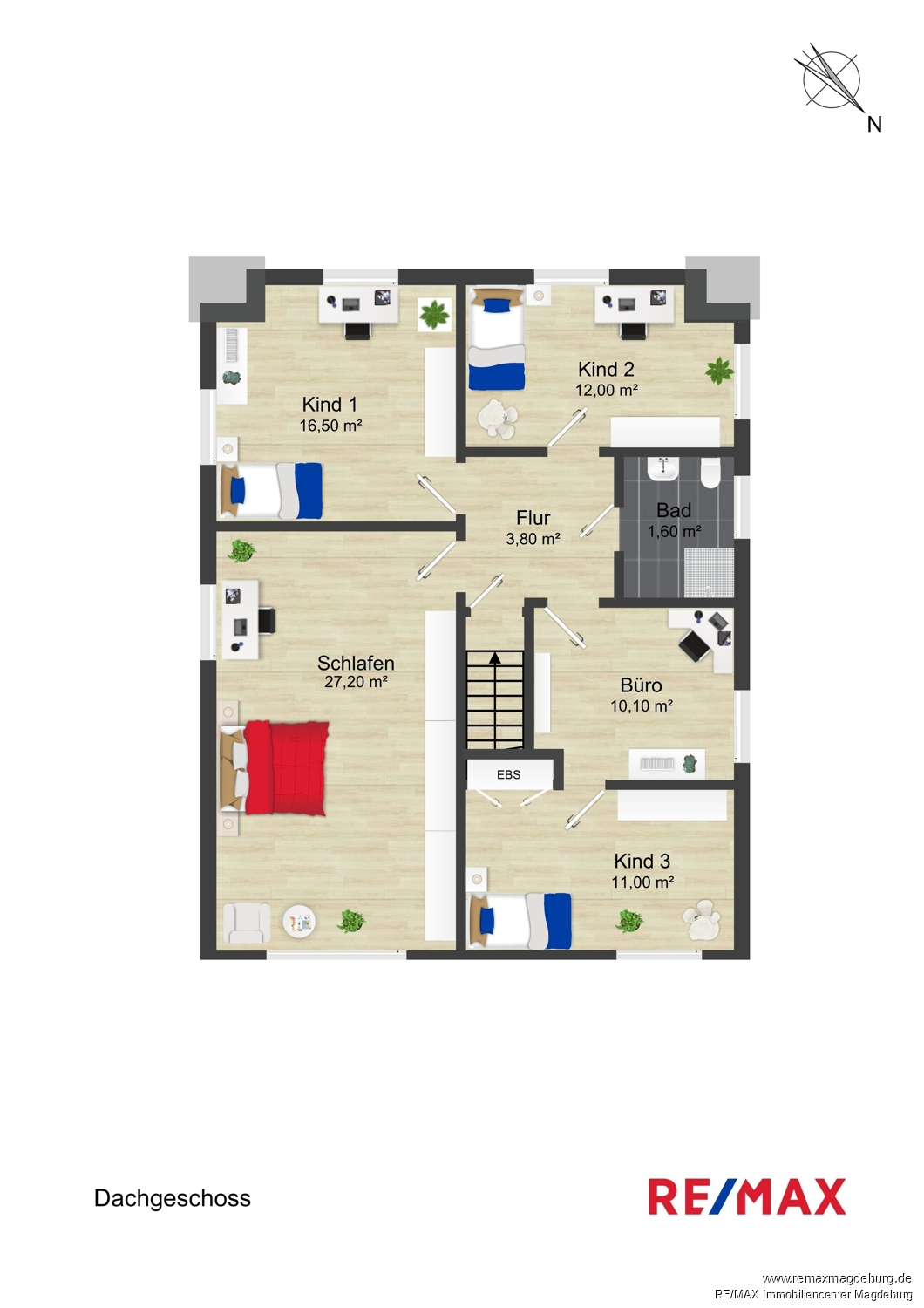 Dachgeschoss: - Flur, - großes Schlafzimmer mit Panoramafenster, - Kind 1, - Kind 2, - Bad mit Dusche, - Büro, - Kind 3, - Zugang zum Spitzboden,