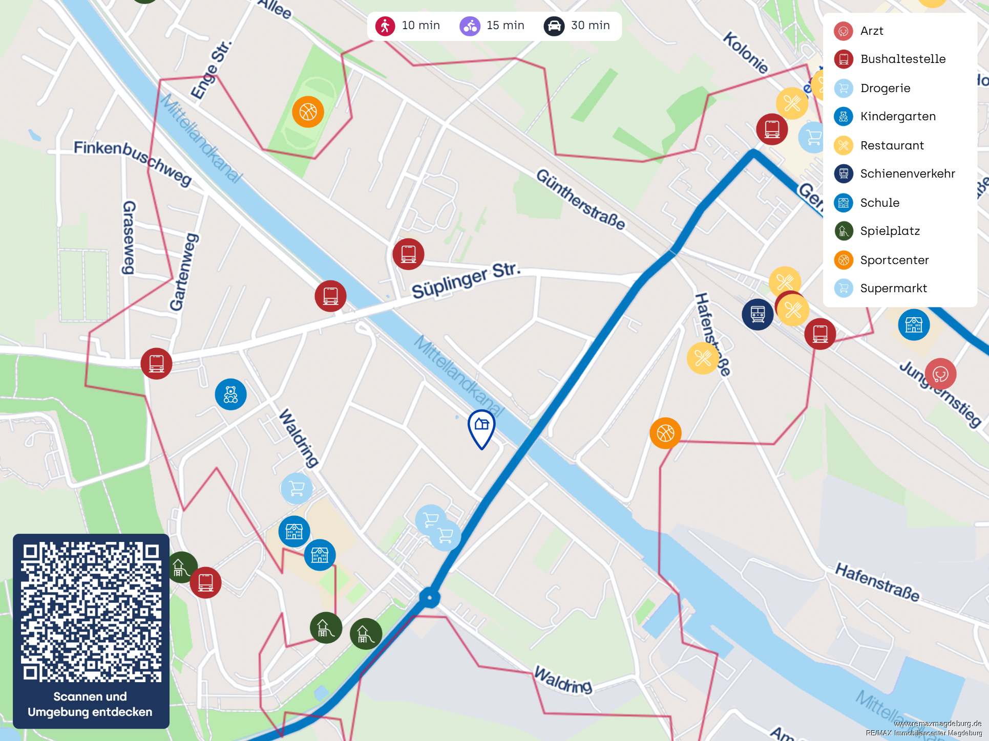 Die Verkehrsanbindung ist gut: Über die B1 oder die umliegenden Landstraßen ist eine schnelle Verbindung zu Magdeburg und weiteren Städten der Umgebung gewährleistet. Für Freizeitaktivitäten bietet die Lage zahlreiche Möglichkeiten: Spaziergänge entlang des Kanals, Radfahren, Wassersport oder einfach die naturnahe Umgebung genießen.