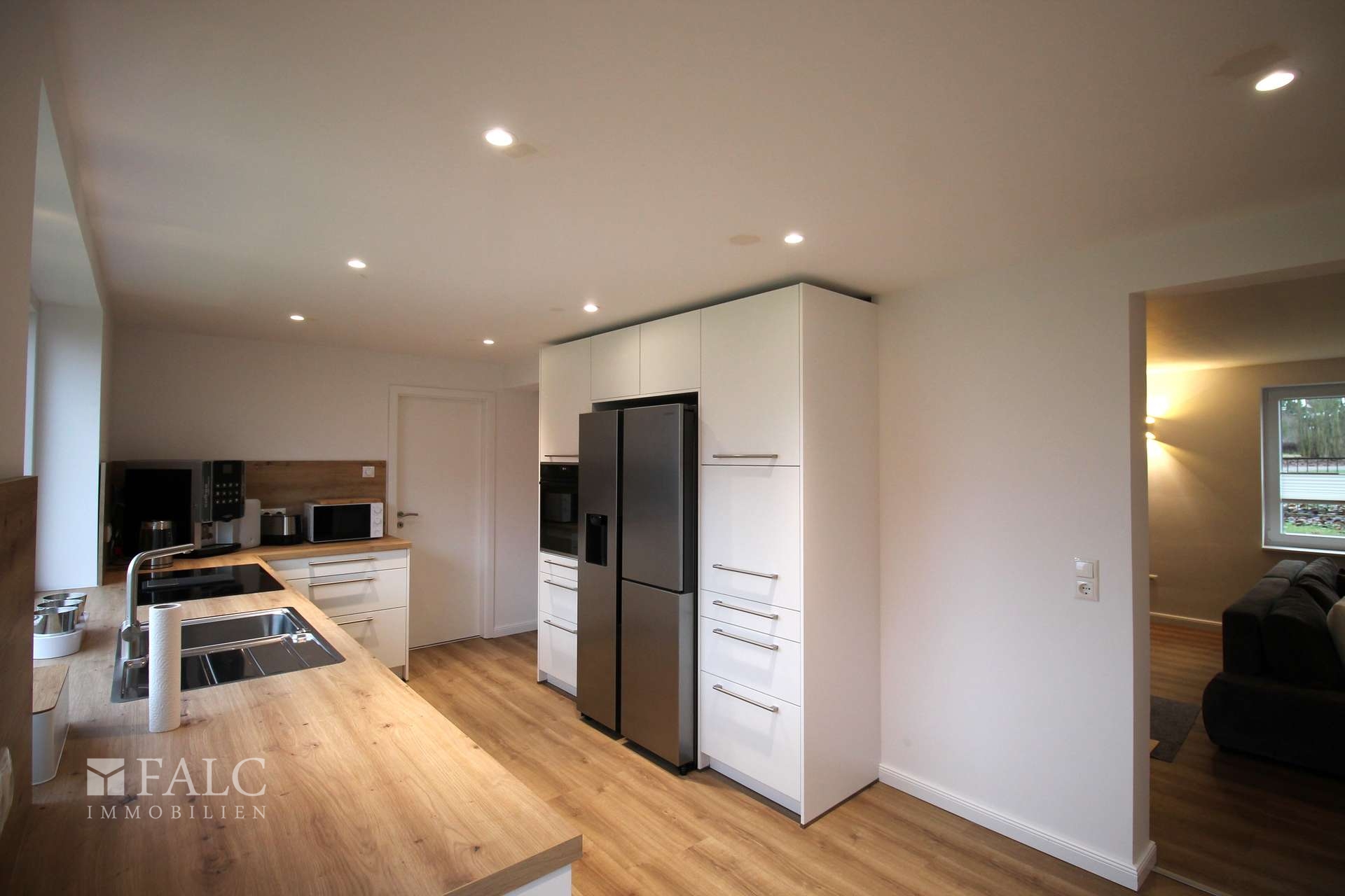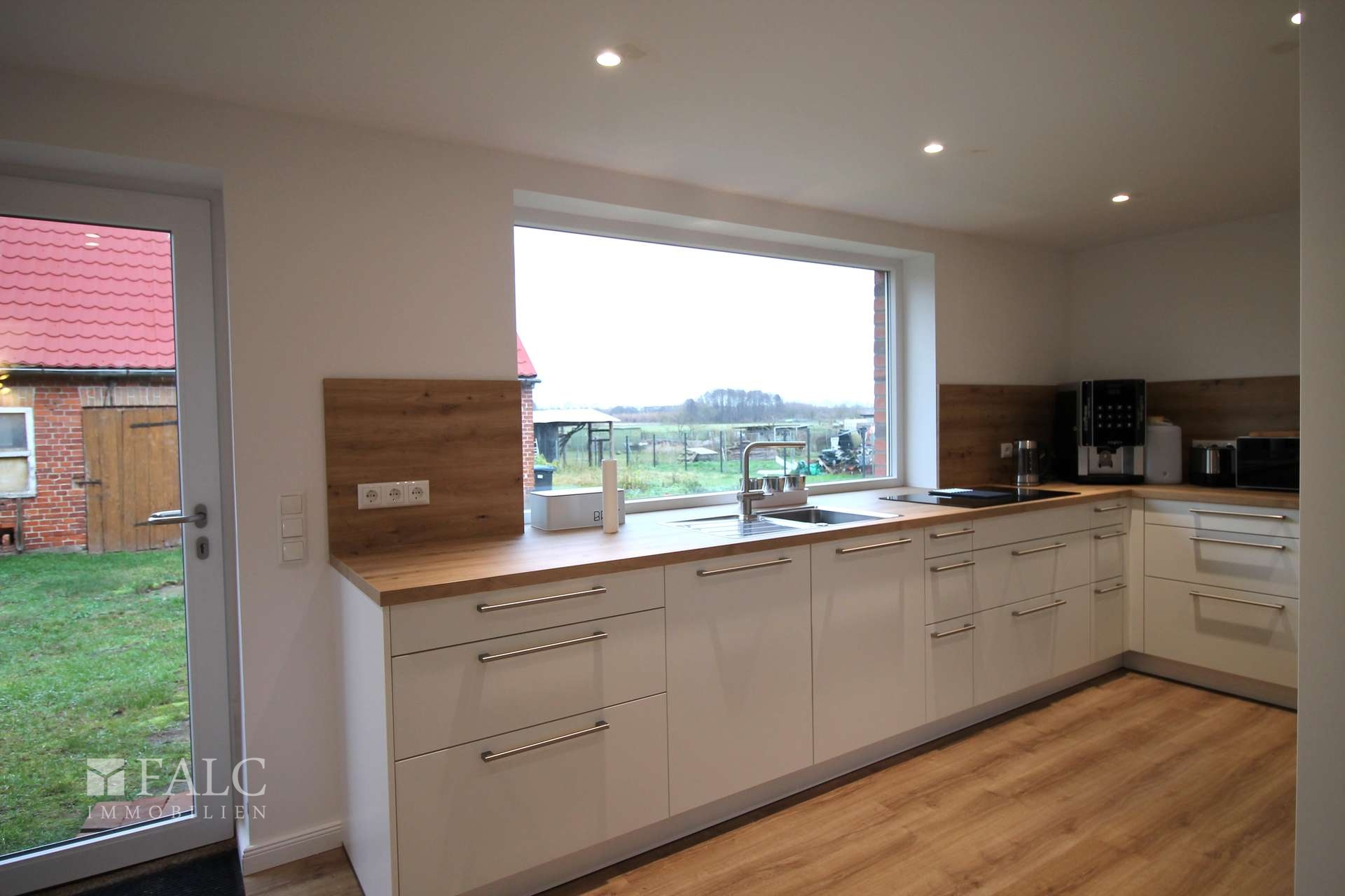 Direkt anschließend liegt die Küche, modern und funktional mit langen Arbeitsflächen, viel Stauraum und einem großen Fenster über der Spüle. Kochen wird hier zum Teil des Zusammenseins, nicht zur Nebenaufgabe. Von hier aus geht es auch bequem nach draußen.