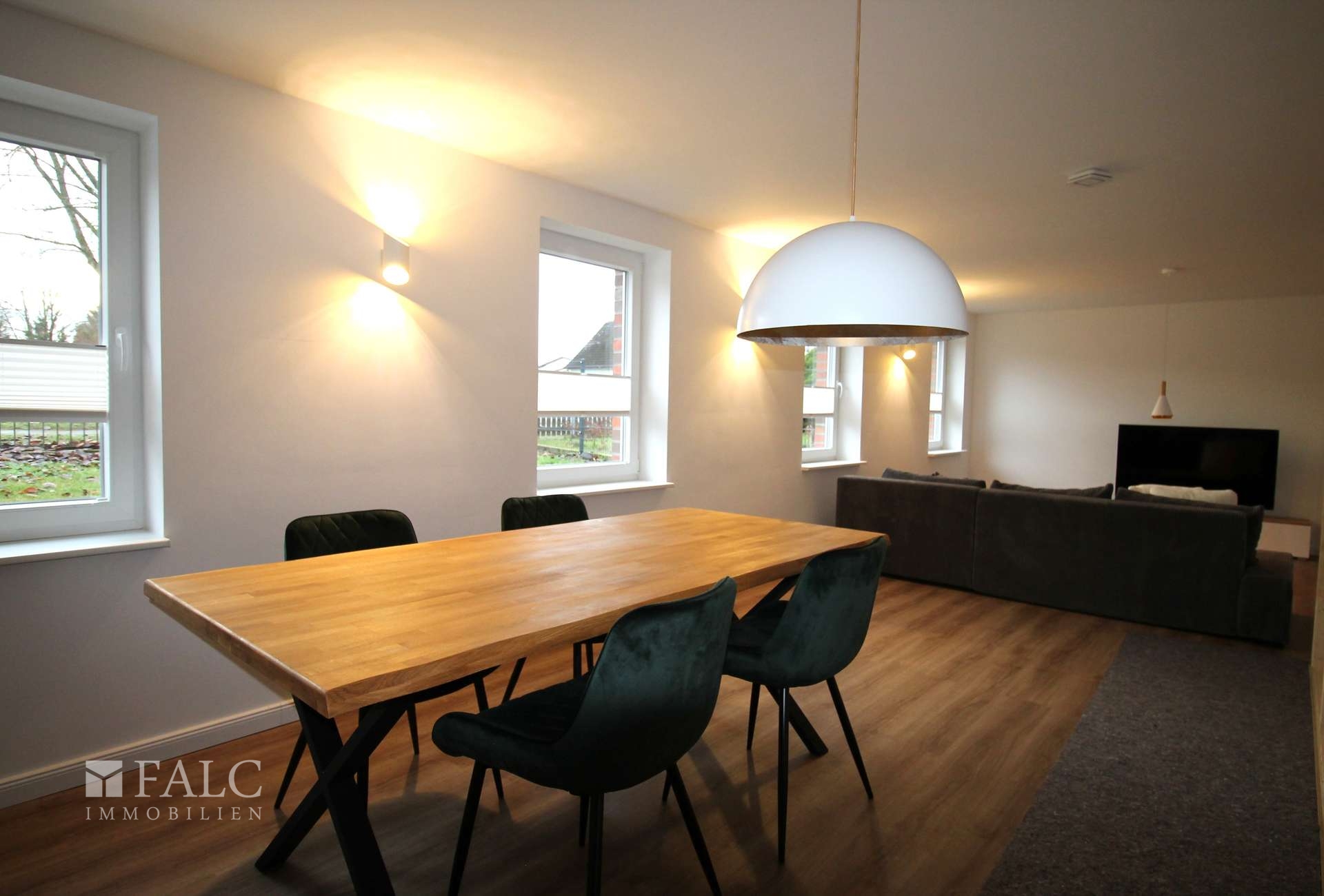 Der Rundgang führt zuerst in den großzügigen Wohnbereich, der Wohnen und Essen offen zusammenbringt. Mehrere Fenster lassen viel Tageslicht herein, abends sorgen Wand und Pendelleuchten für eine warme Stimmung. Der Boden in Holzoptik gibt dem Raum Ruhe und passt zu vielen Einrichtungsstilen. Hier ist Platz für ein großes Sofa, einen langen Esstisch und genau die Momente, die man nicht planen muss.