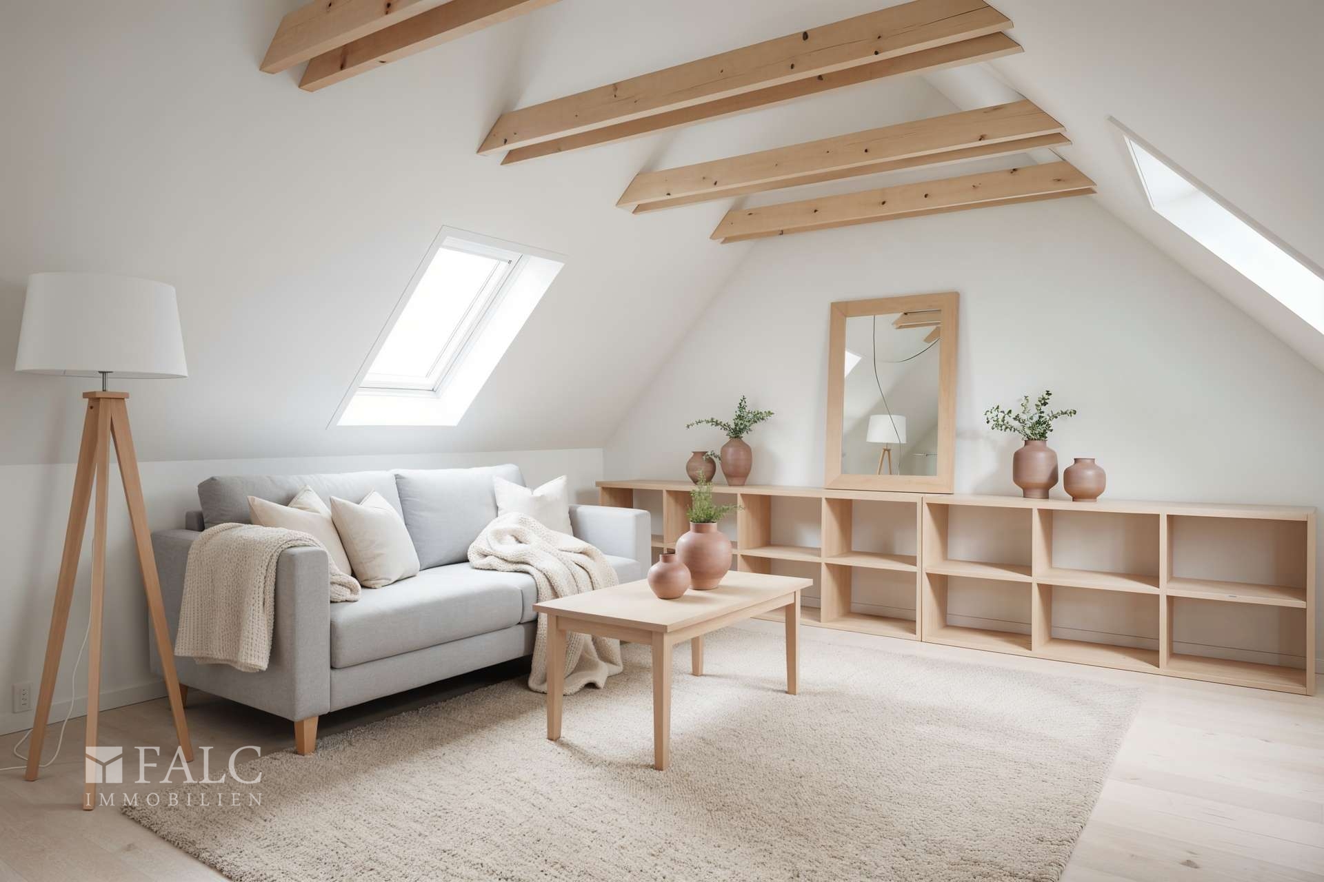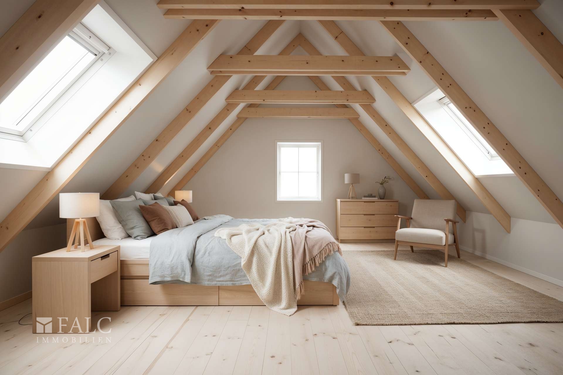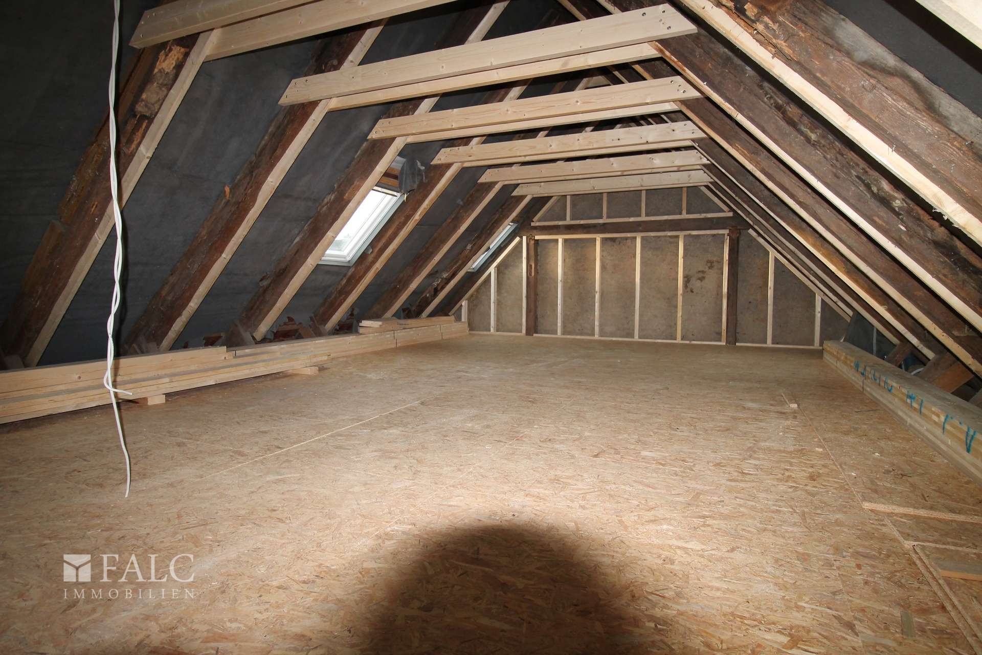 Im Obergeschoss wartet zusätzliche Fläche unter dem Dach, die sich aktuell im Ausbau befindet. Sichtbare Konstruktionen und Dachfenster geben eine gute Vorstellung davon, was hier später möglich ist.