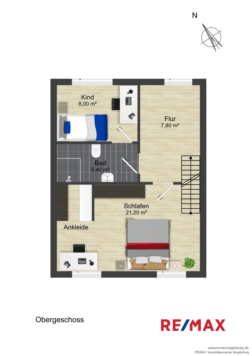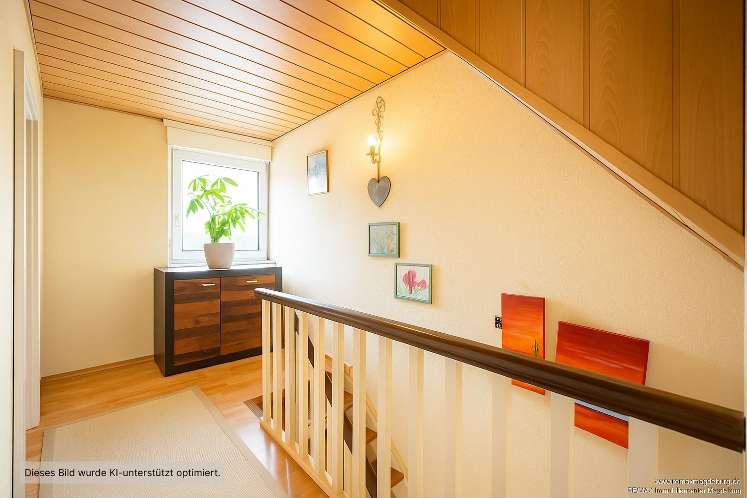 Im Obergeschoss führt ein zentraler Flur ins Schlafzimmer mit praktischem Ankleidebereich. Das Badezimmer mit Dusche dient hier als Durchgangszimmer zum Kinderzimmer, was eine praktische Nutzung für kleine Familien ermöglicht. Zusätzlich eröffnet der Zugang zum ungenutzten Dachgeschoss die Möglichkeit für weiteren Wohn- oder Stauraum.