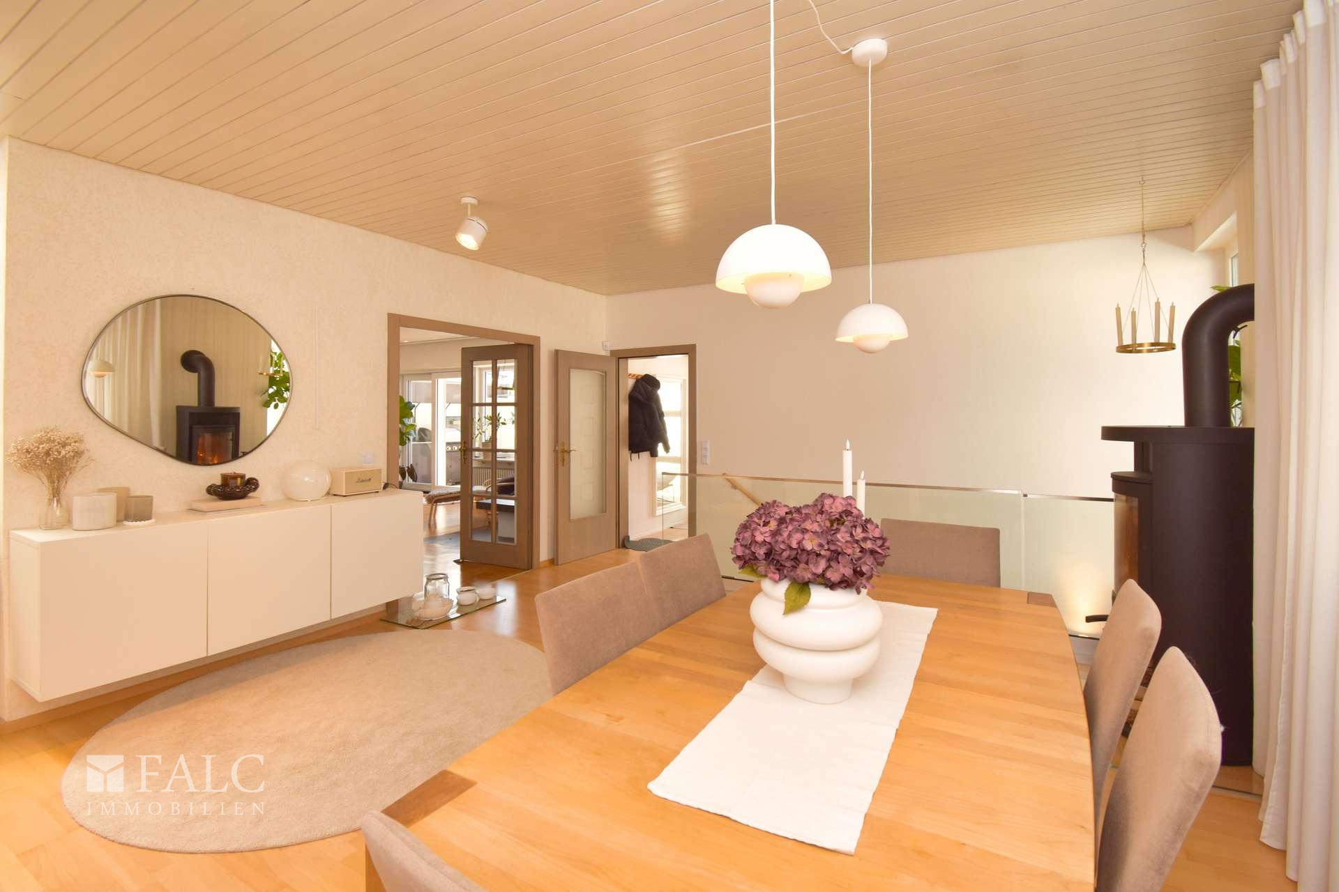 Im Haus betreten Sie zunächst einen Windfang, der ausreichend Raum für Garderobe und Ankommen bietet. Von hier aus gelangen Sie bequem auch direkt in die Garage, was im Alltag sehr praktisch ist. Danach öffnet sich das Erdgeschoss in einen großzügigen Essbereich, der als Mittelpunkt des Hauses wirkt. Hier sitzt man gern zusammen und der Kaminofen sorgt für eine warme, einladende Atmosphäre. Von diesem offenen Bereich aus geht es fließend weiter in das große Wohnzimmer, das durch seine großen Fensterflächen besonders hell wirkt und den Garten optisch ins Haus bringt. Die zusätzlich angebrachten Flachdachfenster schenken dem Raum noch mehr Tageslicht. Ein weiterer Kamin im Wohnzimmer macht den Raum nicht nur gemütlich, sondern verleiht auch an kühleren Tagen genau dieses Gefühl von Zuhause.