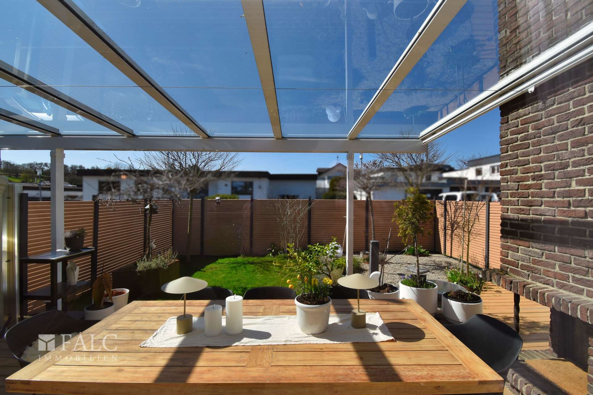 Schon bei der Ankunft wirkt alles stimmig, denn vor der Doppelgarage befinden sich zwei weitere Stellplätze, sodass Familie und Gäste jederzeit bequem parken können. Der Außenbereich ist eine echte Wohlfühloase dieses Hauses. Die Terrasse liegt in schöner Südwest-Ausrichtung und ist so angelegt, dass Sie sowohl den Alltag als auch besondere Abende im Freien genießen können. Unter der Glasüberdachung lässt sich der Platz lange im Jahr nutzen, die elektrisch ausfahrbare Markise sorgt bei Bedarf für Schatten, und für gesellige Runden steht genügend Fläche für einen großen Tisch zur Verfügung. Der integrierte Gartenkamin bringt am Abend eine behagliche Stimmung, während ein Palisadenzaun die Privatsphäre angenehm unterstützt.