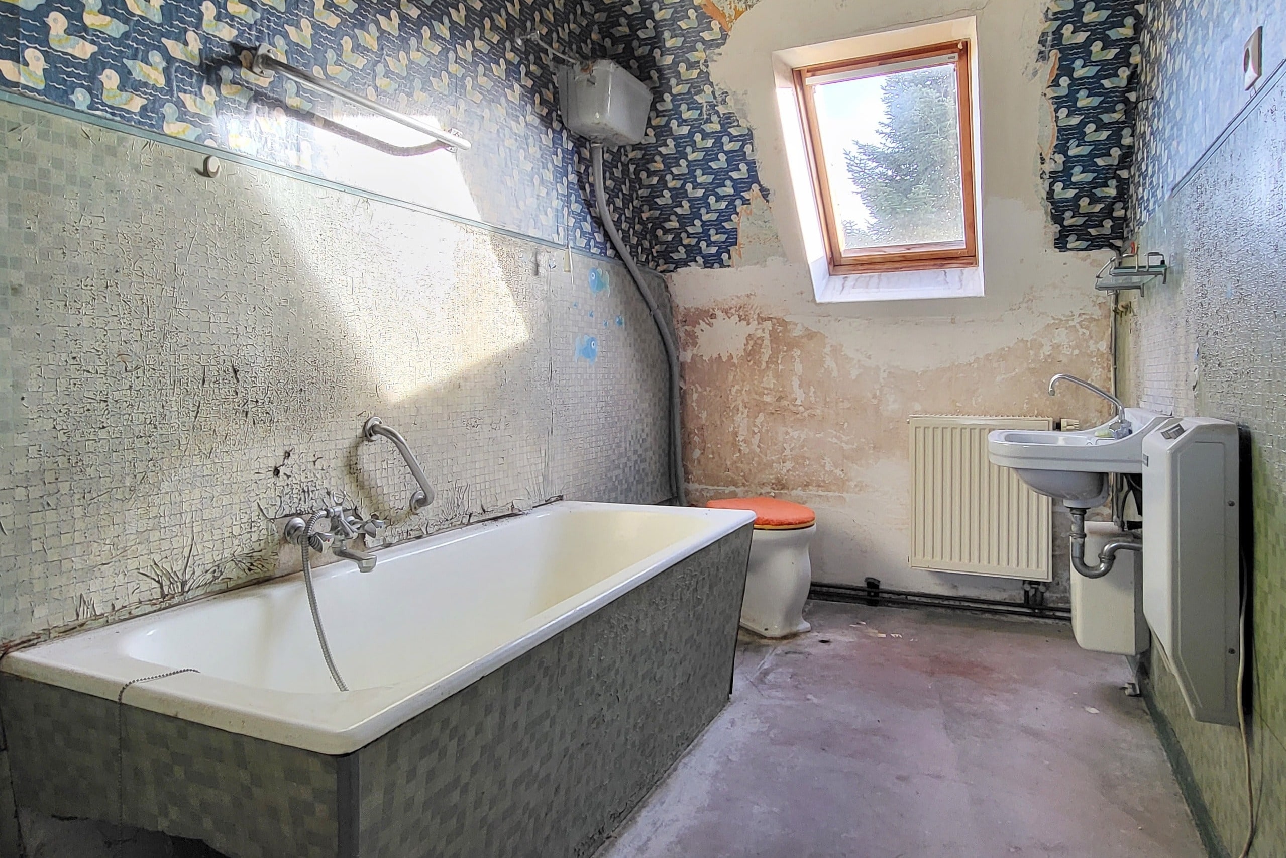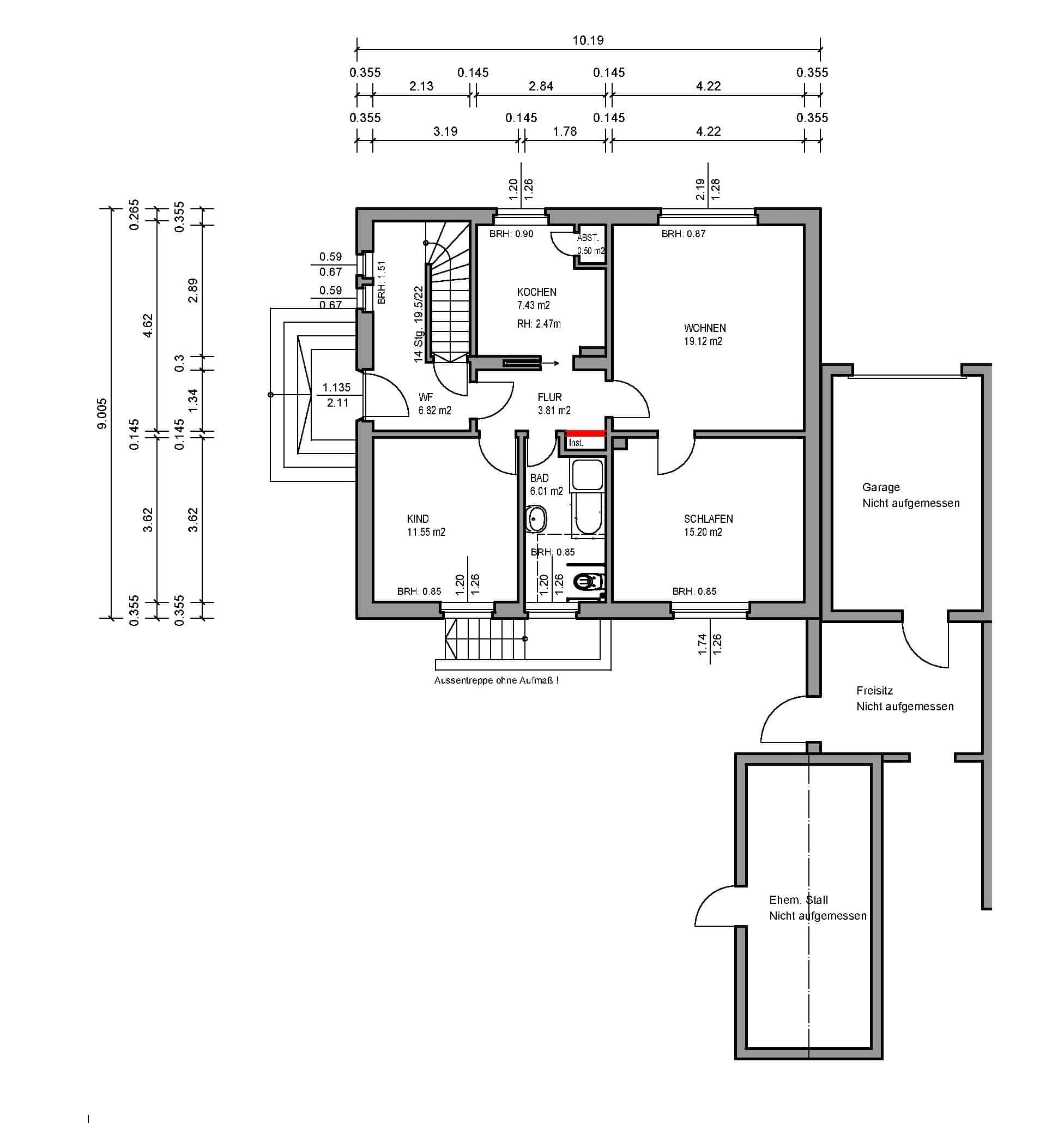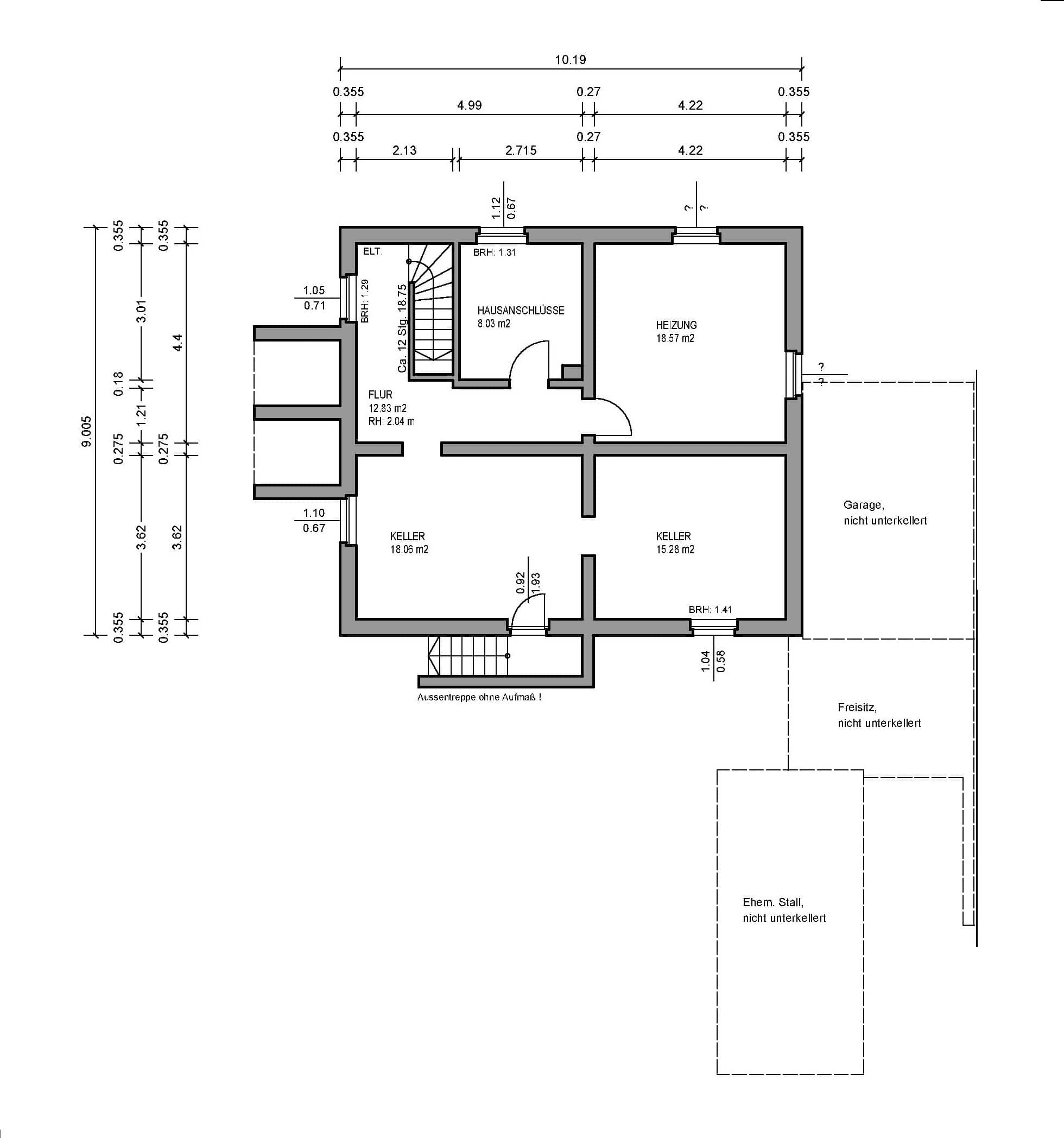 Sanierungsbedürftiger Zustand, massive Bauweise mit Betondecken, Anbau als Geräteschuppen, Garage, Satteldach, Gas-Zentralheizung (Fa. Körting, Baujahr 1997) mit Warmwasserversorgung für das EG, im OG Durchlauferhitzer, Kunststofffenster/Isolierverglasung (1987), Rollläden, Vollkeller