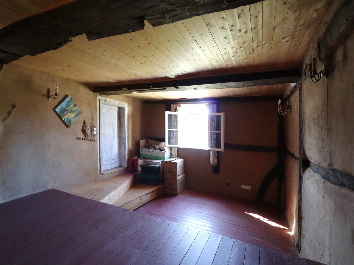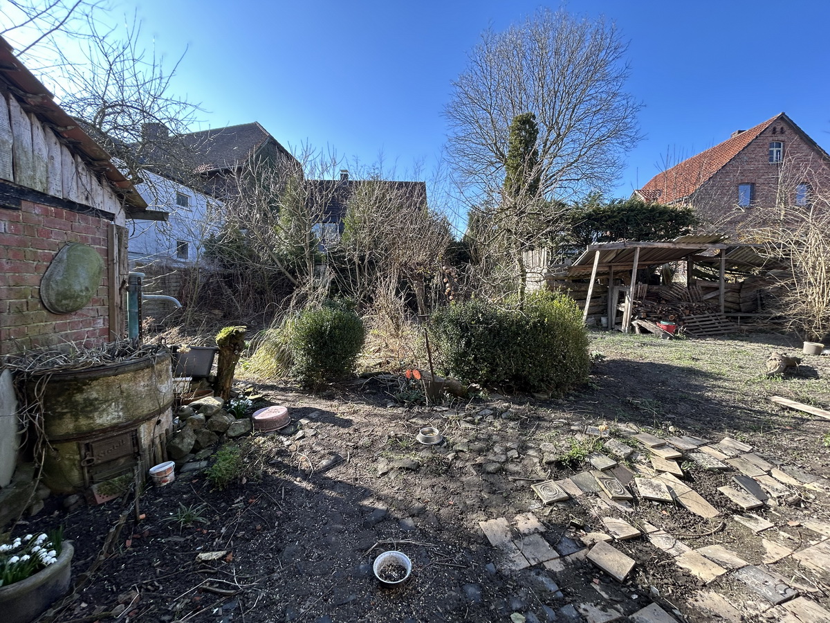Von hier aus gelangt man in die Küche, das Wohnzimmer mit Zugang zum Garten sowie ins Badezimmer mit Dusche und weiter in den Waschraum im Anbau. Ebenfalls von der Deele aus gelangt man über eine Treppe ins obere Geschoss. Dort befinden sich ein Schlafzimmer sowie zwei weitere Räume. Der Dachboden (Heuboden) der Immobilie bietet zusätzliches Potenzial. Die bewohnbare Fläche beträgt derzeit rd. 115 m² zzgl. einer Nutzfläche von rd. 13 m² (Waschraum).