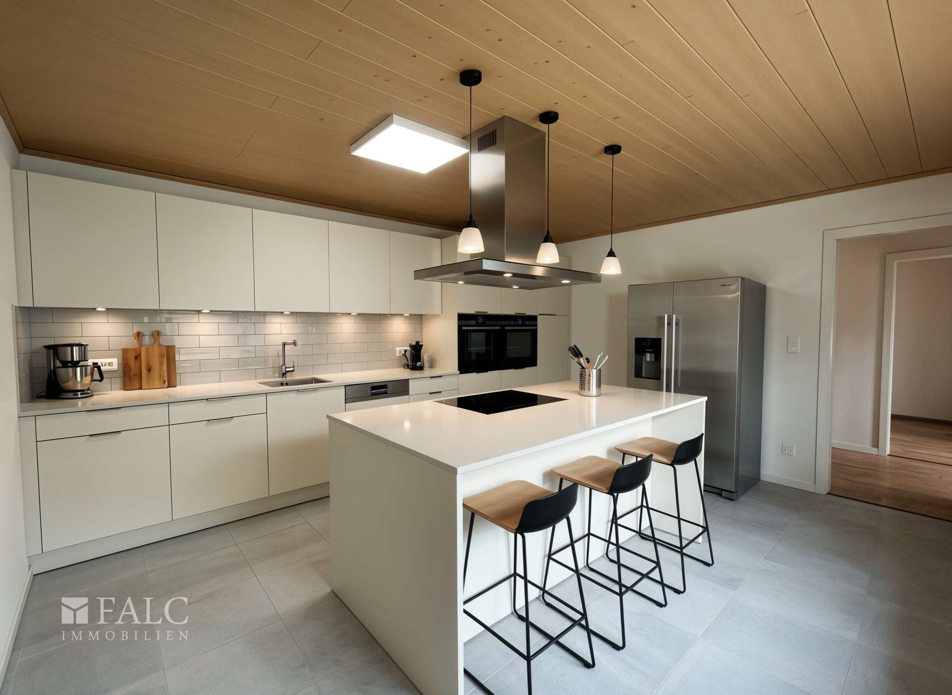 Die Küche im Erdgeschoss ist separat gehalten und funktional geschnitten. Hier ist Raum für eine klassische Küchenzeile und zusätzliche Schränke. Ein Badezimmer im Erdgeschoss ergänzt die Ebene praktisch, etwa für den schnellen Start in den Tag oder für Gäste.