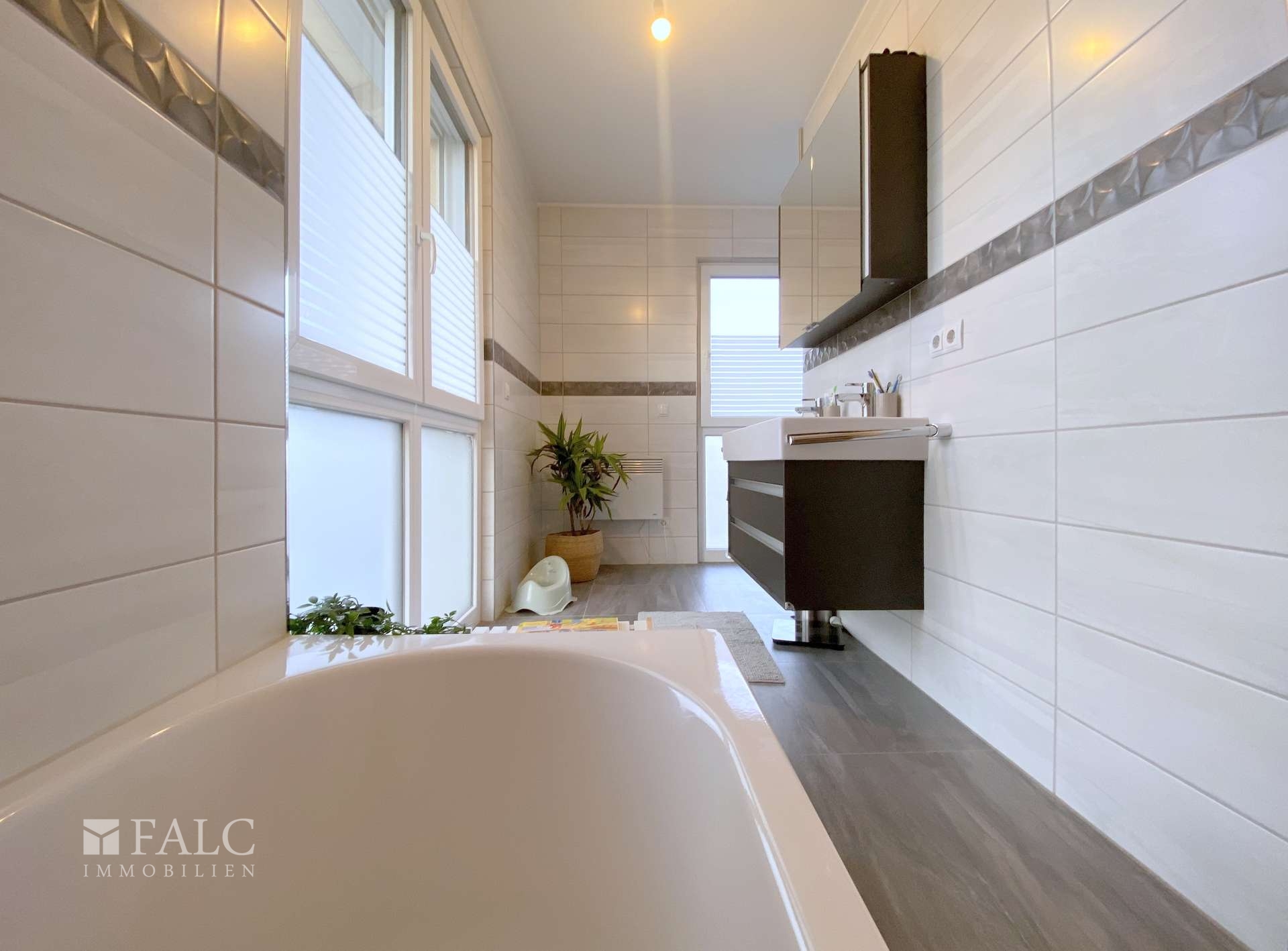 Im Erdgeschoss ist der gesamte Wohnbereich gefliest, was für eine pflegeleichte und langlebige Oberfläche sorgt. Im Obergeschoss wurde Laminatboden verlegt, der den Räumen eine warme und wohnliche Atmosphäre verleiht. Das Badezimmer ist zeitlos, deckenhoch gefliest und mit einer Badewanne sowie einer ebenerdigen gefliesten Dusche ausgestattet. Ebenso ist das Bad mit hochwertigen Möbeln ausgestattet, wie einem Spiegelschrank und einem Untertischschrank. Zusätzlich steht ein separates Gäste-WC zur Verfügung.