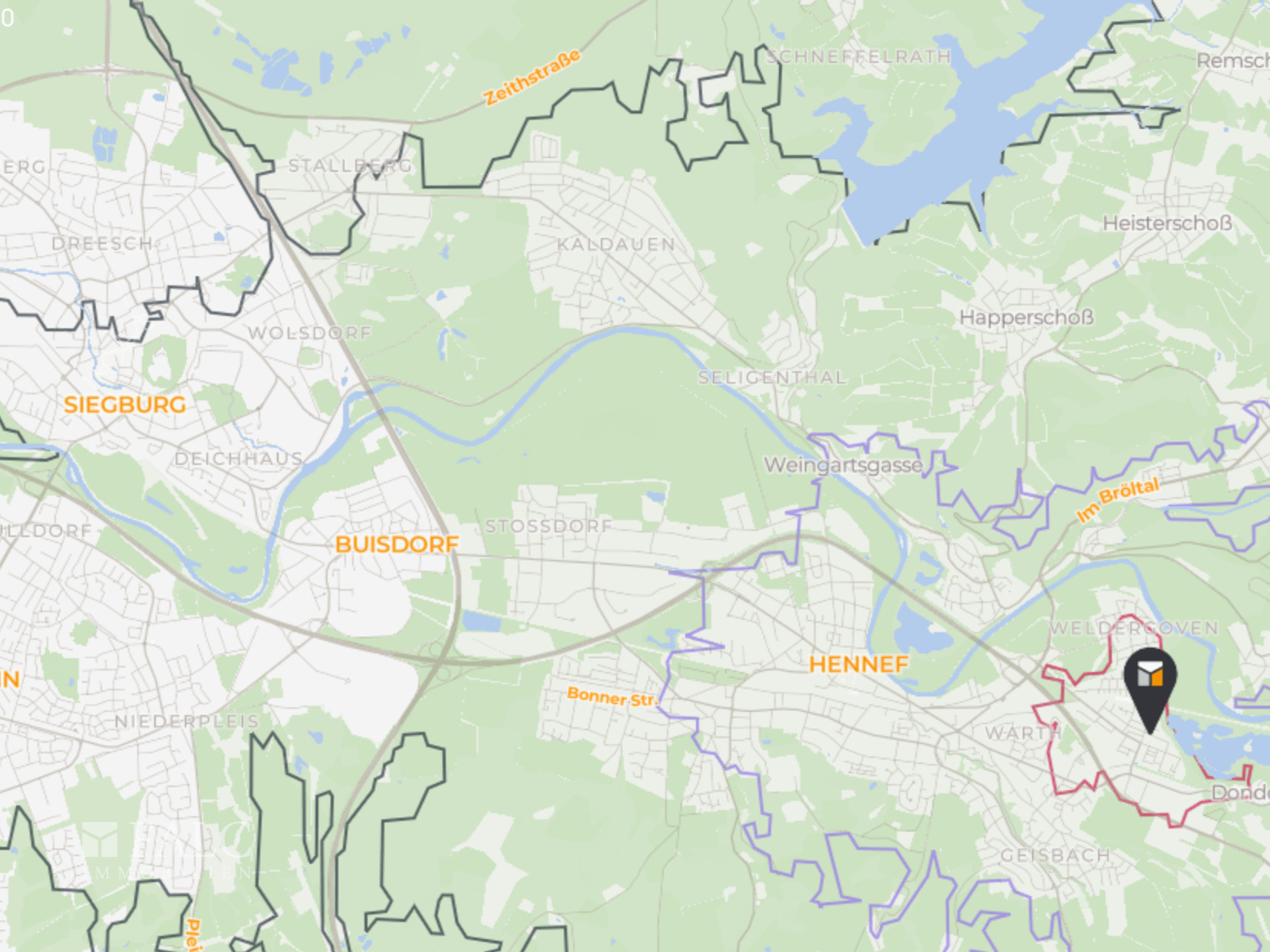 Die Anbindung an den öffentlichen Nahverkehr ist hervorragend. Die nächste S-Bahn-Station ist nur wenige Gehminuten entfernt, was Pendlern und Reisenden eine bequeme Verbindung in die umliegenden Städte bietet. Zudem ist der Flughafen Köln/Bonn in ca. 25 km Entfernung gut erreichbar, was die Lage auch für Reisende attraktiv macht.