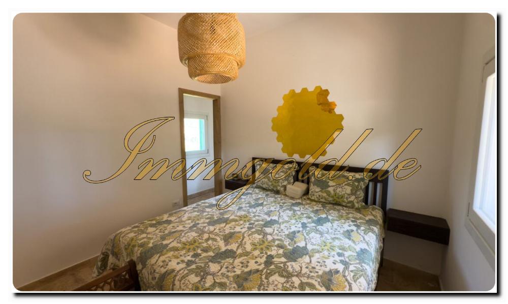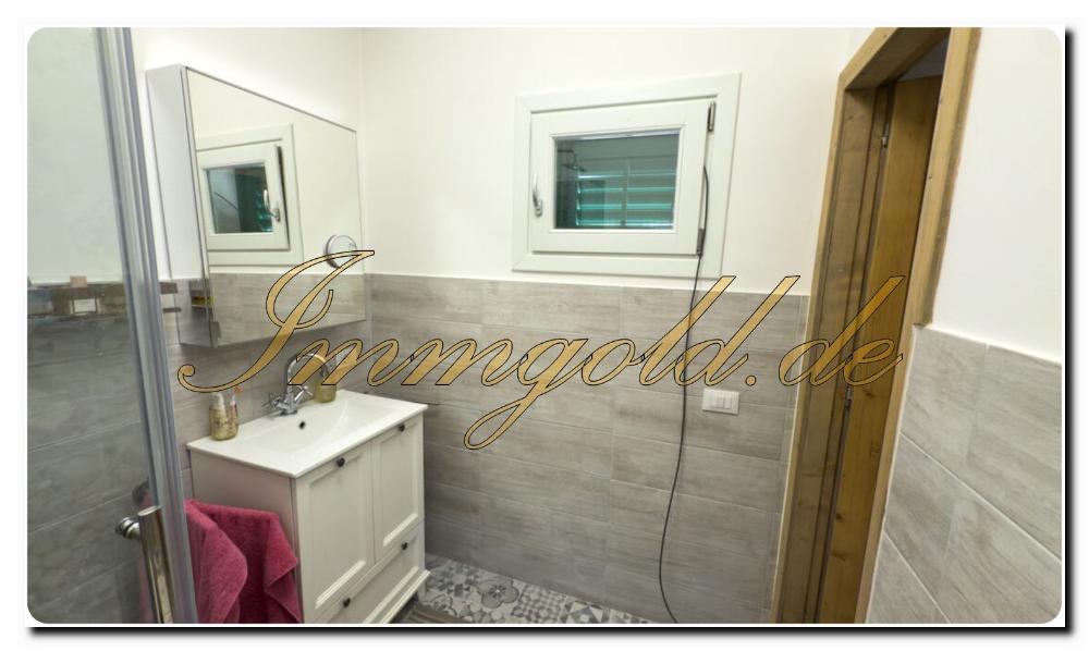 Das Schlafzimmer ist kompakt und verfügt über einen kleinen begehbaren Kleiderschrank in der hinteren Ecke. Die Verkäufer sind bereit, das bequeme Doppelbett aus Holz mit zu verkaufen, und mehr Möbel braucht man in diesem gemütlichen Raum auch nicht. Am Ende des Flurs befindet sich das gepflegte Badezimmer, das modern ist, aber mit der monochromen Majolika-Fliesenoptik der Duschkabine an die sizilianische Tradition anknüpft.