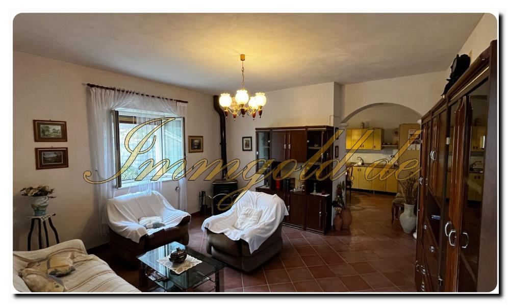Wenn Sie durch den Haupteingang an der Seite eintreten, werden Sie von einem gemütlichen Wohnzimmer mit traditionellem sizilianischem Terrakottaboden, Einbauschränken und einem Holzofen begrüßt, der an kälteren Winterabenden eine willkommene Ergänzung sein wird. Die angrenzende Küche ist geräumig und durchdacht gestaltet, mit honigfarbenen Schränken im Landhausstil, reichlich Arbeitsfläche und einem Esstisch mit Stühlen in der Mitte.