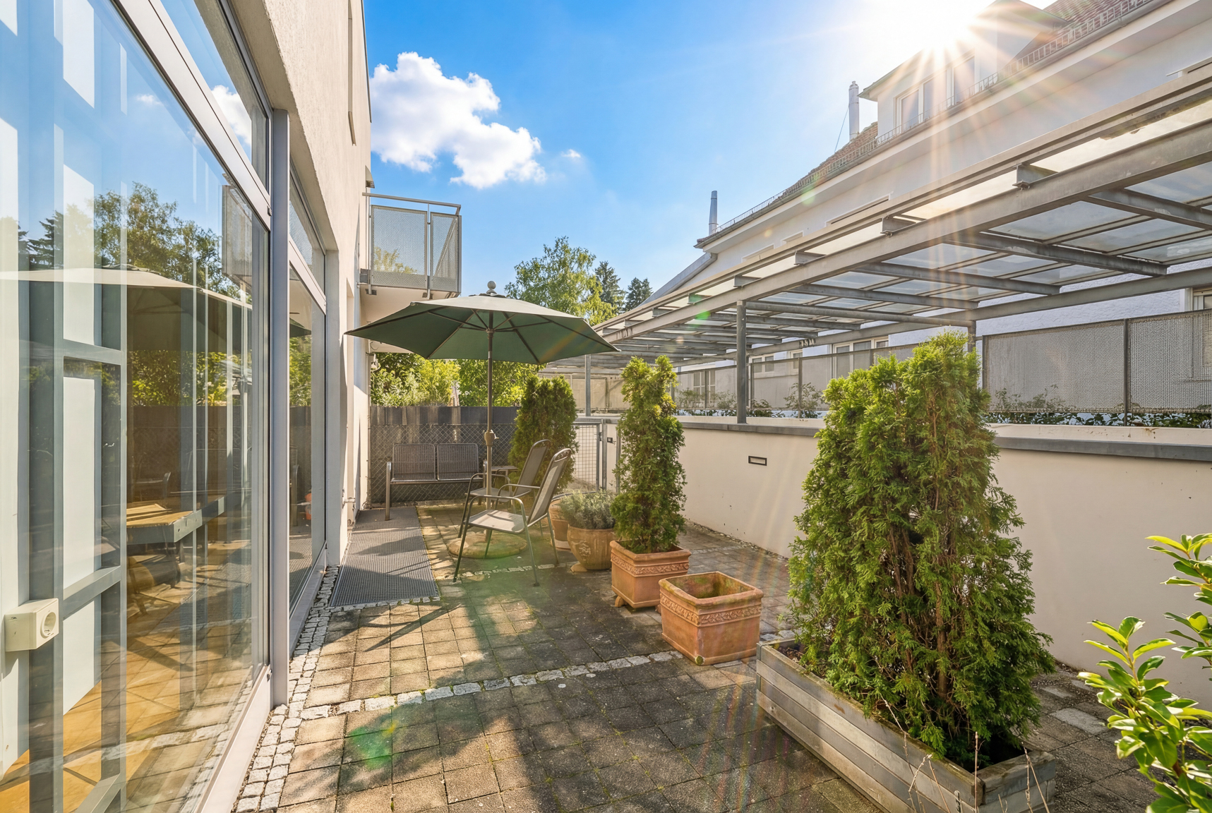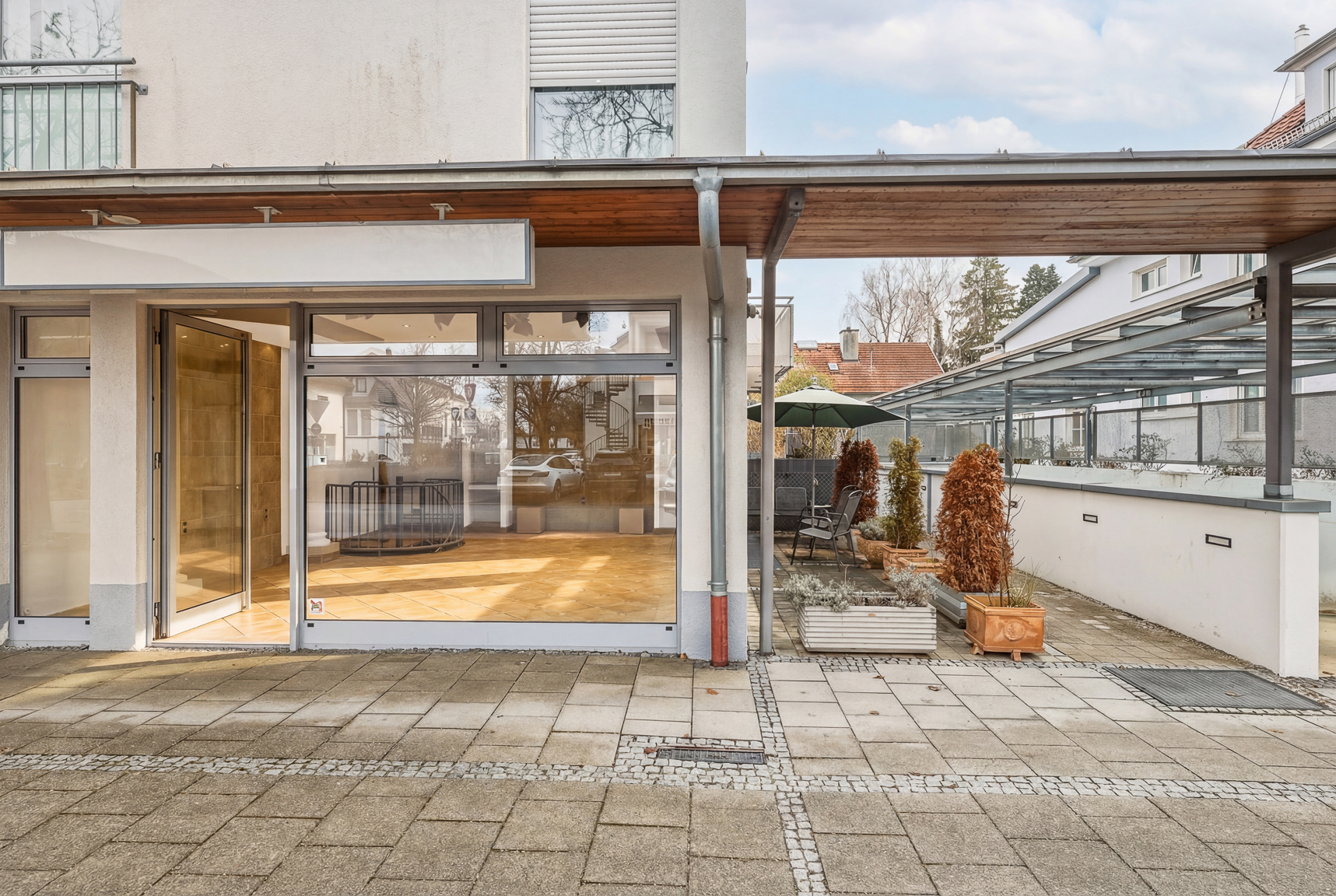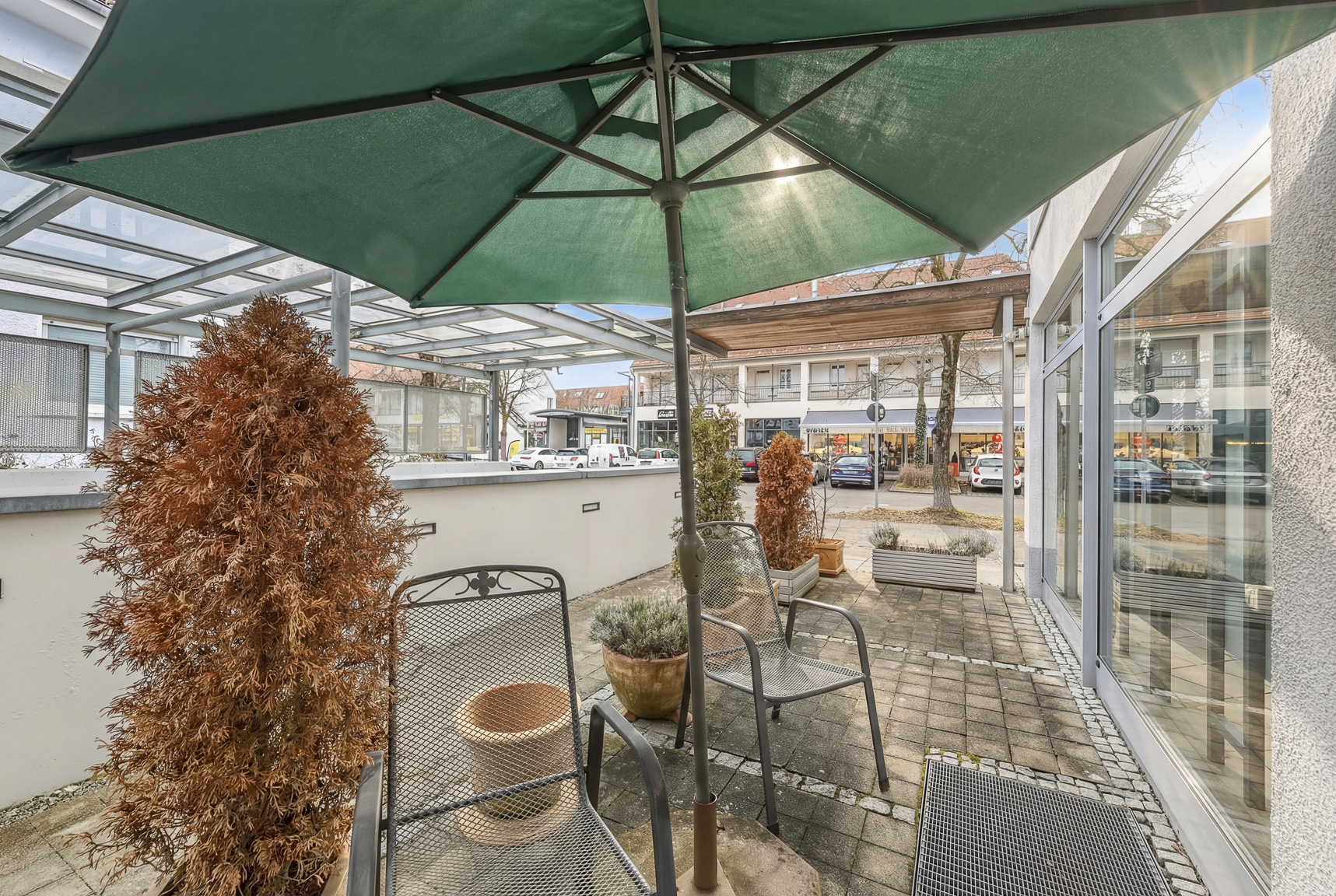 Ein besonderes Plus ist die seitlich gelegene, nach Süden ausgerichtete Außenterrasse mit ca. 15 m², die zusätzlichen Mehrwert für Kunden oder Mitarbeiter bietet.
