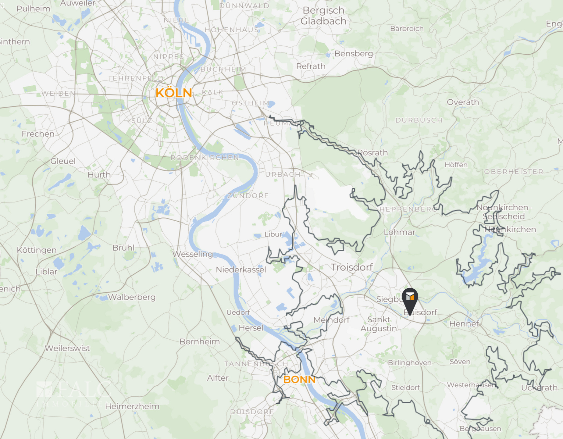 Der öffentliche Nahverkehr ist ebenfalls gut erschlossen, mit einer Anbindung in ca. 1 km Entfernung. Dies erleichtert nicht nur den täglichen Arbeitsweg für Mitarbeiter, sondern auch den Zugang für Kunden und Geschäftspartner. Die Nähe zum Flughafen Köln/Bonn, der in ca. 20 km erreichbar ist, bietet zudem eine ausgezeichnete Anbindung für nationale und internationale Geschäftsreisen.