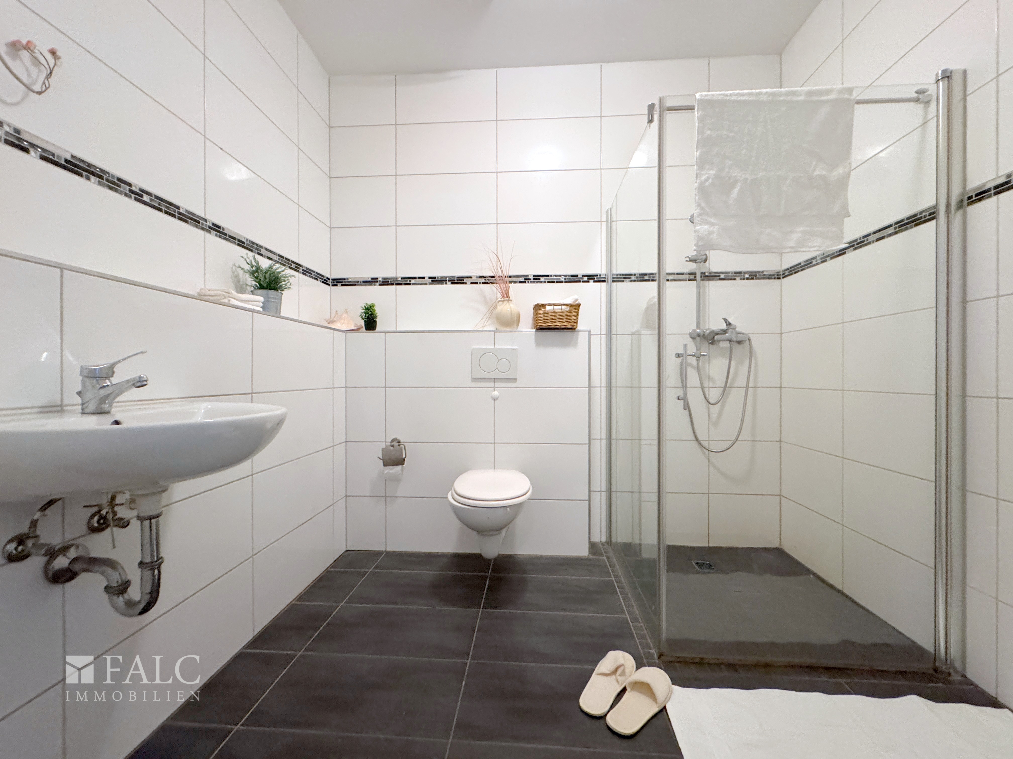 Das Badezimmer ist modern, stilvoll und funktional gestaltet. Es verfügt über eine großzügige, ebenerdige Dusche und ist bis zur Decke gefliest. Dadurch wirkt der Raum nicht nur modern, sondern ist auch besonders pflegeleicht.