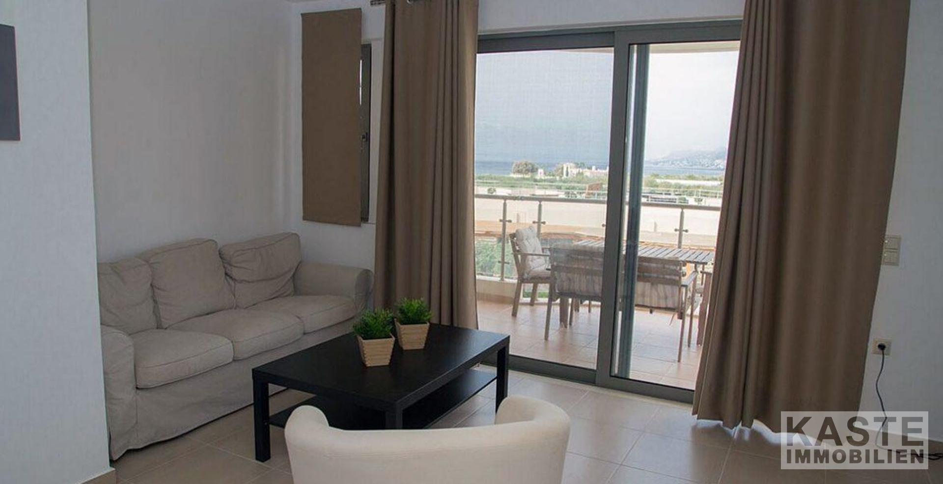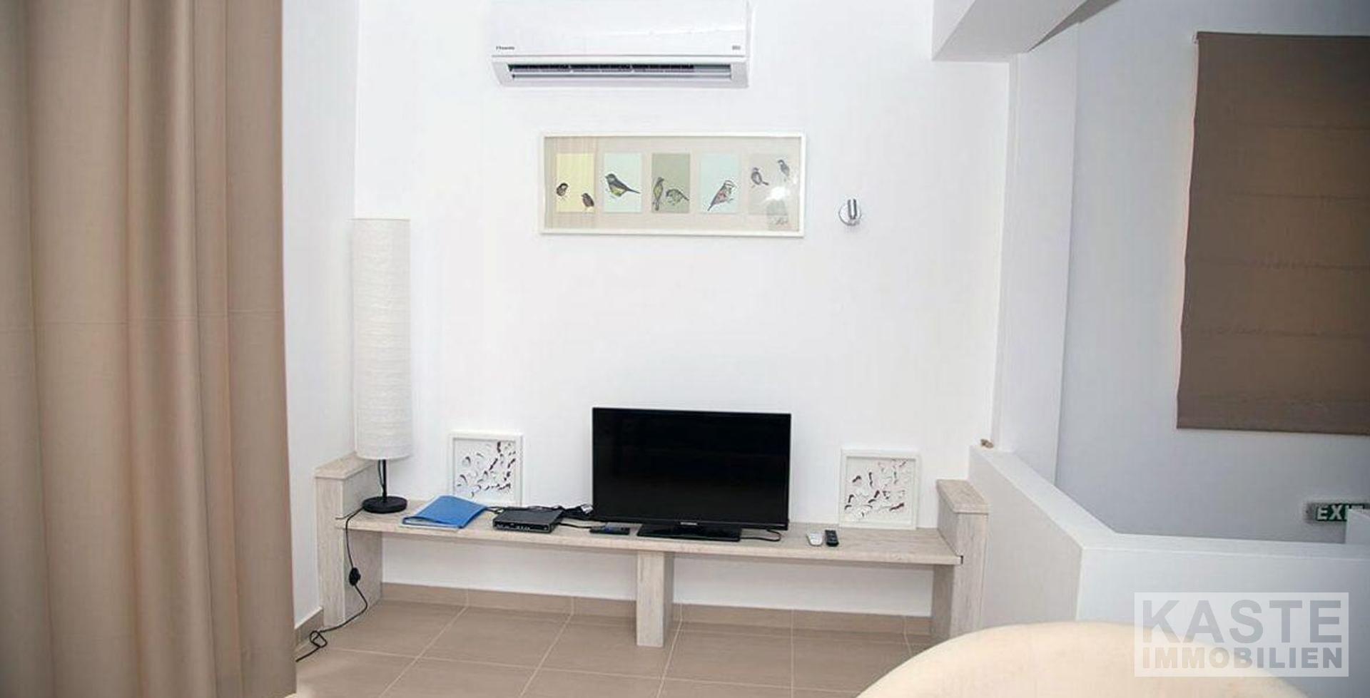Das Haus ist geschmackvoll eingerichtet und umfasst zwei komfortable Schlafzimmer mit geräumigen Einbauschränken sowie stilvolle Badezimmer. Die moderne, voll ausgestattete Küche verfügt über alle Annehmlichkeiten, die Sie benötigen, darunter einen Backofen, Kühlschrank und Geschirrspüler. Sie öffnet sich zu einem großzügigen offenen Wohnbereich mit raumhohen Terrassentüren, die auf einen Balkon führen. Von hier aus können Sie den idyllischen Blick auf den Pool, die majestätischen Berge und das glitzernde Meer genießen.