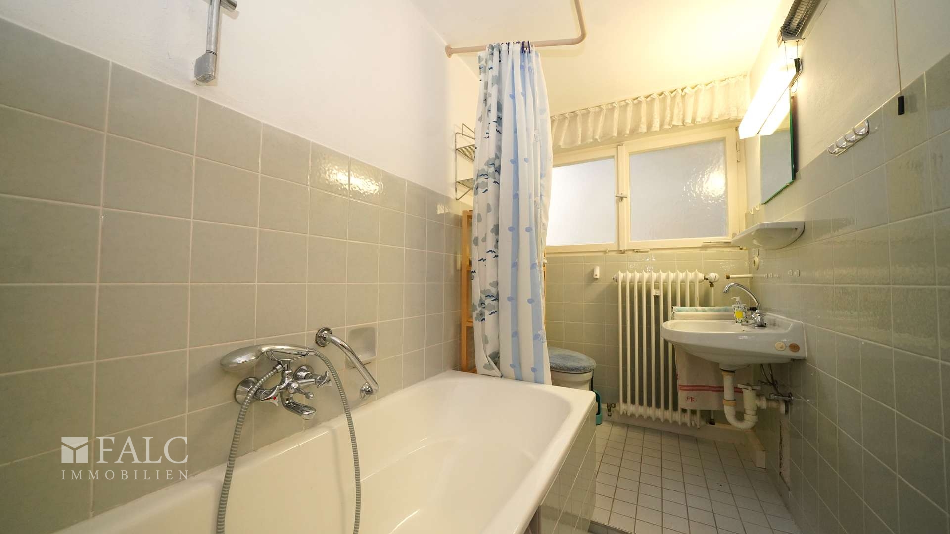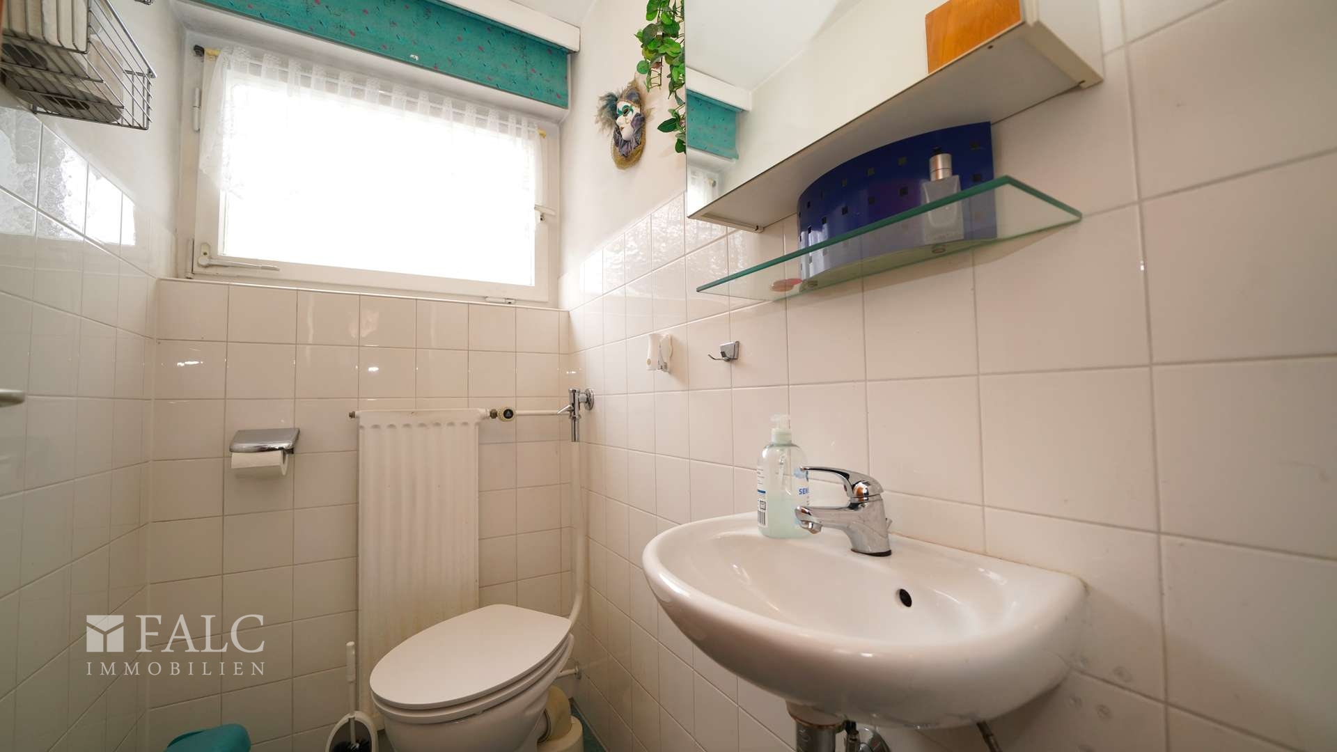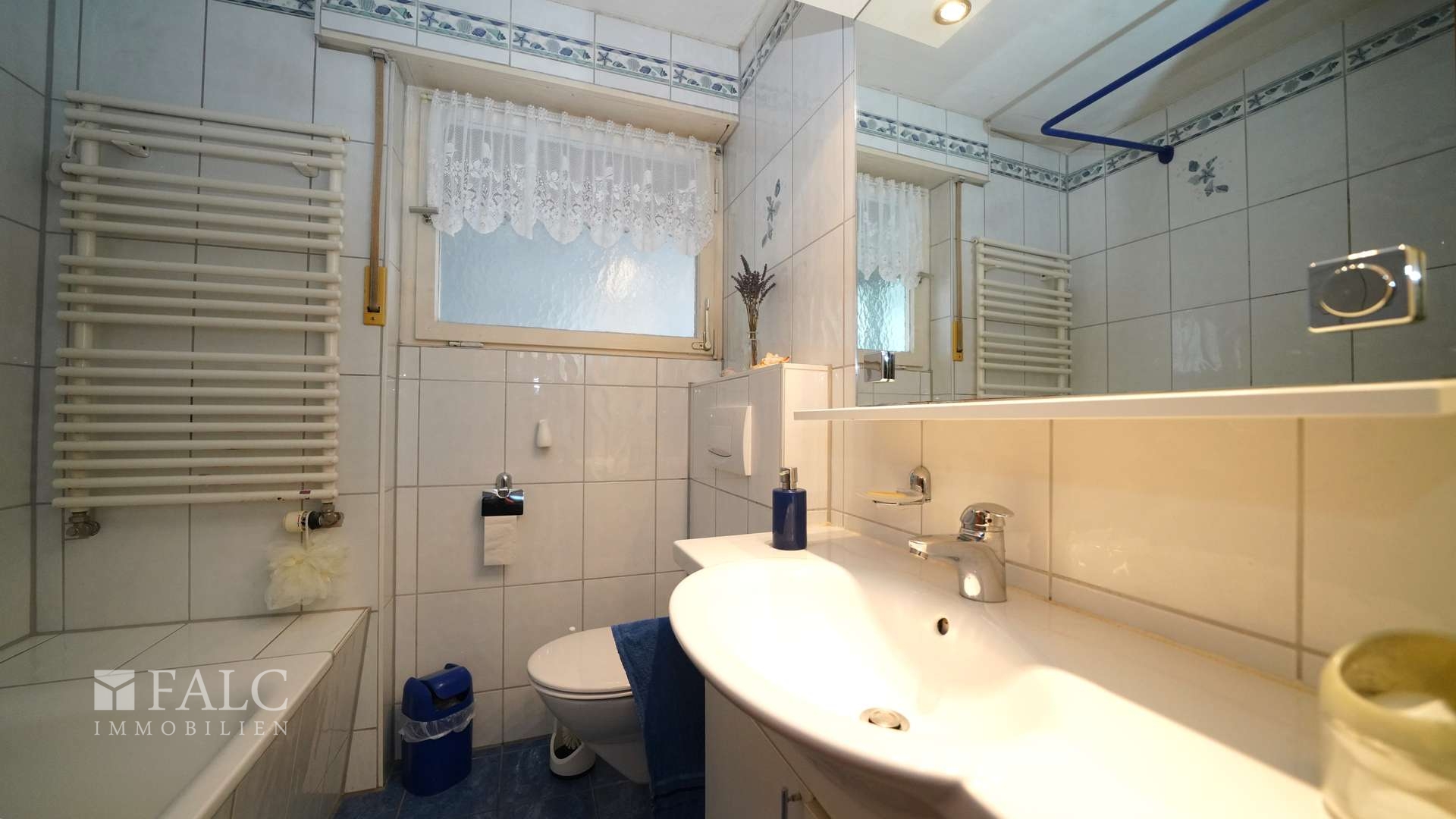 Das Tageslichtbad strahlt in weiß mit blauen Akzenten, freuen Sie sich über eine Wanne, ein WC und einen Waschtisch mit Ablage für Flakons und sonstige Kosmetika. Das Handtuch wärmt am dafür vorgesehenen Wandheizkörper vor.