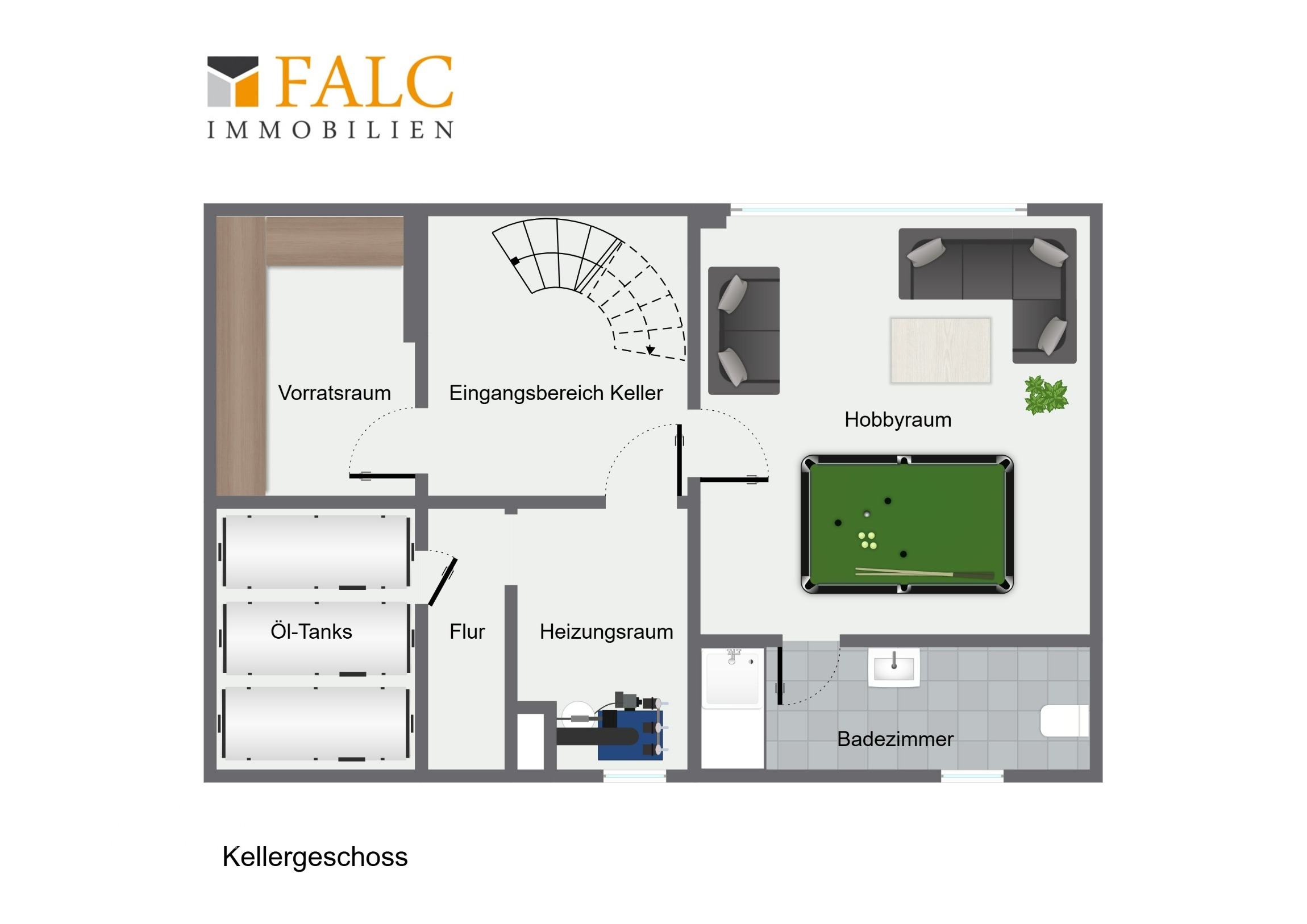Im Kellergeschoss stehen Ihnen zusätzlich zu üblichen Nutzräumen wie Technikraum und Heizungsraum auch ein großflächiger Hobbyraum zur Verfügung.