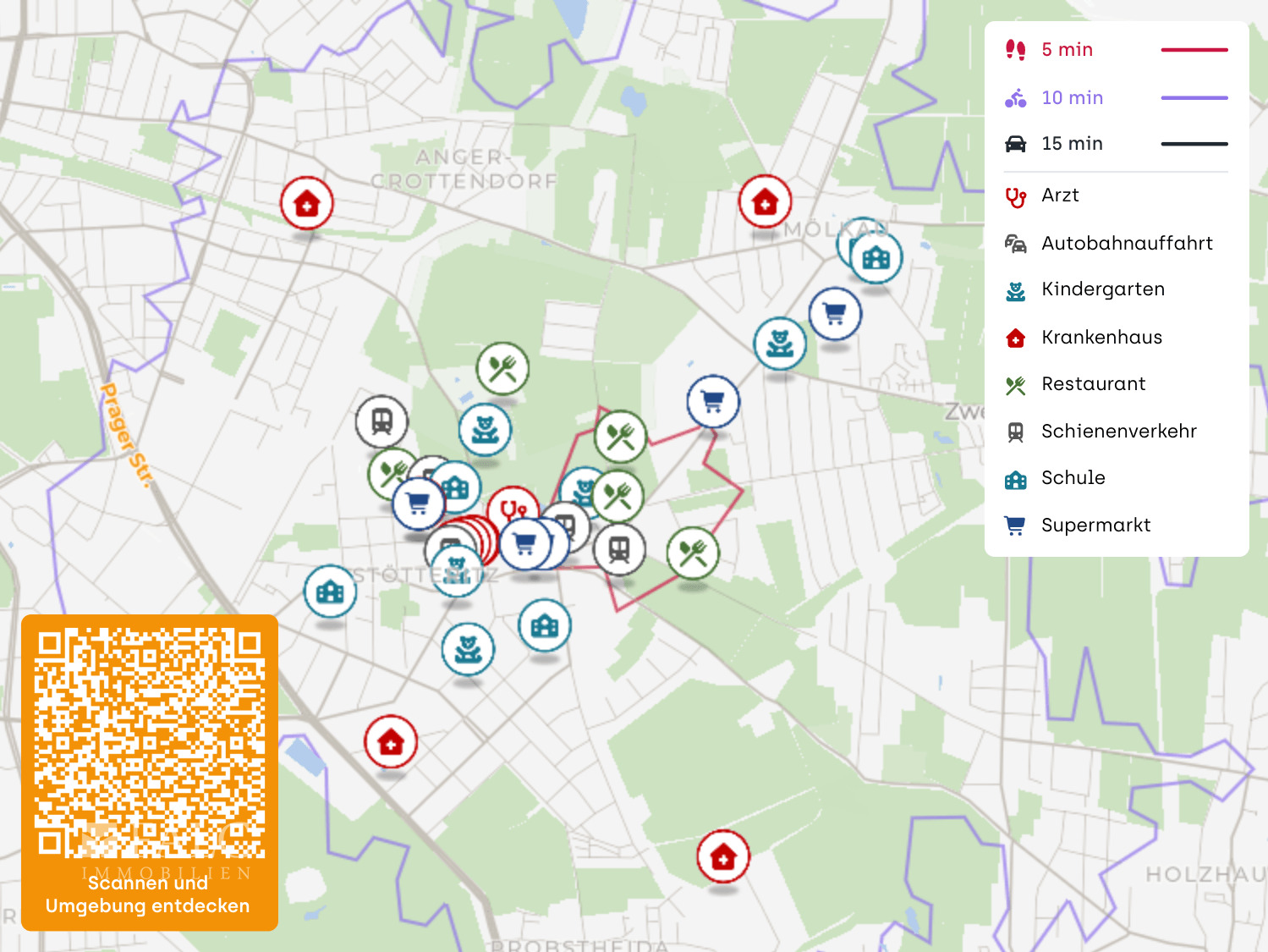 Die Anbindung an den öffentlichen Nahverkehr ist ein klarer Pluspunkt. Eine Bushaltestelle an der Oberdorfstraße liegt praktisch um die Ecke, die Tram ist an der Haltestelle Stötteritz Holzhäuser Straße ebenfalls schnell erreichbar. Für weitere Verbindungen in der Region bieten sich die Bahnstationen Leipzig Stötteritz und Leipzig Anger Crottendorf an.