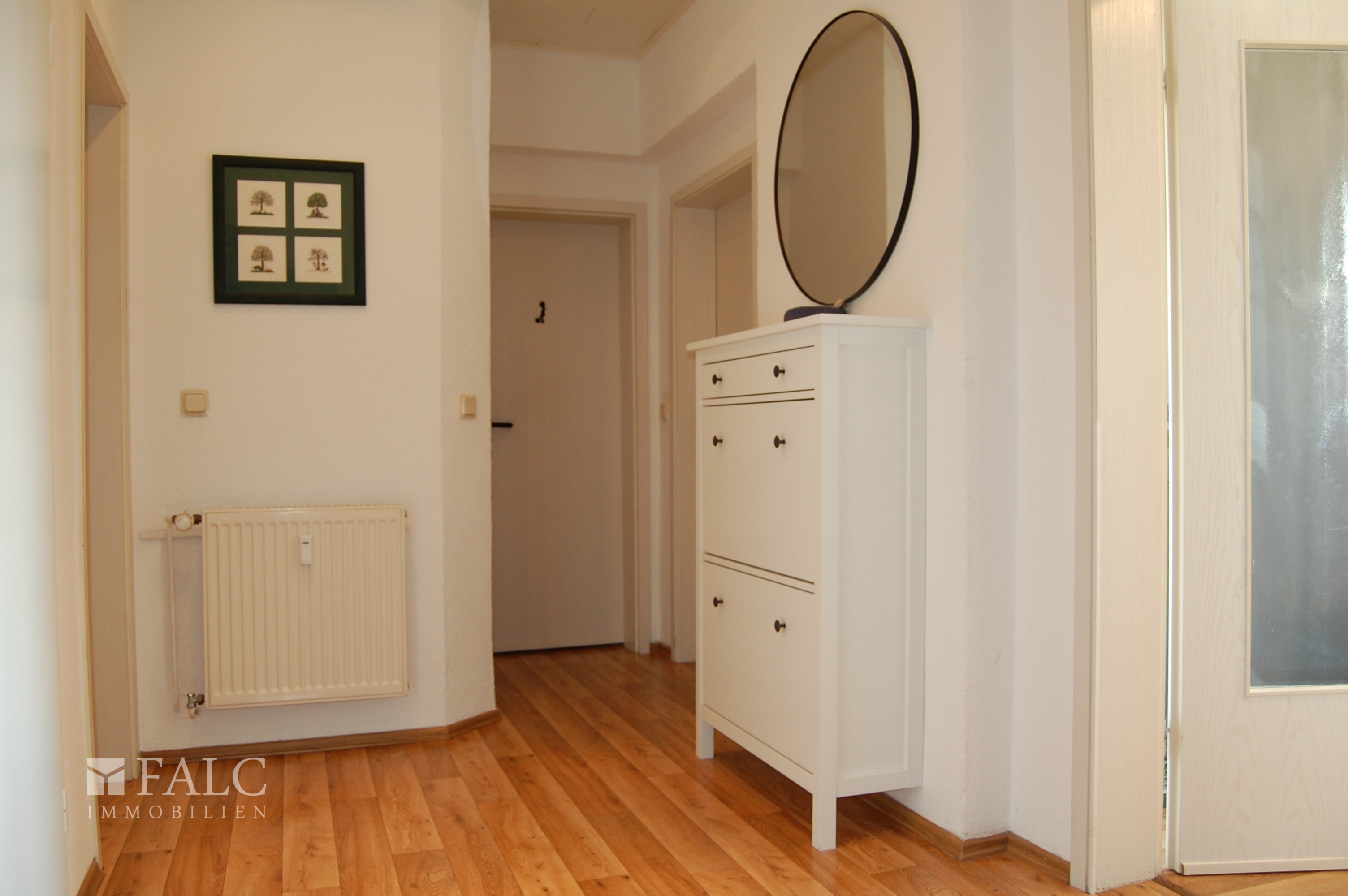 In die Wohnung im 1. Obergeschoss gelangen Sie durch das zentrale Treppenhaus. Sobald Sie die Wohnung betreten, befinden Sie sich im Flur, von welchem Sie in alle Räume gelangen. Der Flur bietet Ihnen genügend Platz für eine Garderobe.